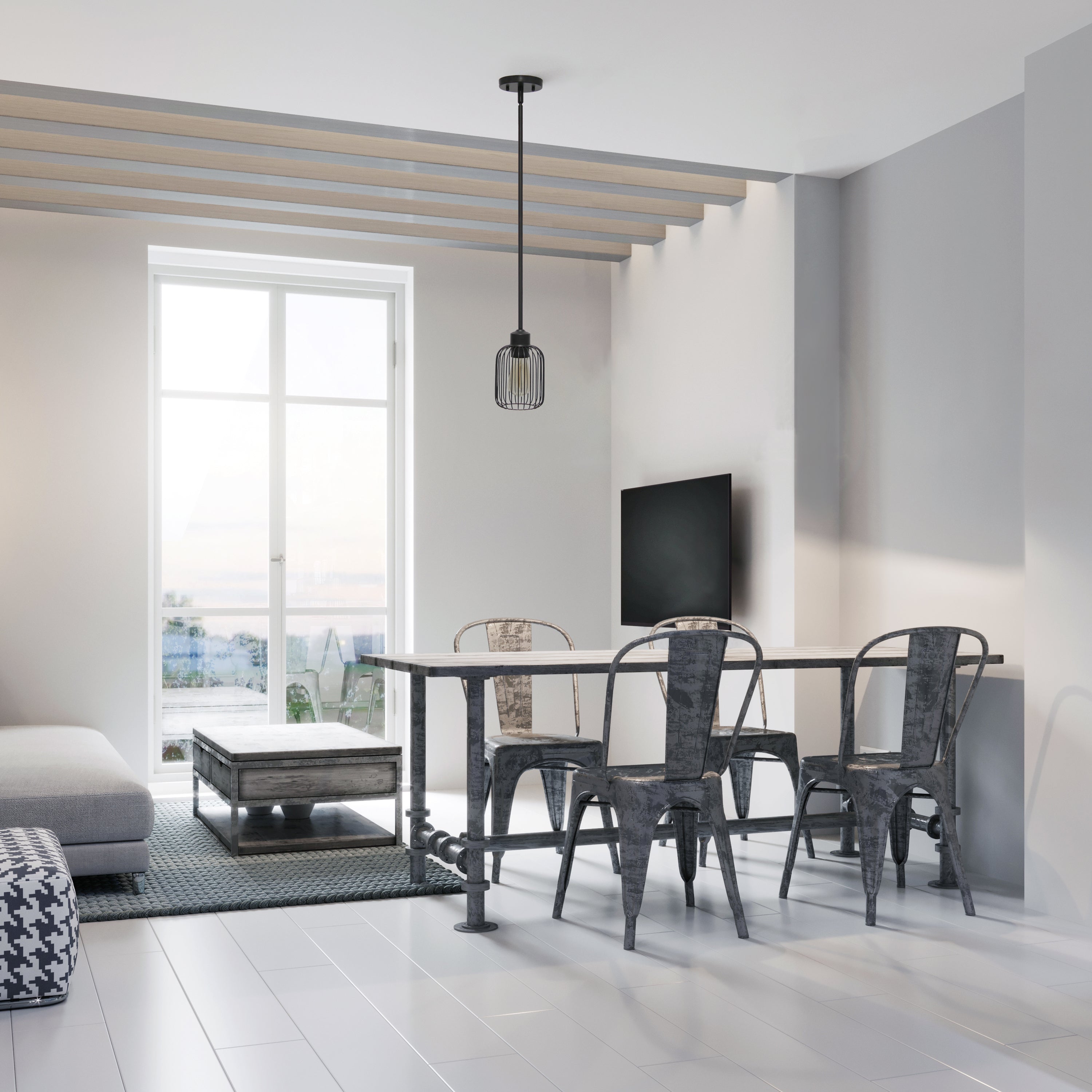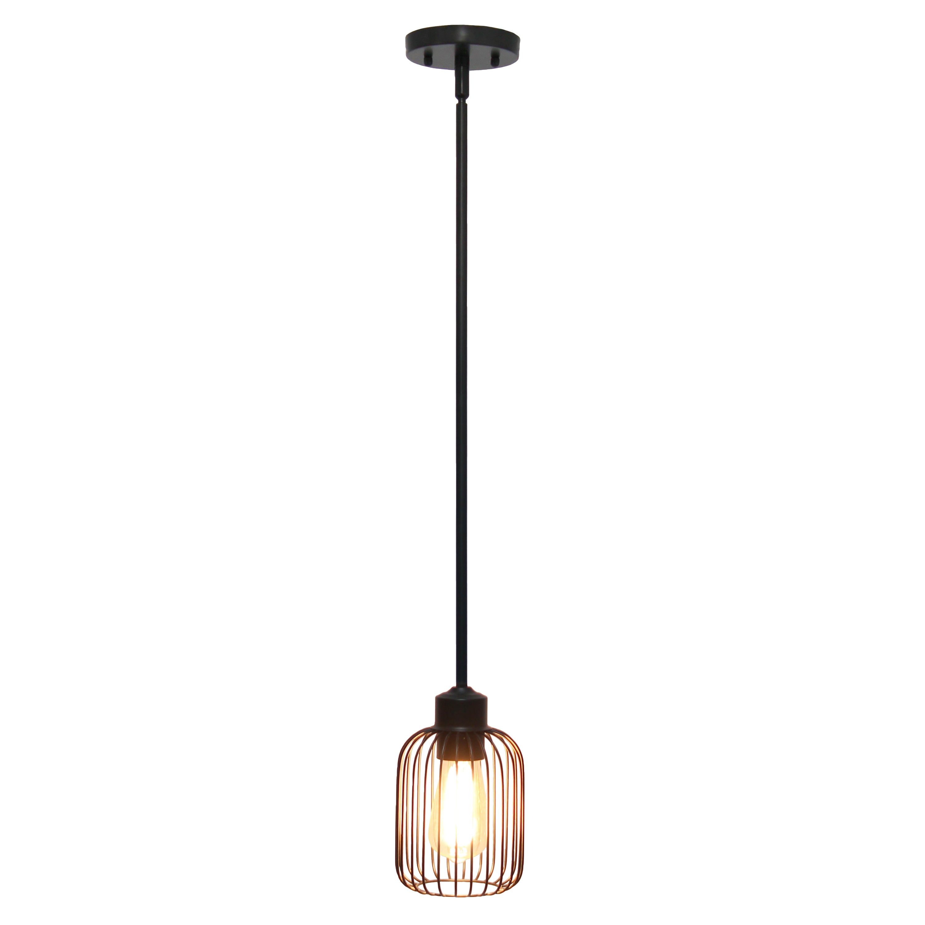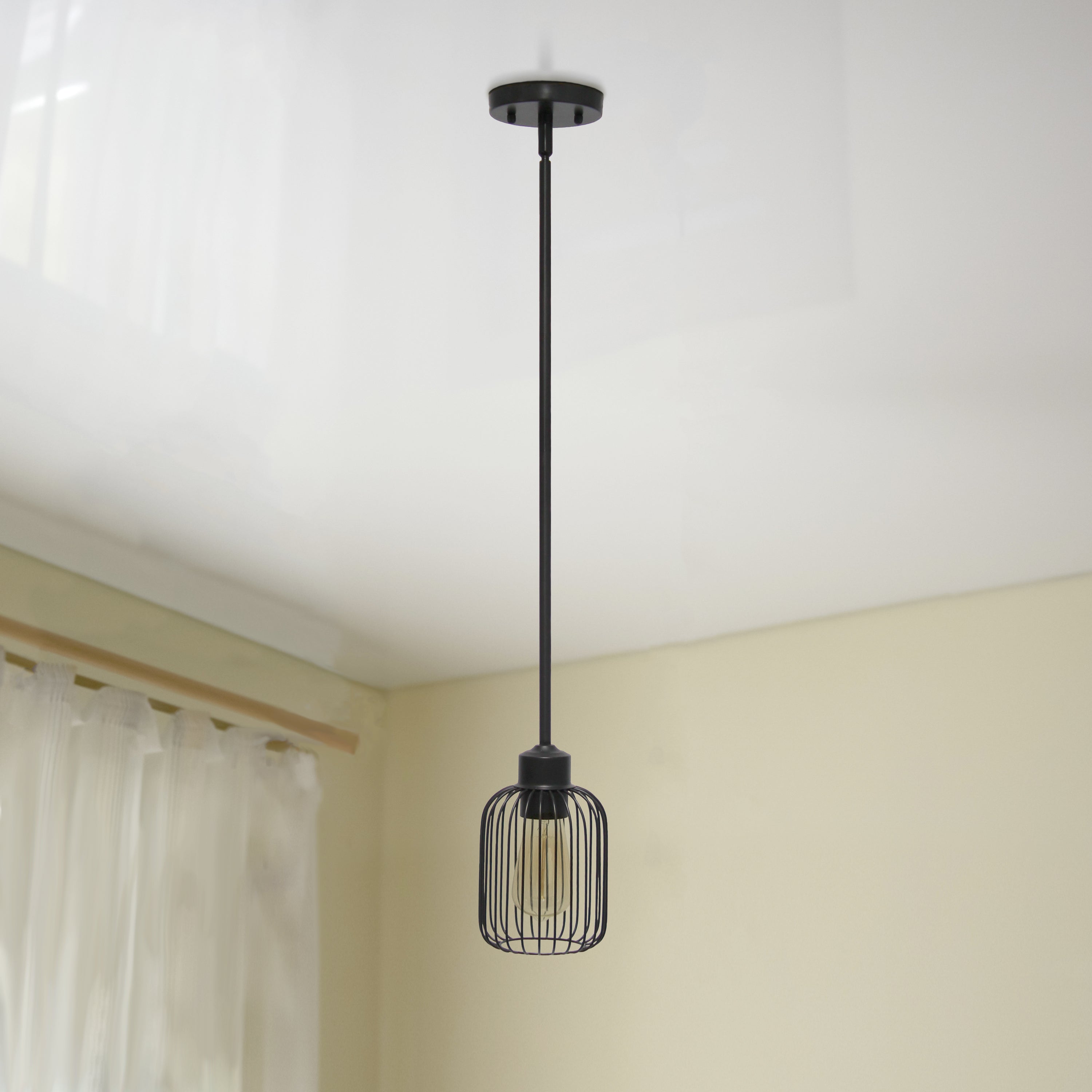 This industrial styled 1 light mini pendant is designed to complement most decor types, while illuminating your space in style. This cage like fixture in all black brings an industrial influence mixed with a bit of a farmhouse style that allows ample amount of lighting to extend into your space. This lamp is ideal for hallways, entryways, bedrooms, and kitchens!