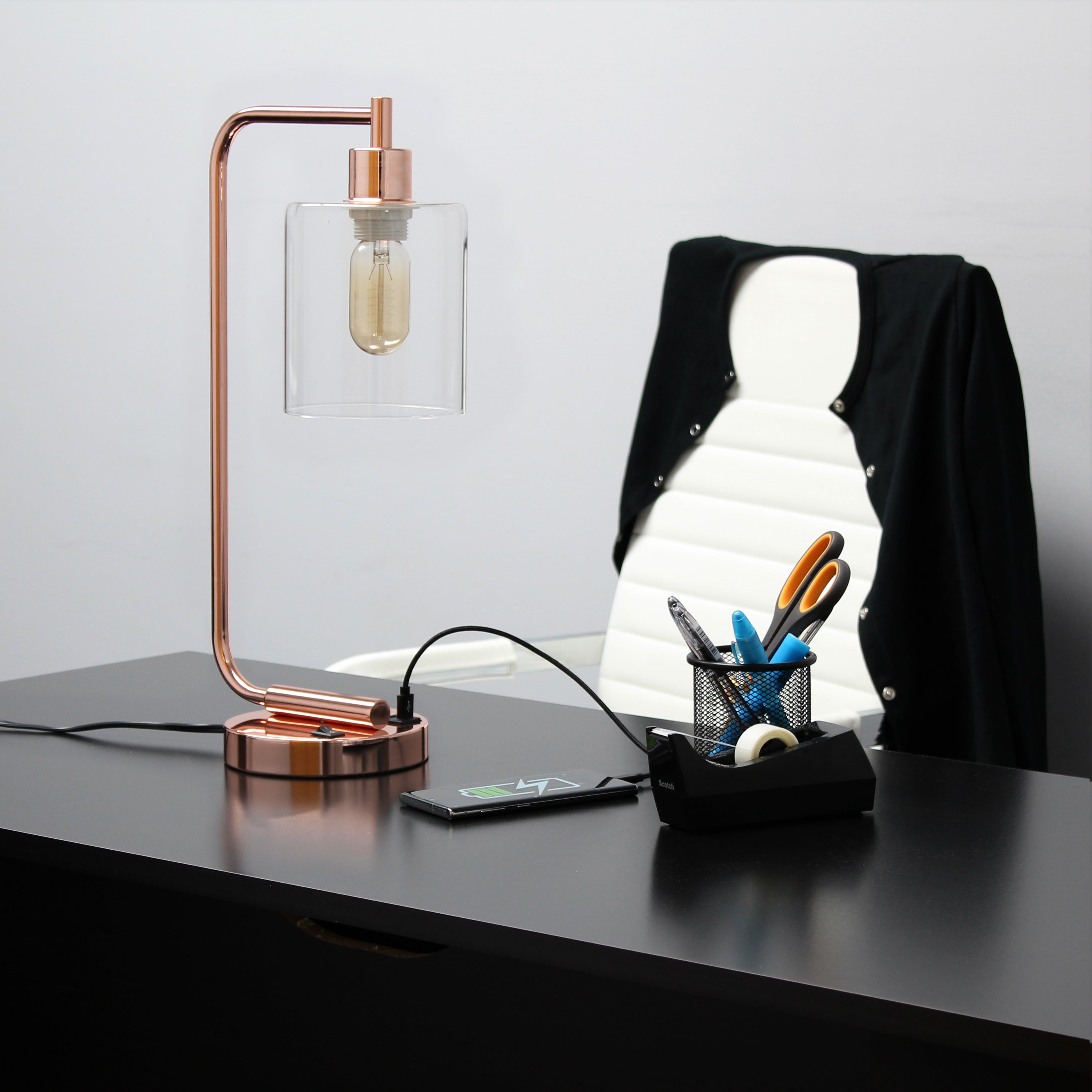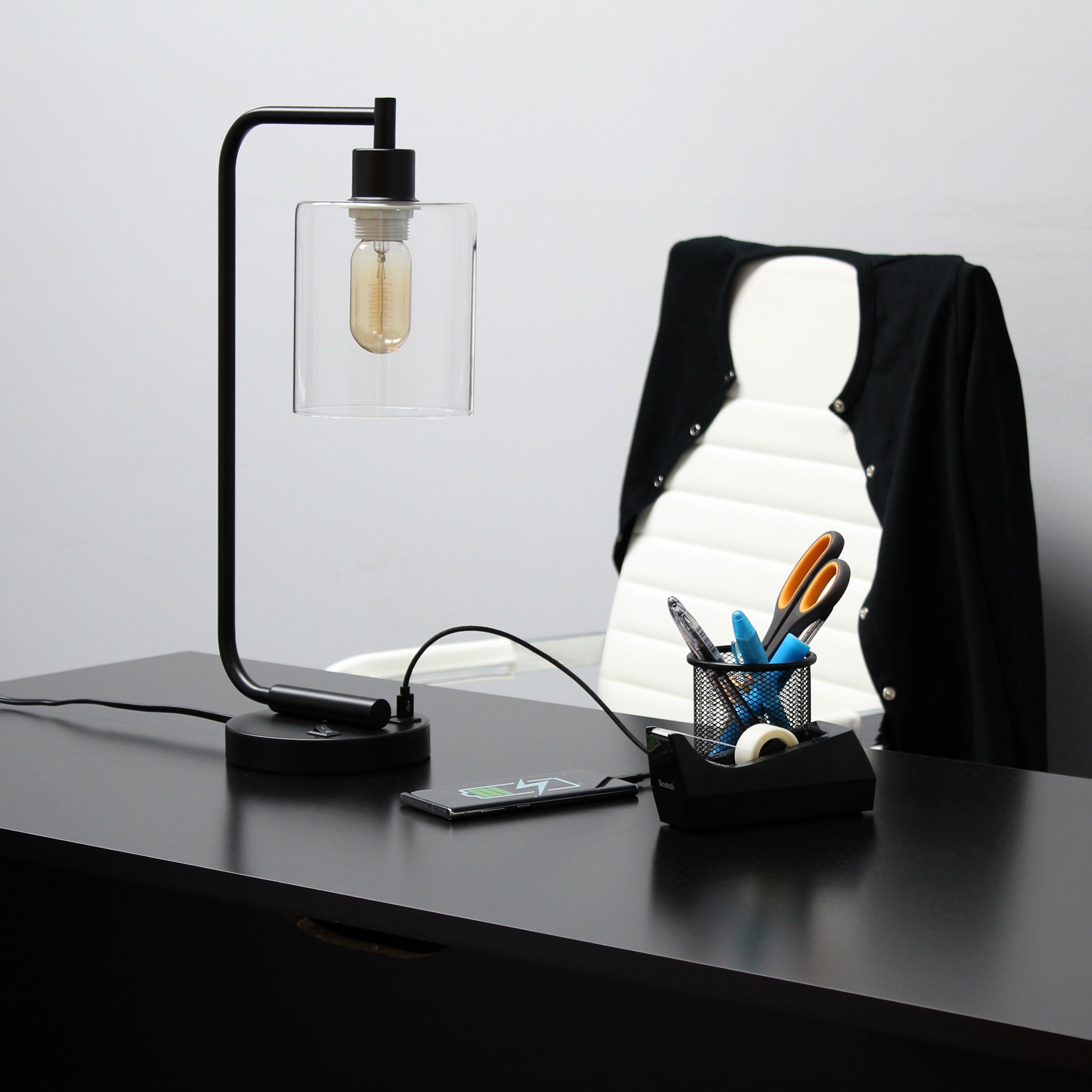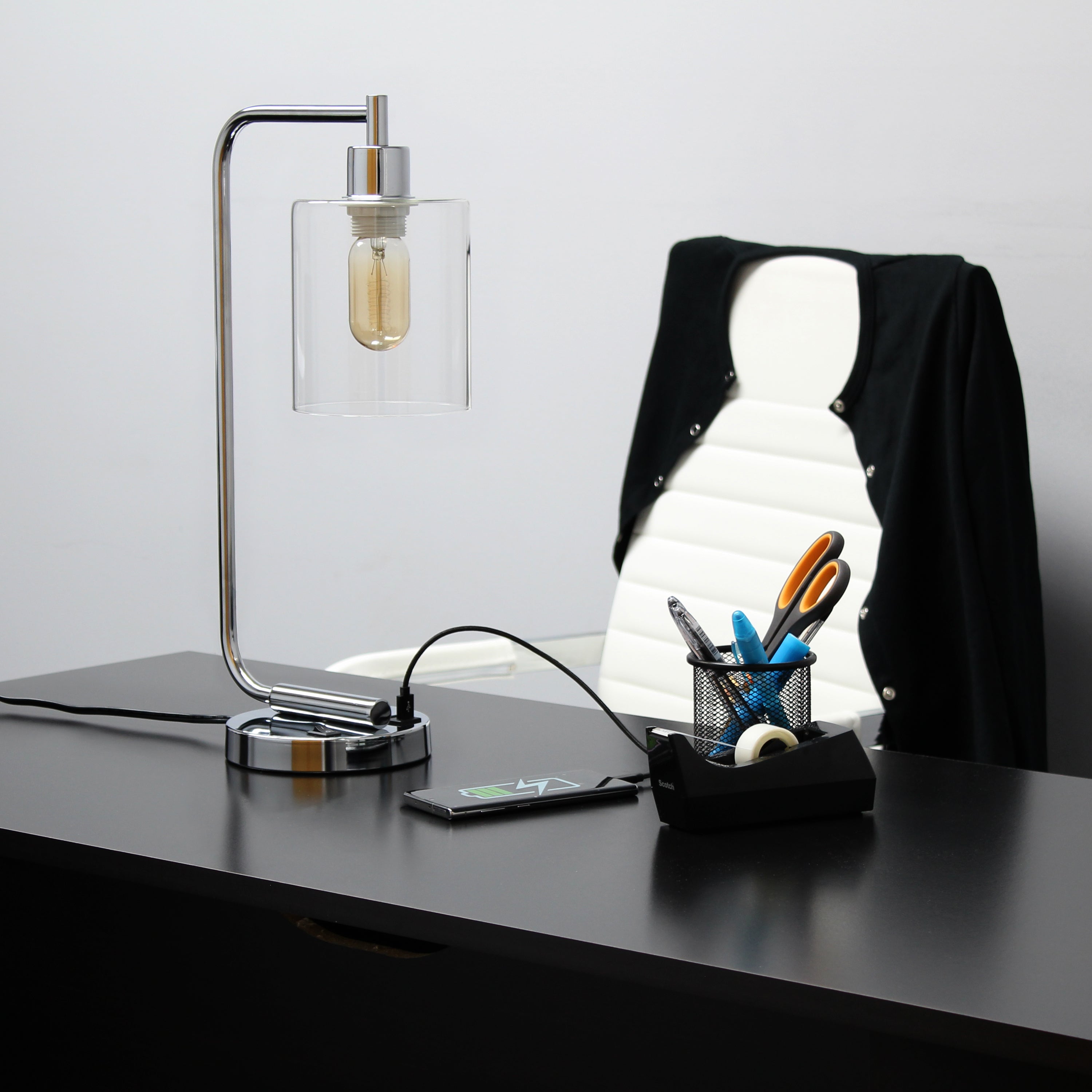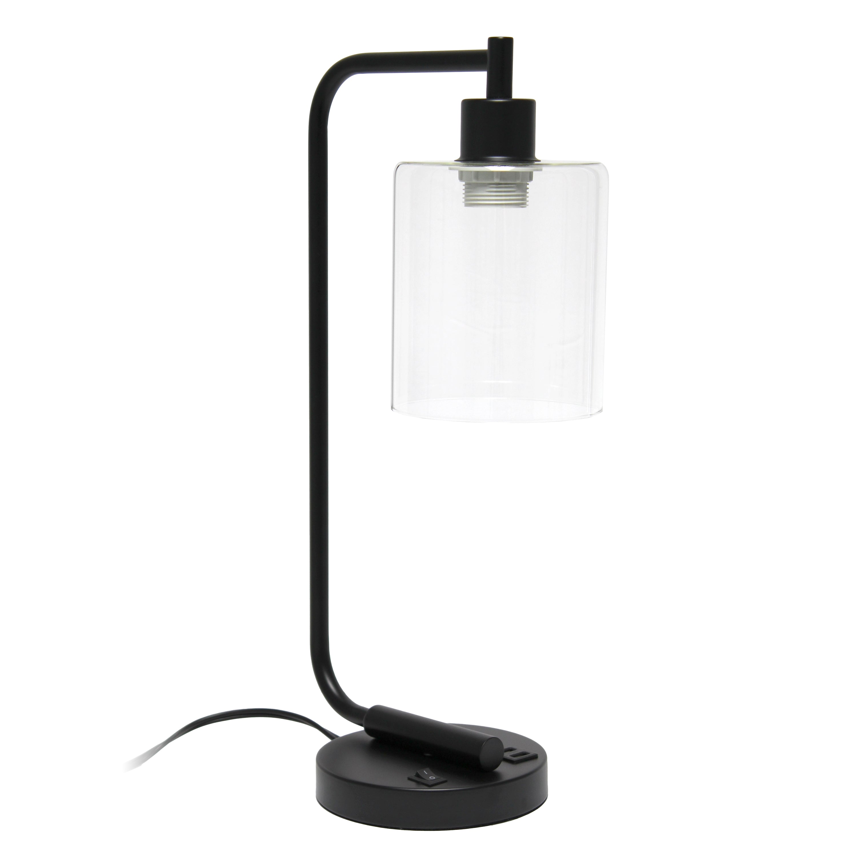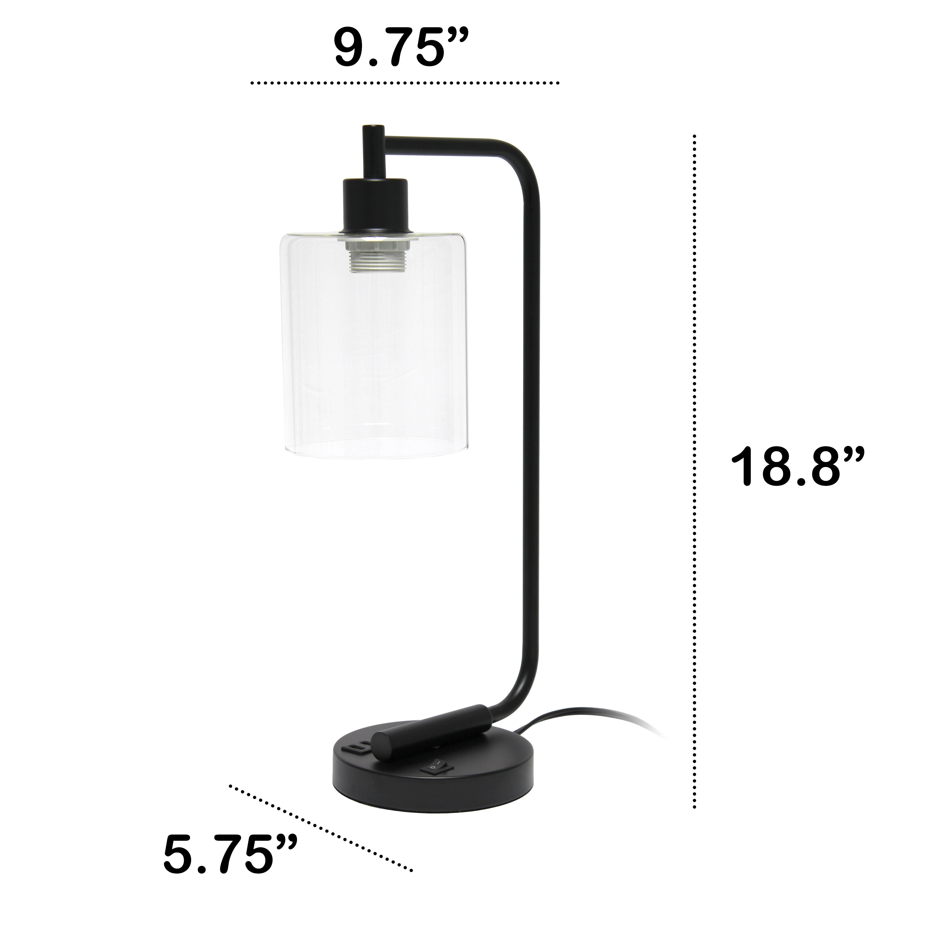 Simple yet modern, this desk lamp is sure to add a touch of style to any room in your home. This beautifully crafted iron desk lamp combines a simple base with a curved arm, (2) USB ports, and a clear cylinder glass shade for a sleek and sophisticated combination. Perfect for your desk, foyer or bedside table for a modest, refined look in trendy lighting.