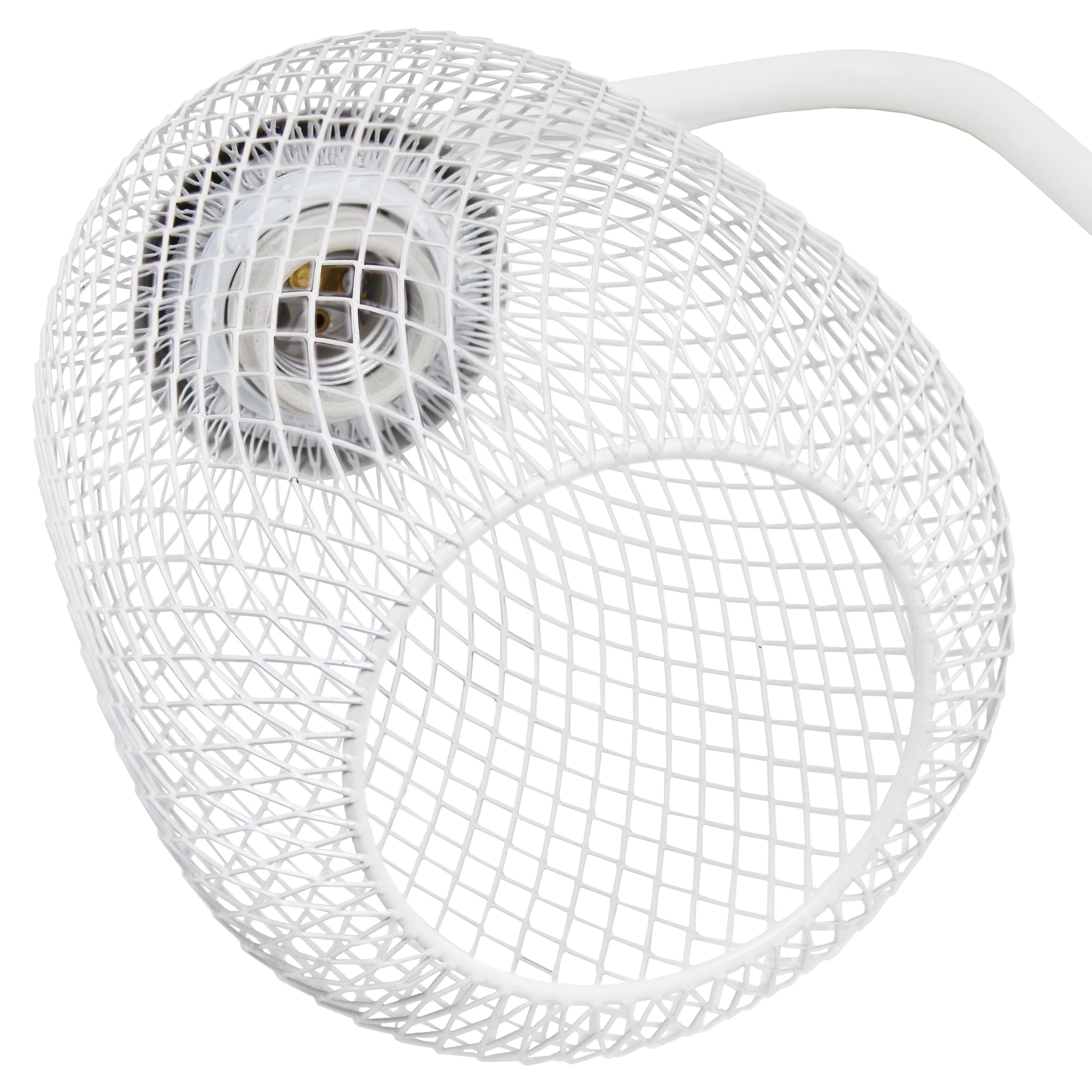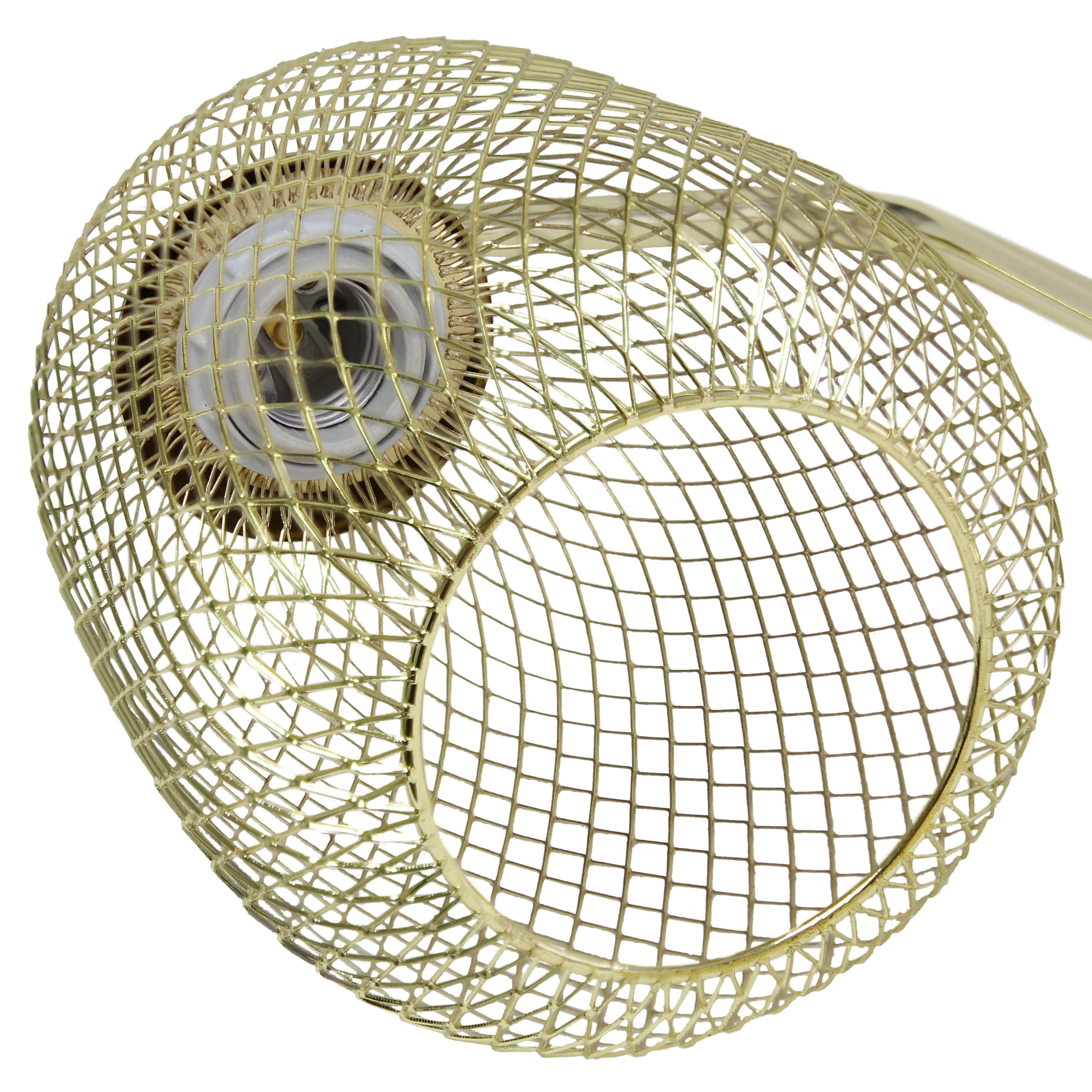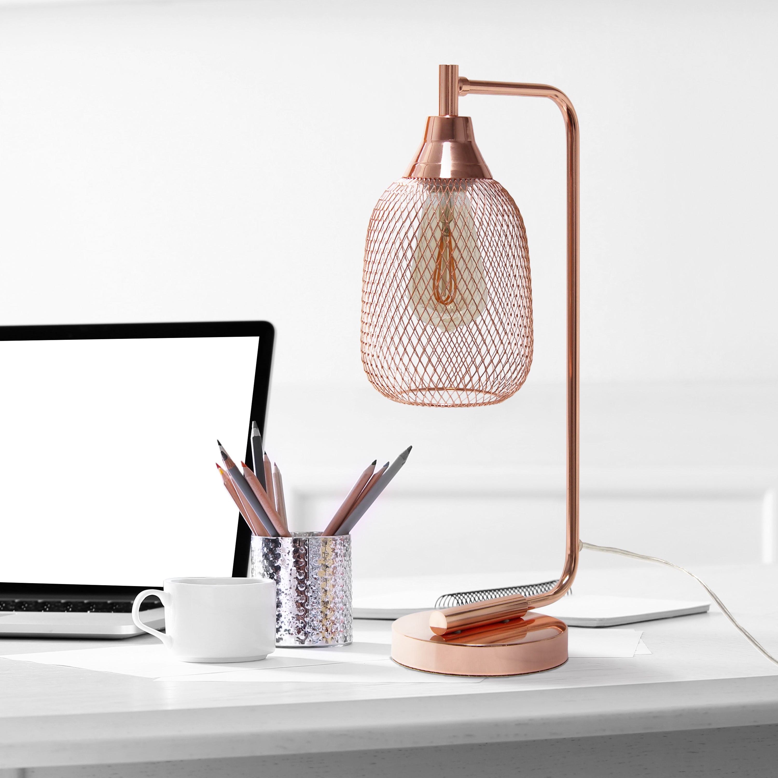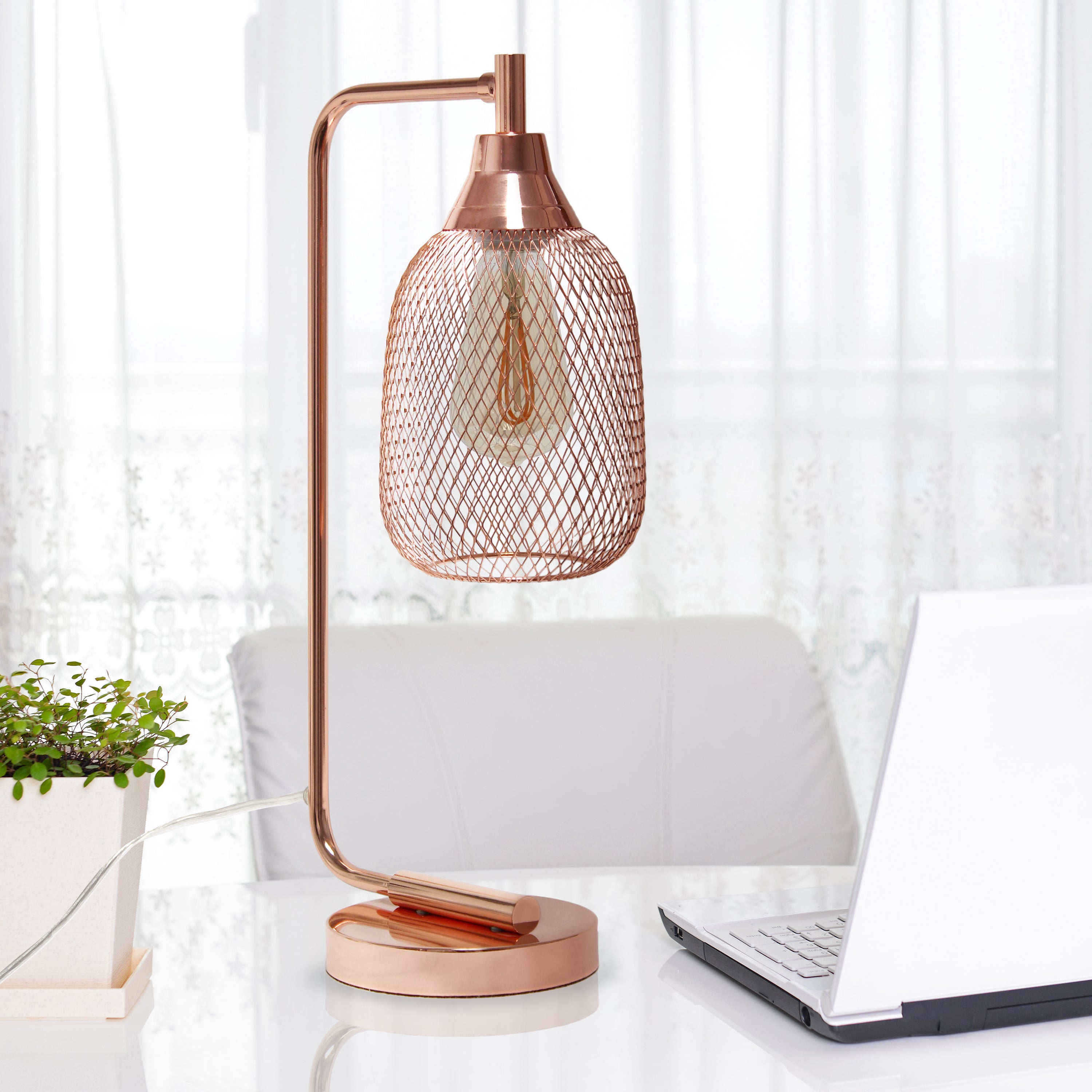 Light up any room in your home with this clean-lined industrial desk lamp. The sleek base is accented with a mesh shade, allowing the light to give off a beautiful glow when lit. This lamp is sure to add a sophisticated, trendy touch to your living room, bedroom, office, apartment or college dorm!