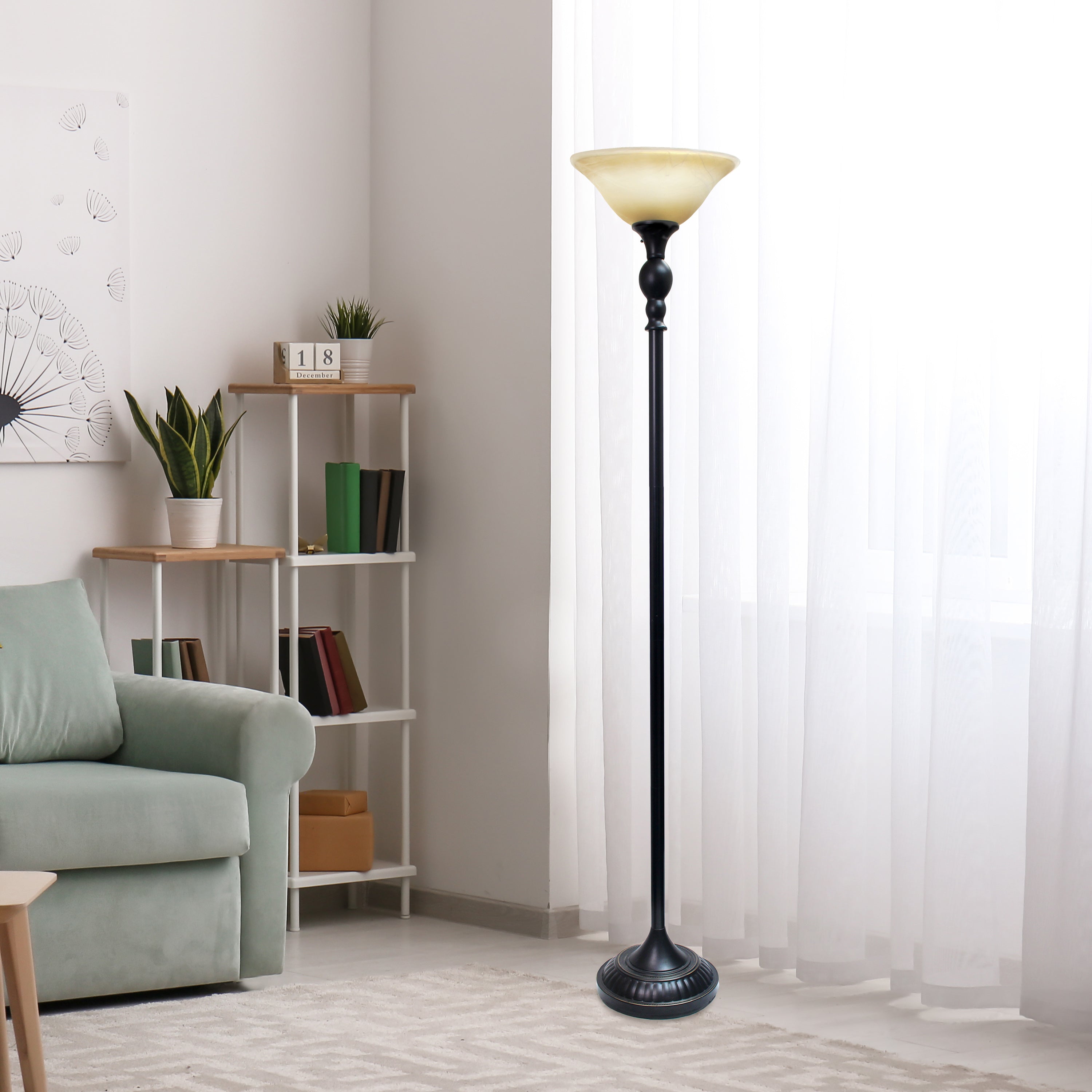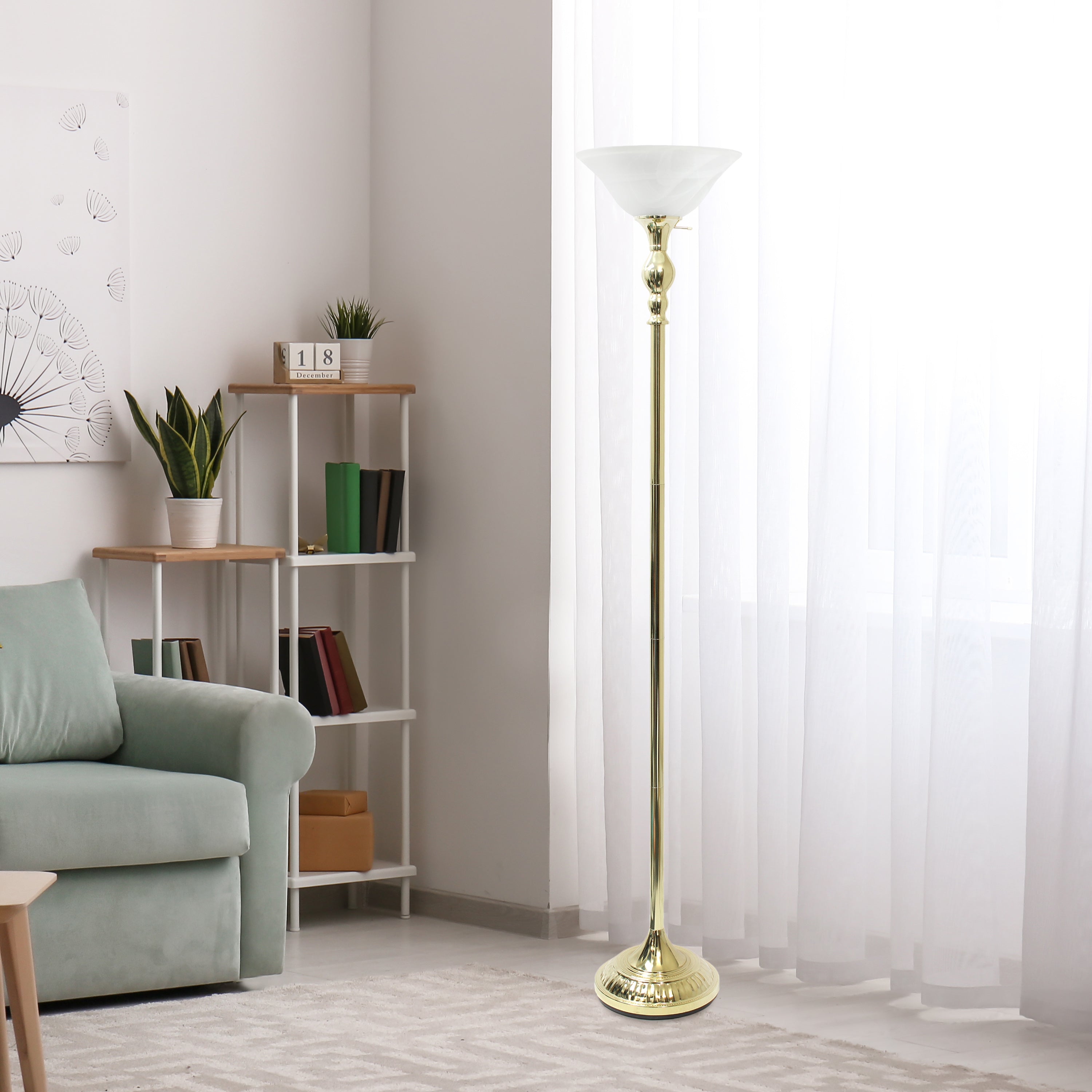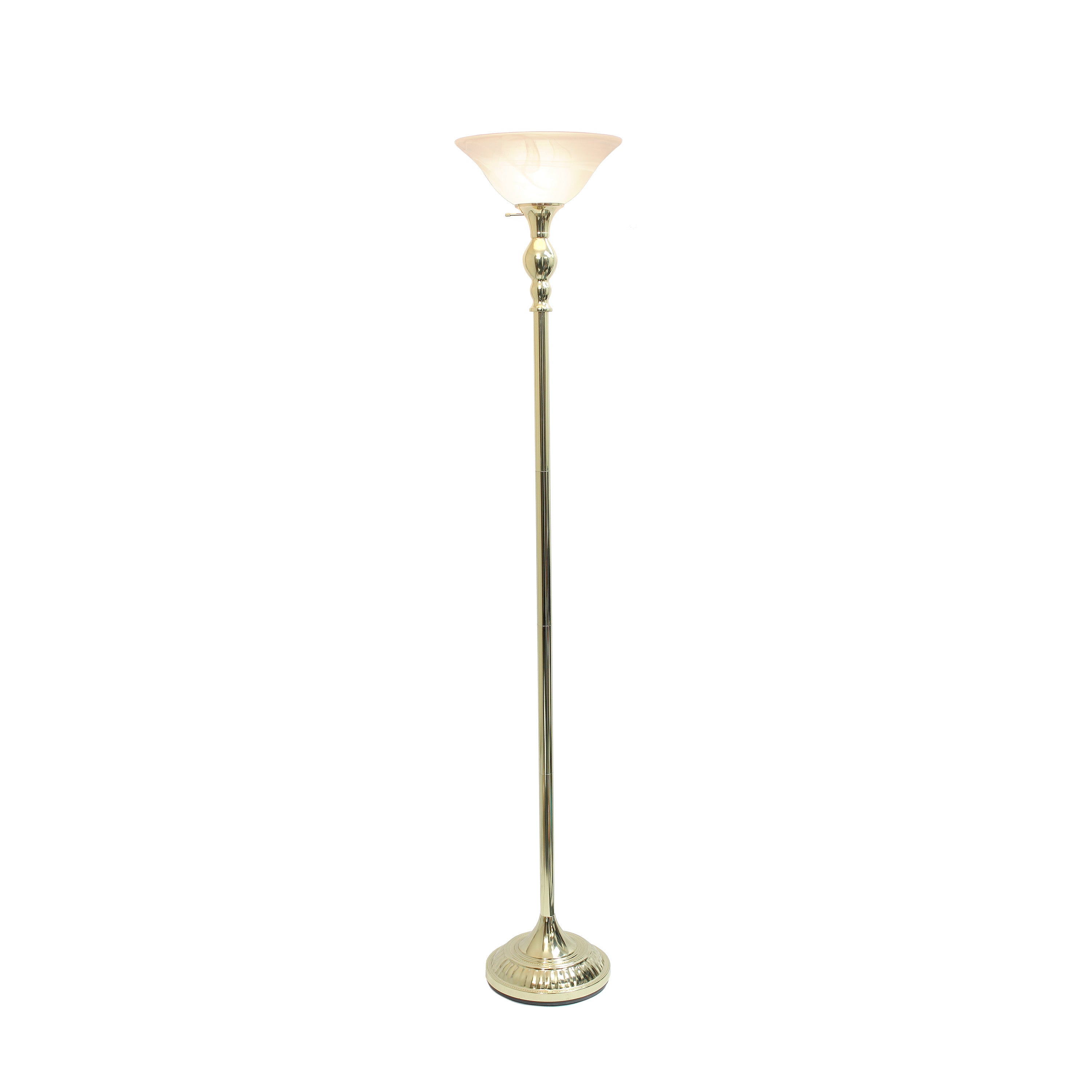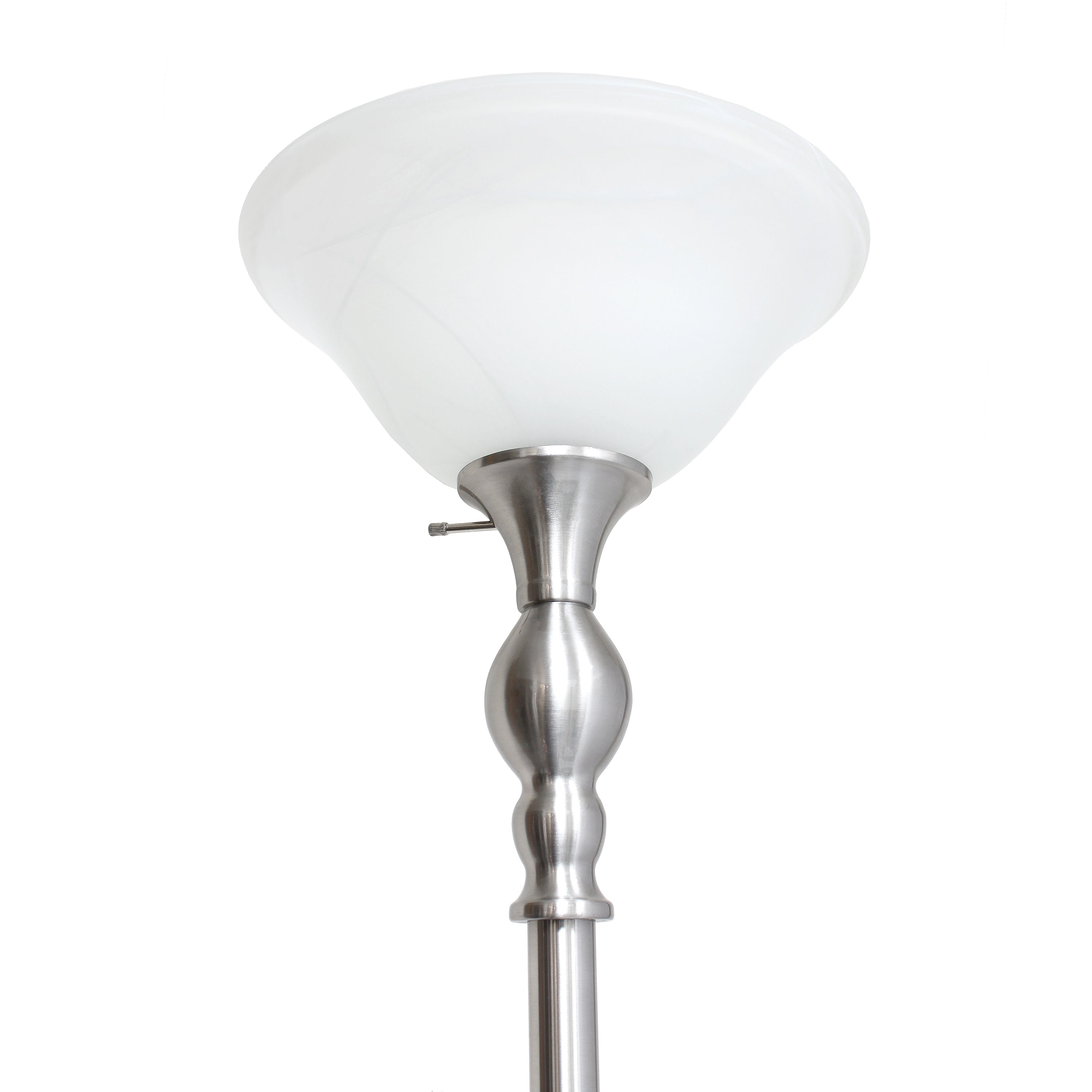 Light up your space with this simple but timeless torchiere floor lamp. It features a marbleized glass shade on a stunning metal base for a clean, sophisticated look. Perfect for your bedroom, office, foyer or living room.
