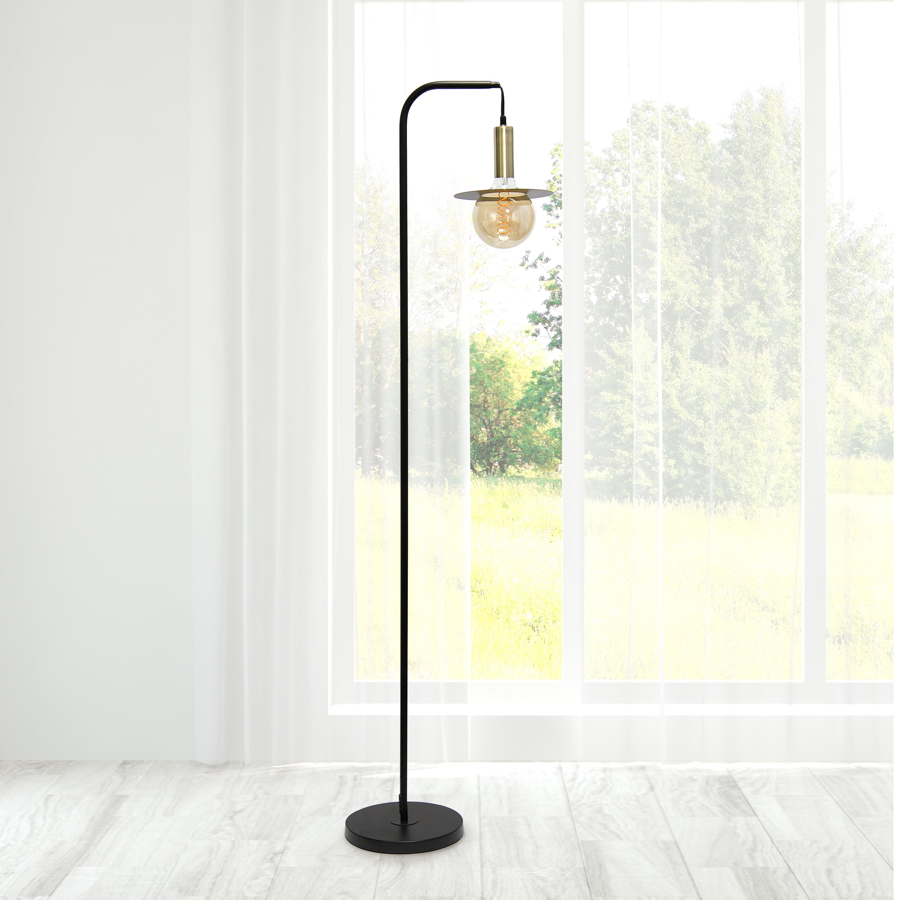 Brighten up your living space with this attractive street light style floor lamp. It features a matte black finish complemented with sleek antique brass accents. Add a modern, industrial touch to any room in your home! Ideal for your foyer, living room, bedroom, office or library.