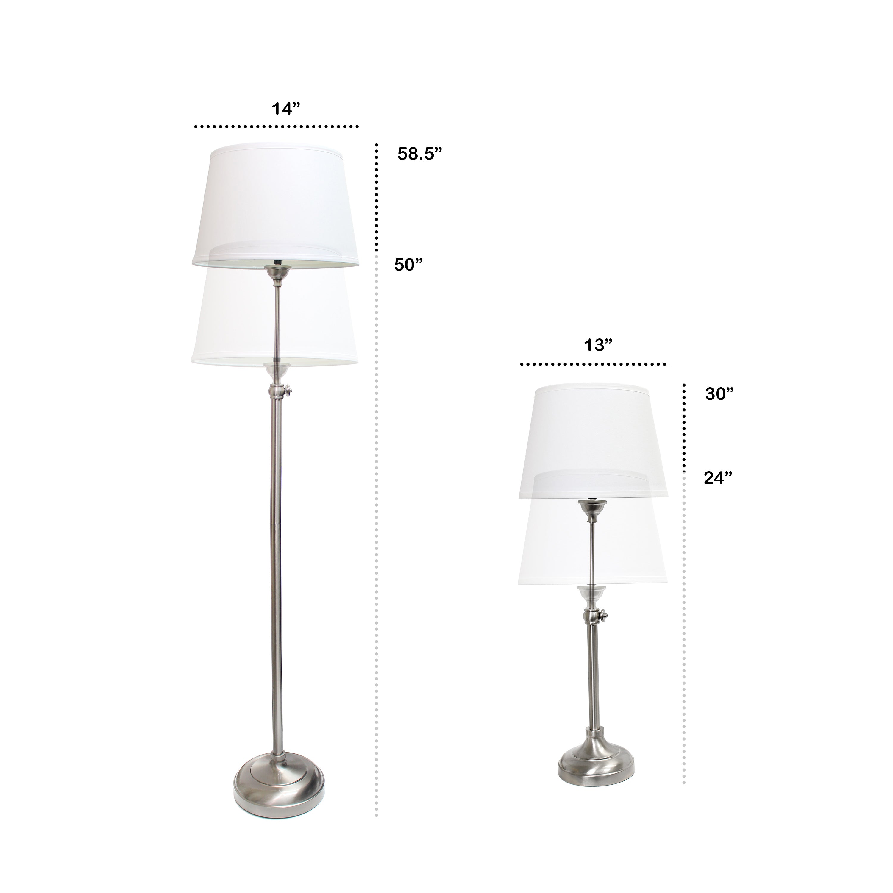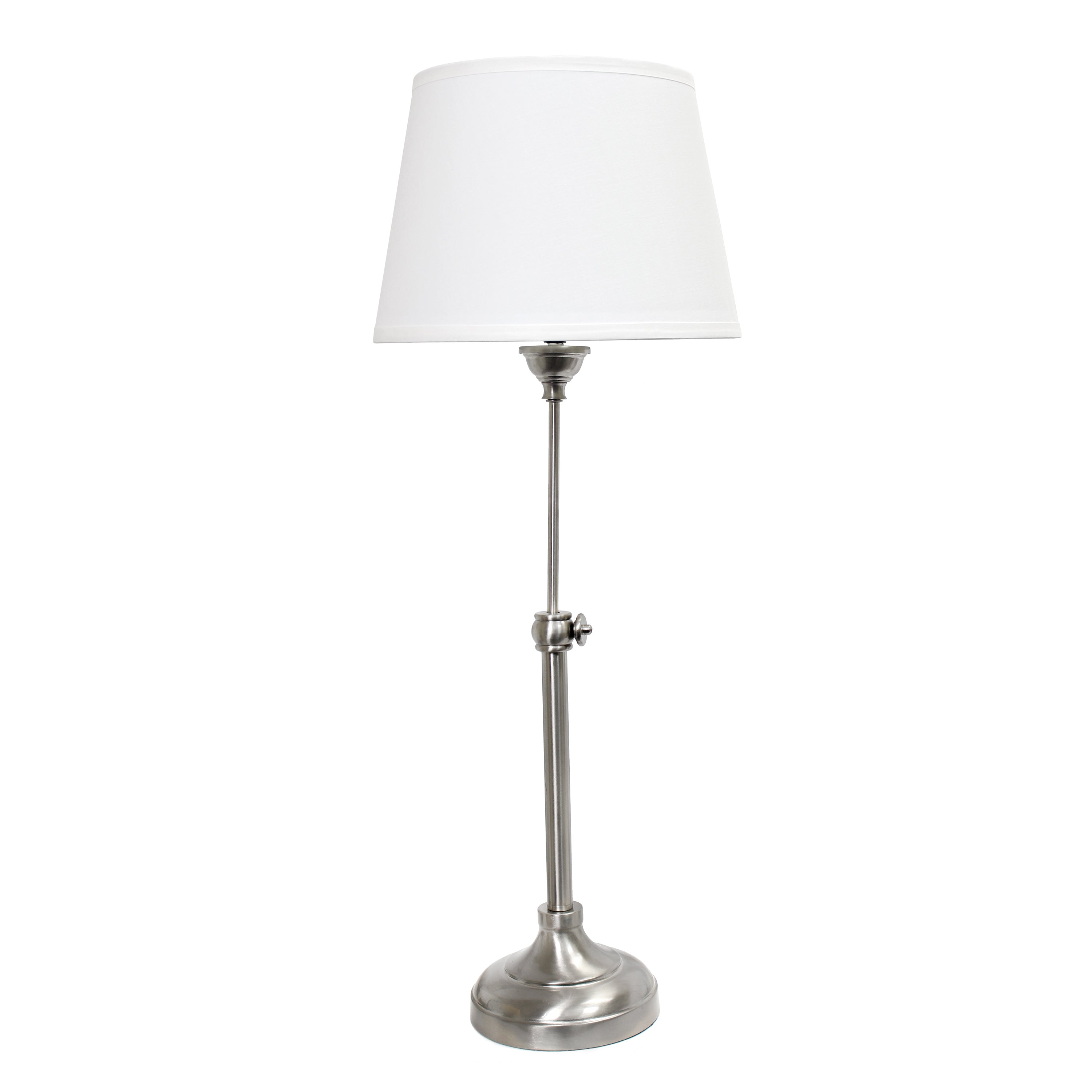 - Includes 2 x table and 1 x floor lamp brushed nickel extendable metal bases
