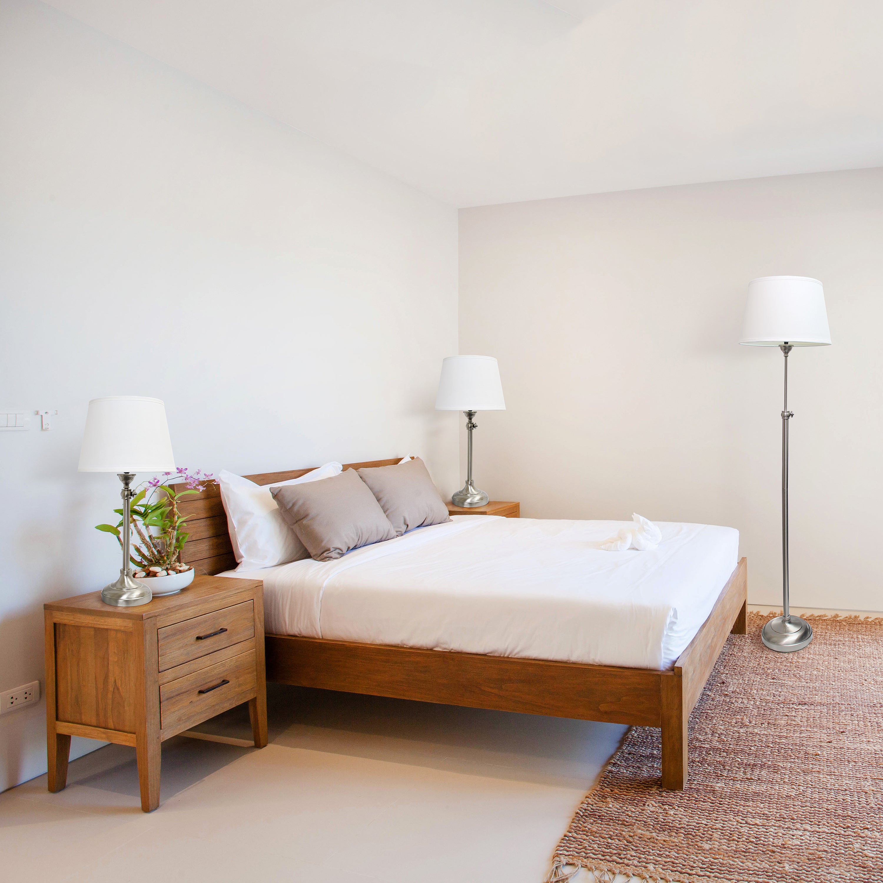 Upgrade your lighting decor with this beautiful 3 piece matching table and floor lamp set! The brushed nickel finish graciously embraces the sleek base of each lamp, and is paired with a lovely white fabric shade to bring you a sophisticated decor style while satisfying your lighting needs. Perfect for modern, traditional, and contemporary spaces!