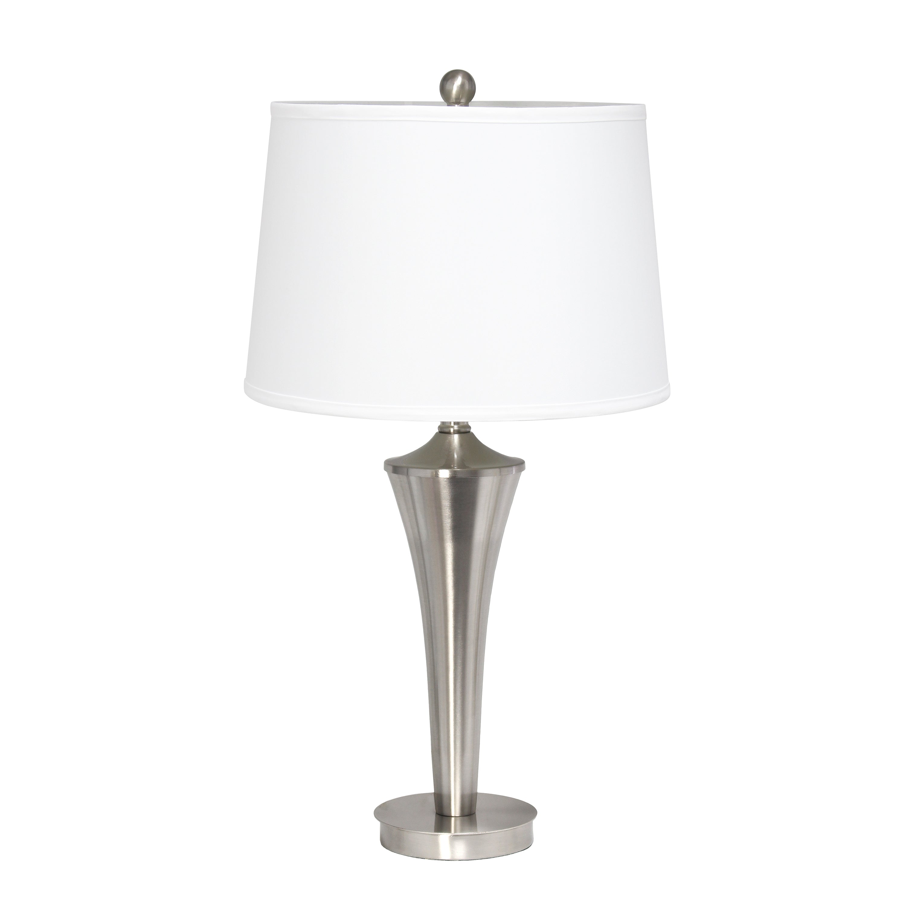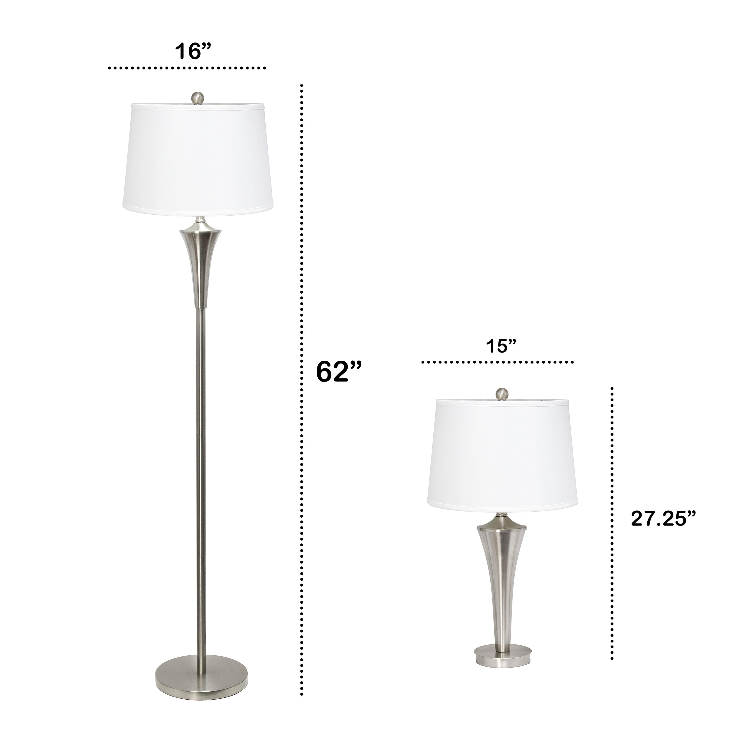 Upgrade your home with this beautiful 3 piece matching table and floor lamp set! A tapered pole in a flawless brushed nickel finish is paired with a lovely white fabric shade to bring you a sophisticated decor style while satisfying your lighting needs. Perfect for modern, traditional, and contemporary spaces!