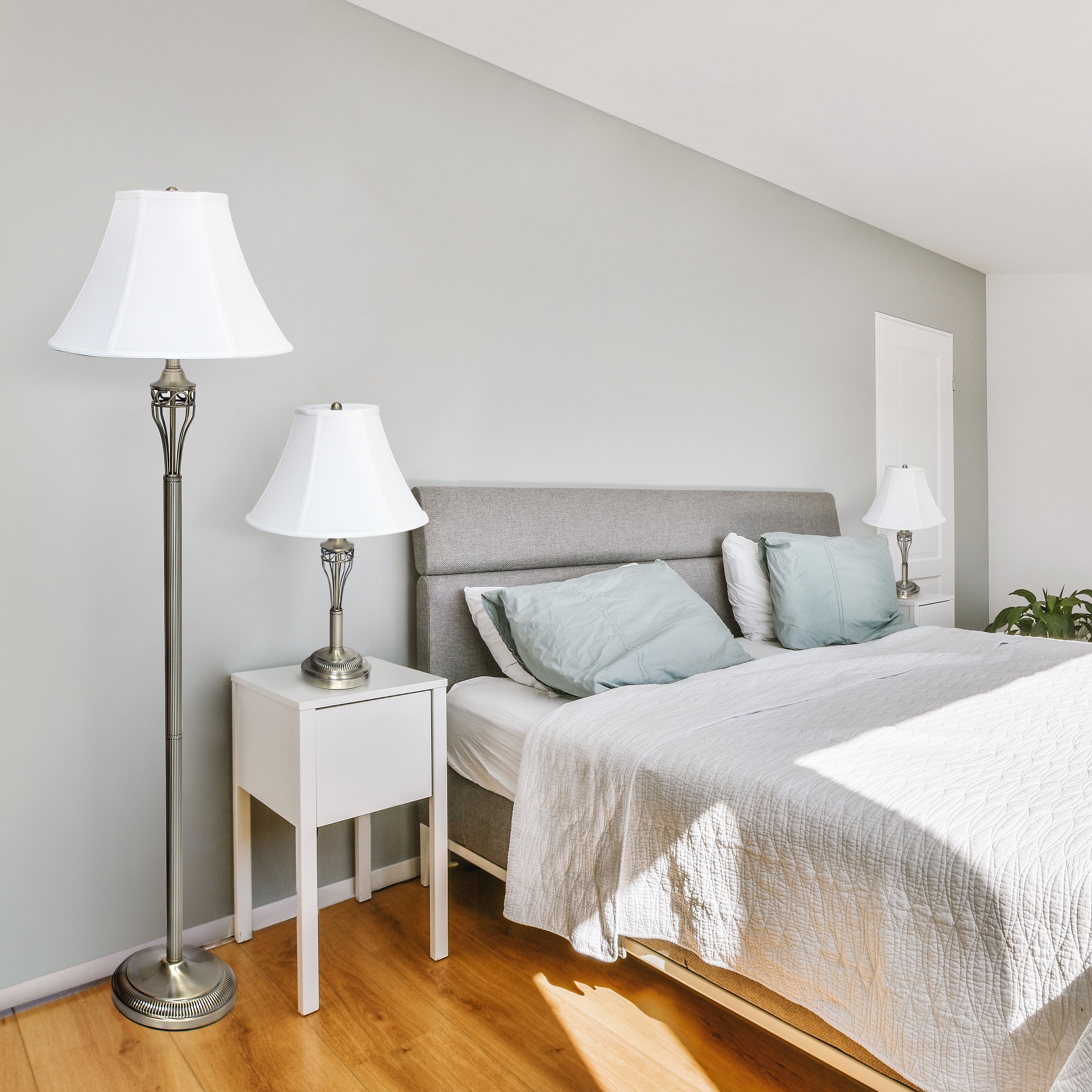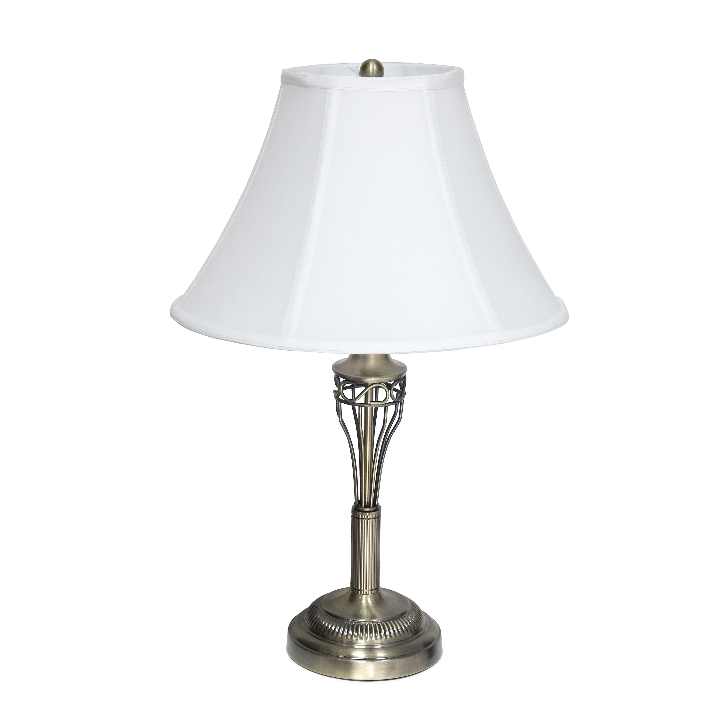 Upgrade your decor with this beautiful 3 piece matching table and floor lamp set! The antique brass bases detail fine lines and sophisticated detail beneath a crisp white fabric shade, blending effortlessly into a number of decor styles. This is the perfect set to sit in your room of choice, whether it be your living room, bedroom, or office.