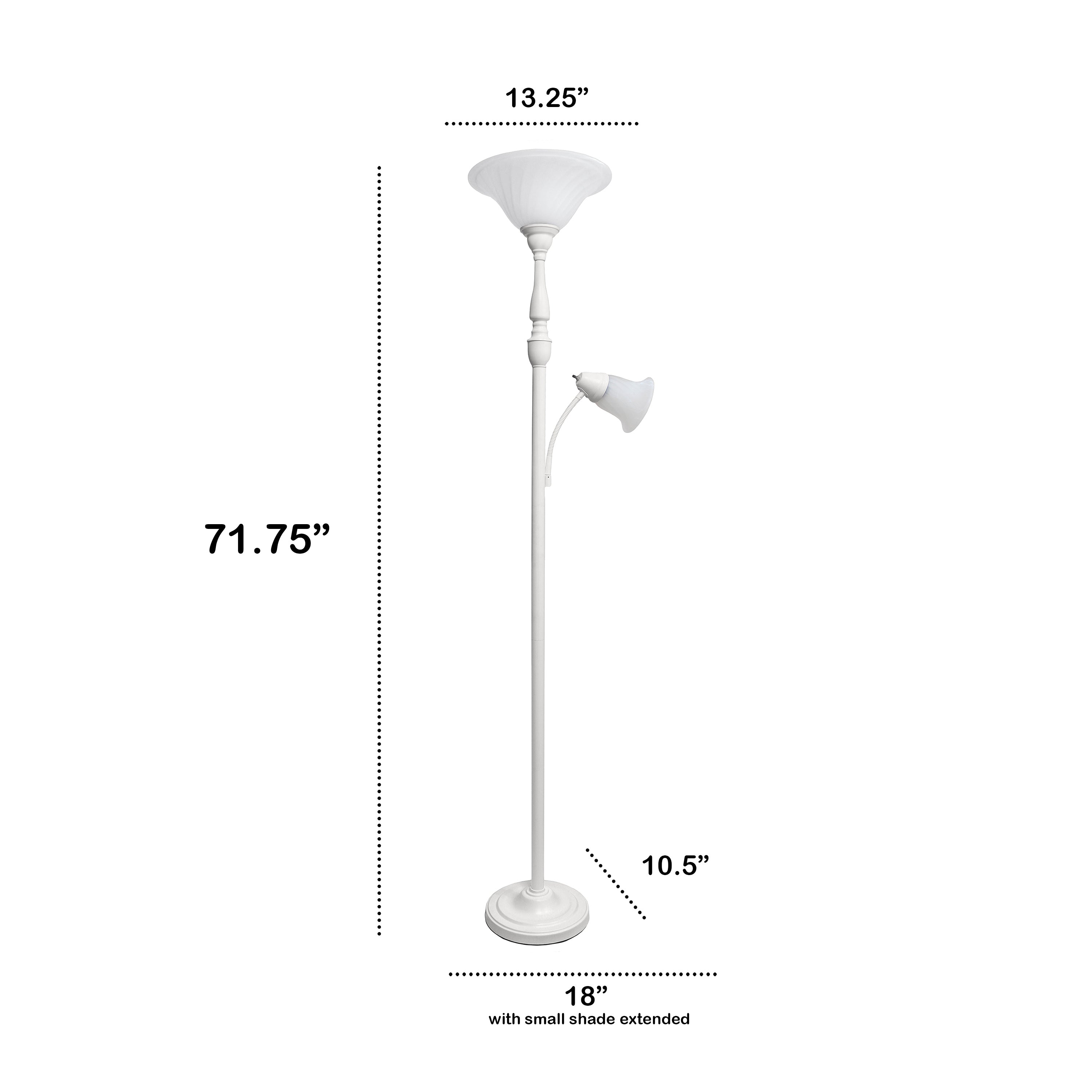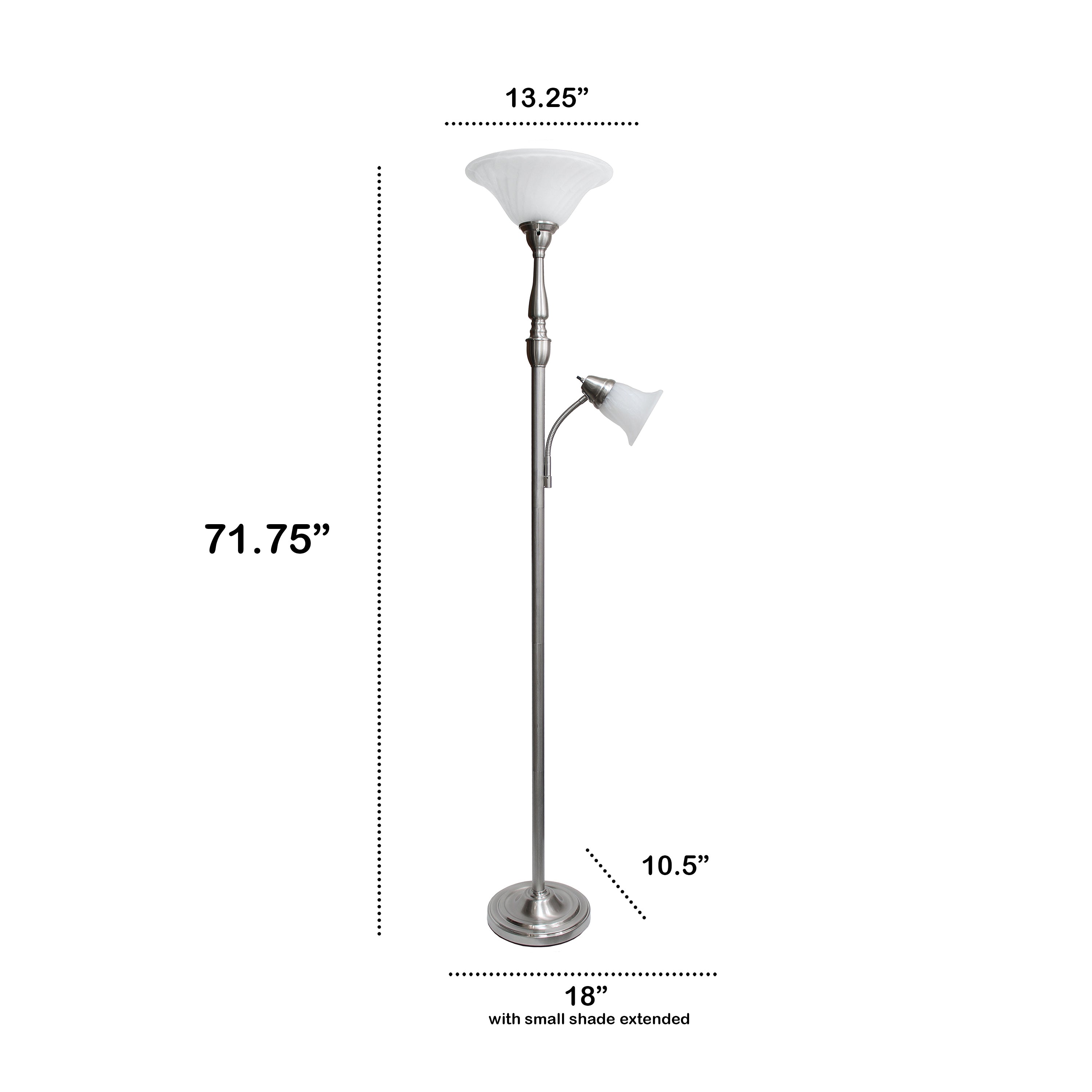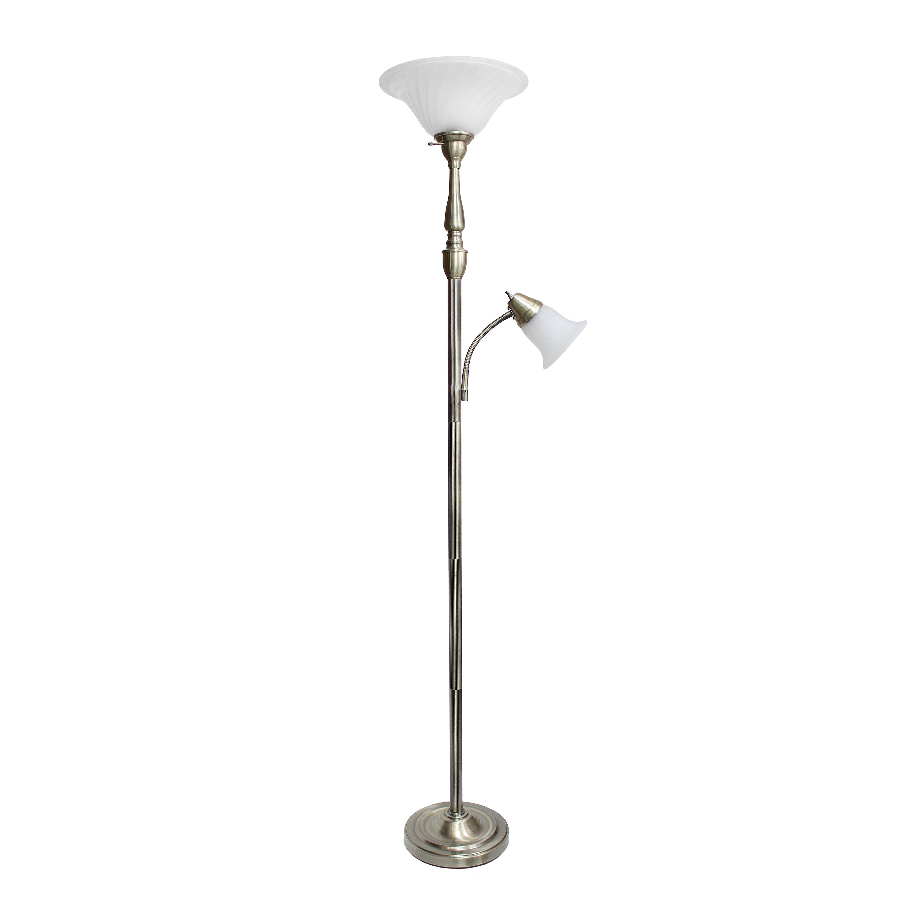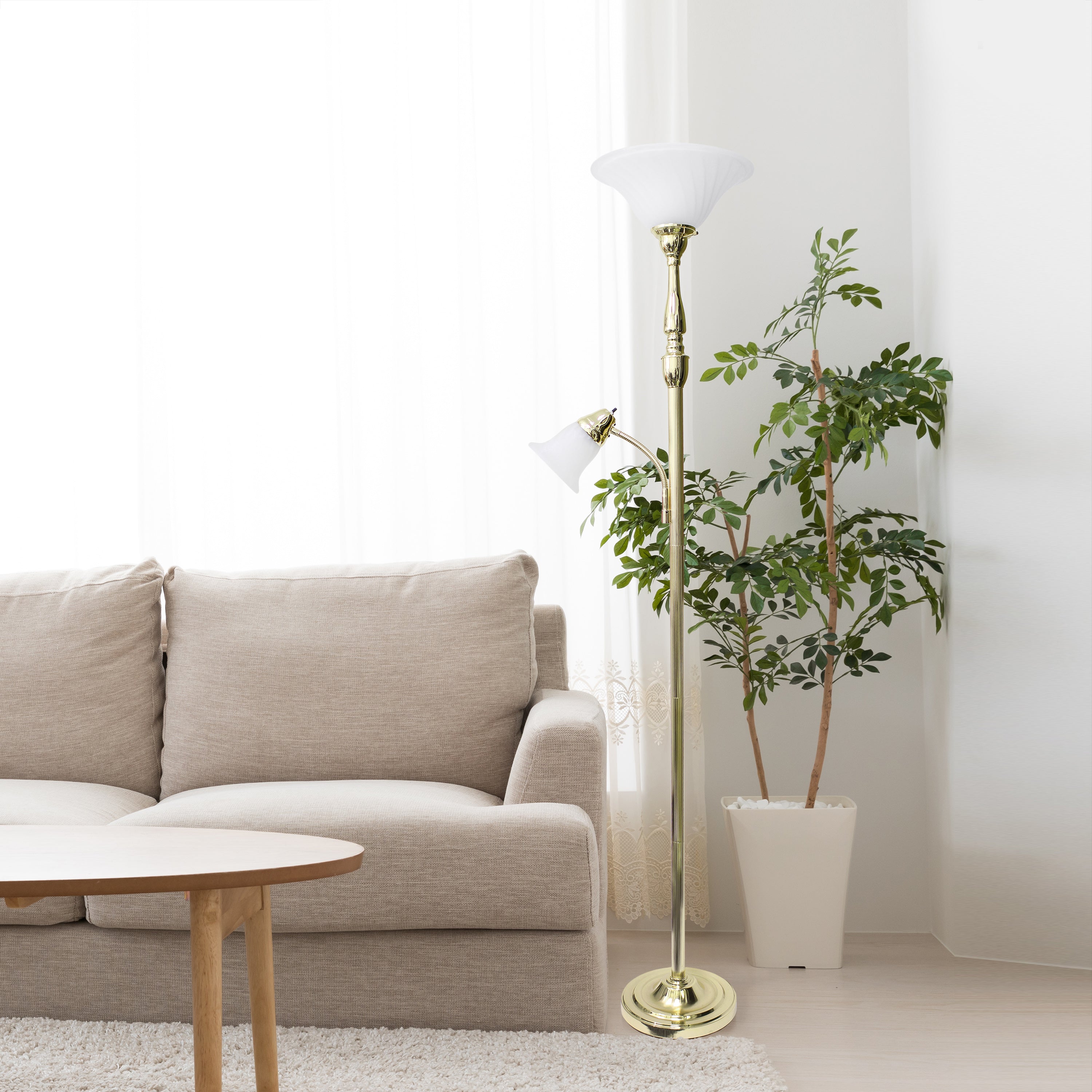Brighten up your living space with this elegant 2 light floor lamp. It features 1 adjustable reading light to focus on the area of your choice. The beautiful metal base is accented by scalloped glass shades to complete the timeless look. Perfect for your bedroom, office, foyer or living room!