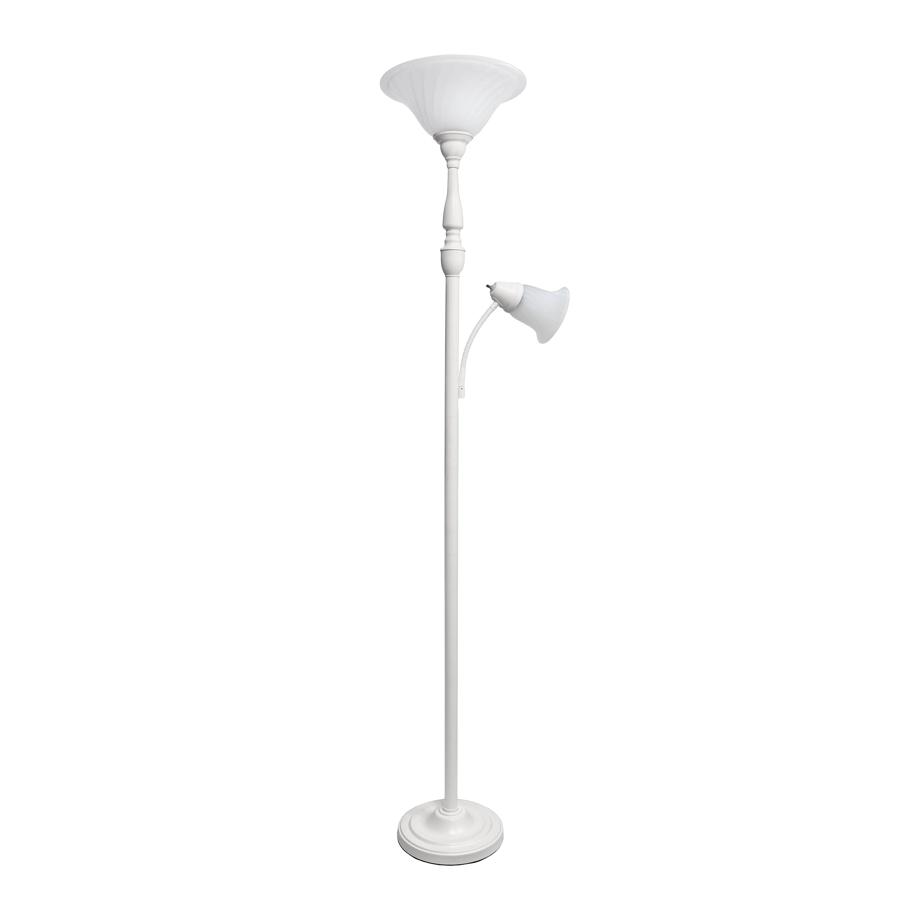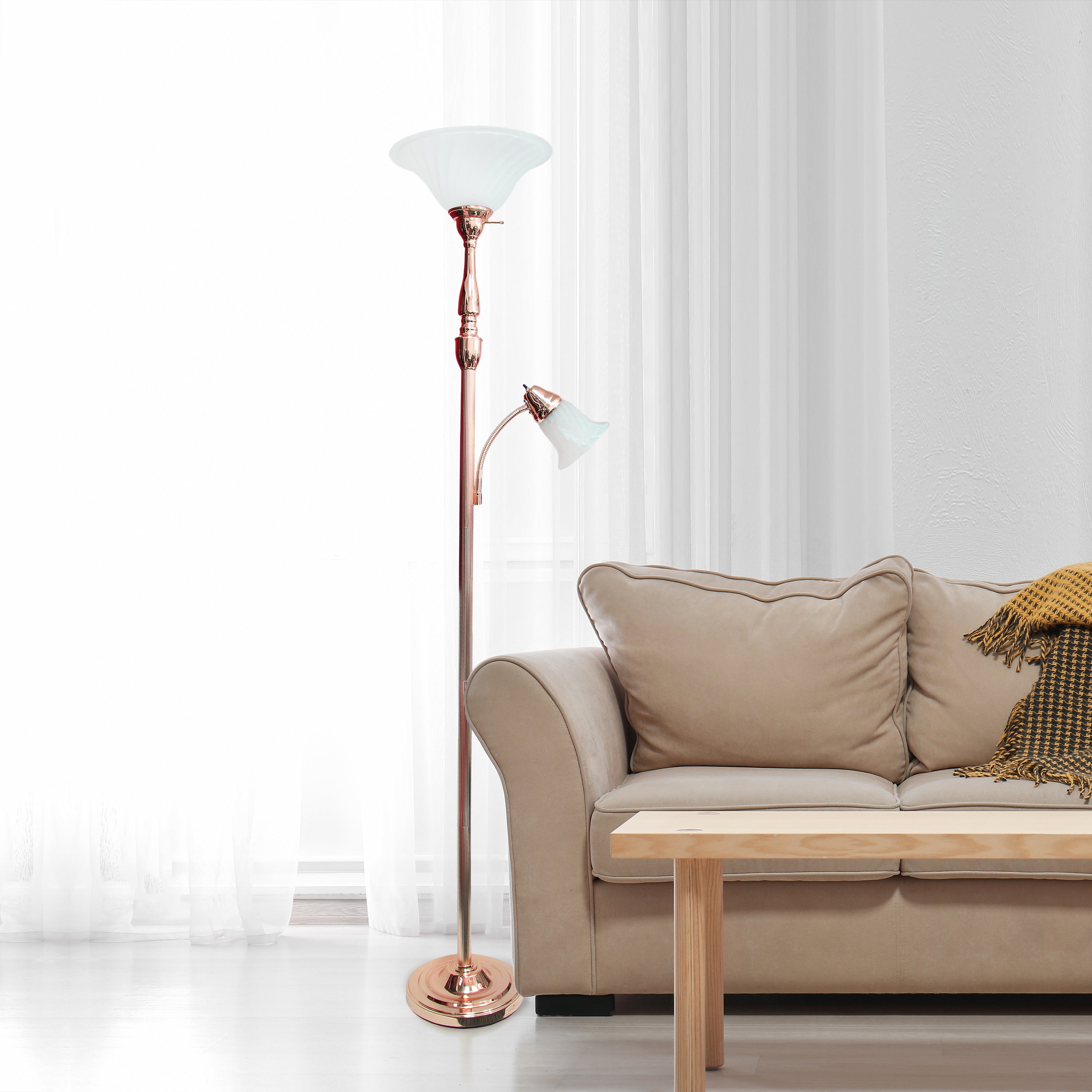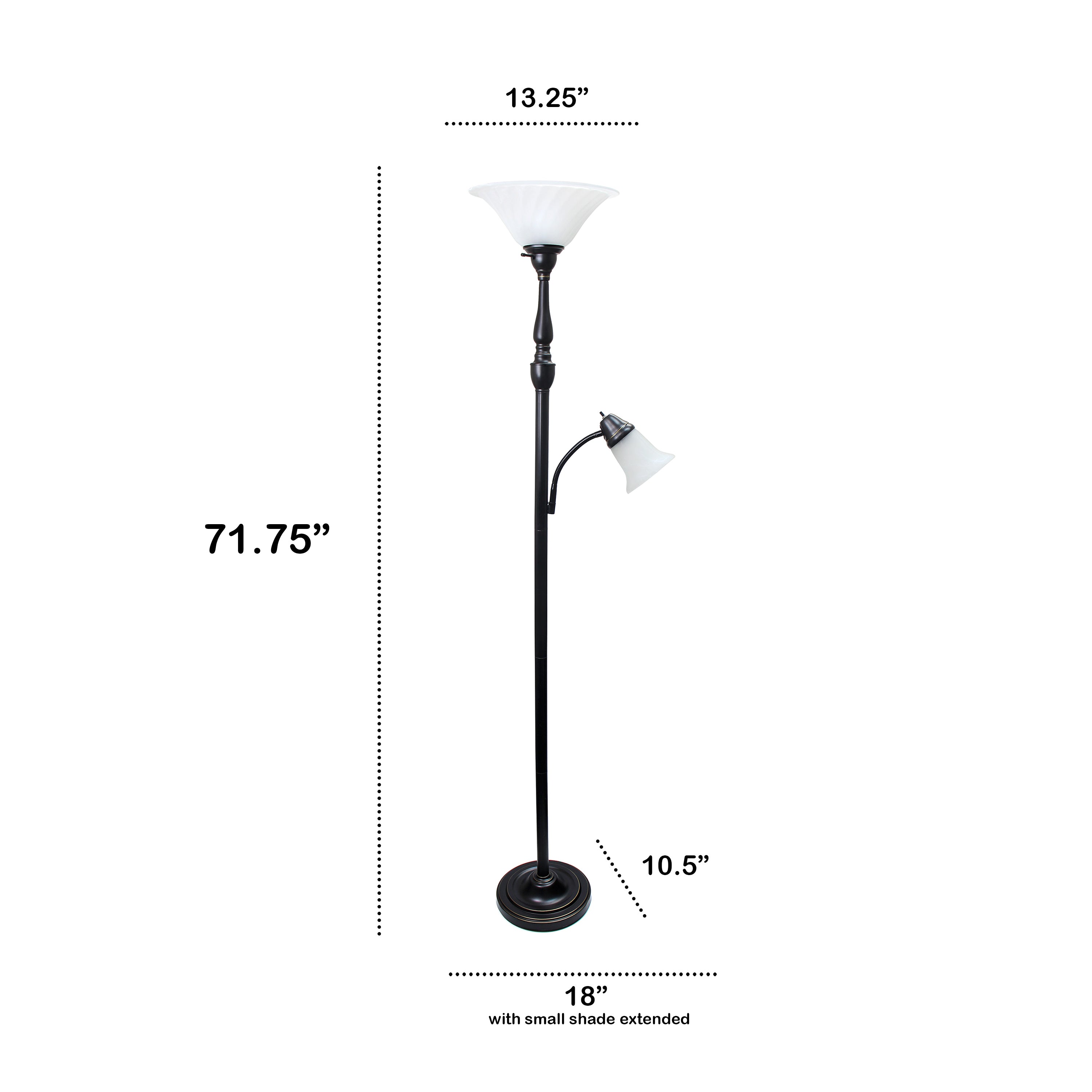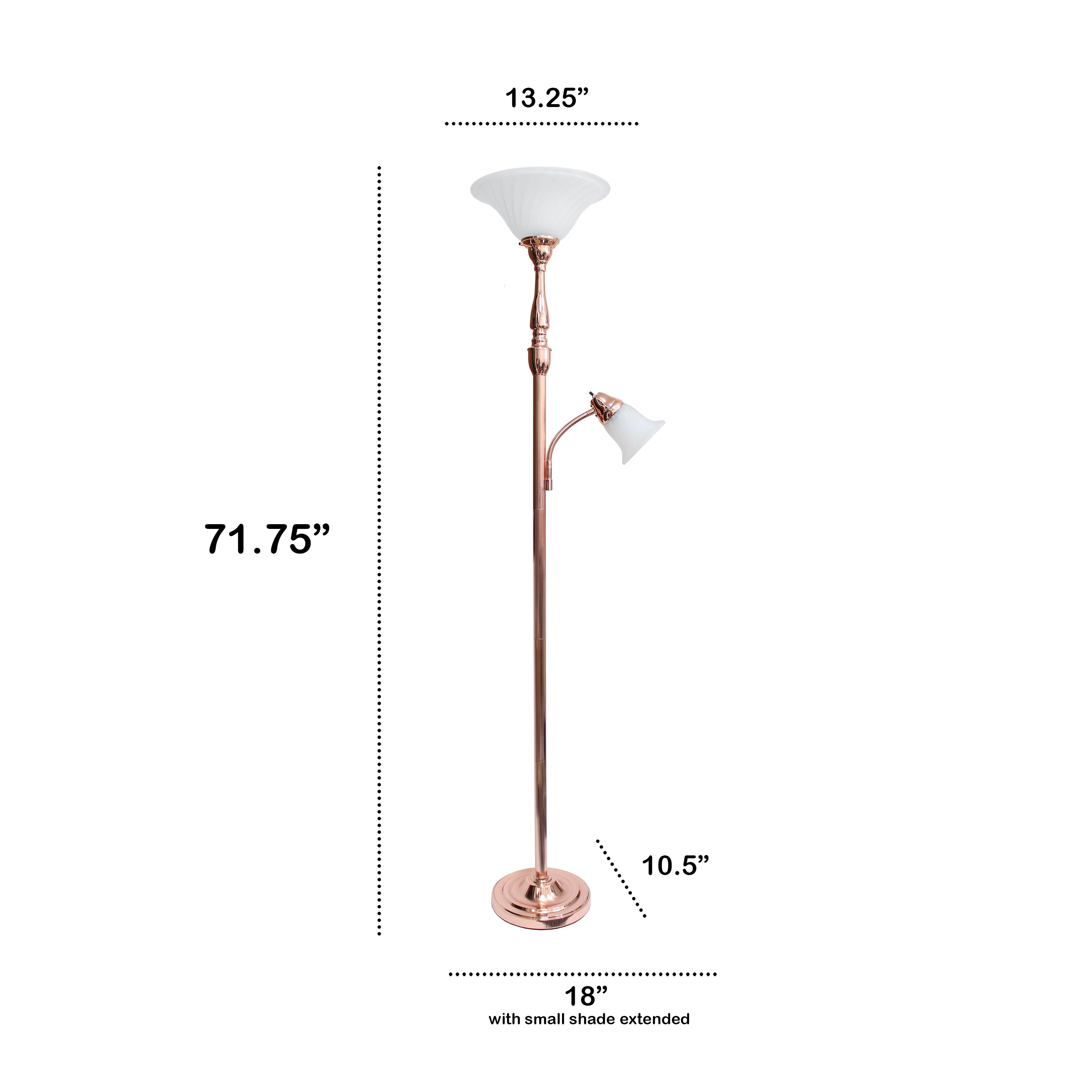 Brighten up your living space with this elegant 2 light floor lamp. It features 1 adjustable reading light to focus on the area of your choice. The beautiful metal base is accented by scalloped glass shades to complete the timeless look. Perfect for your bedroom, office, foyer or living room!