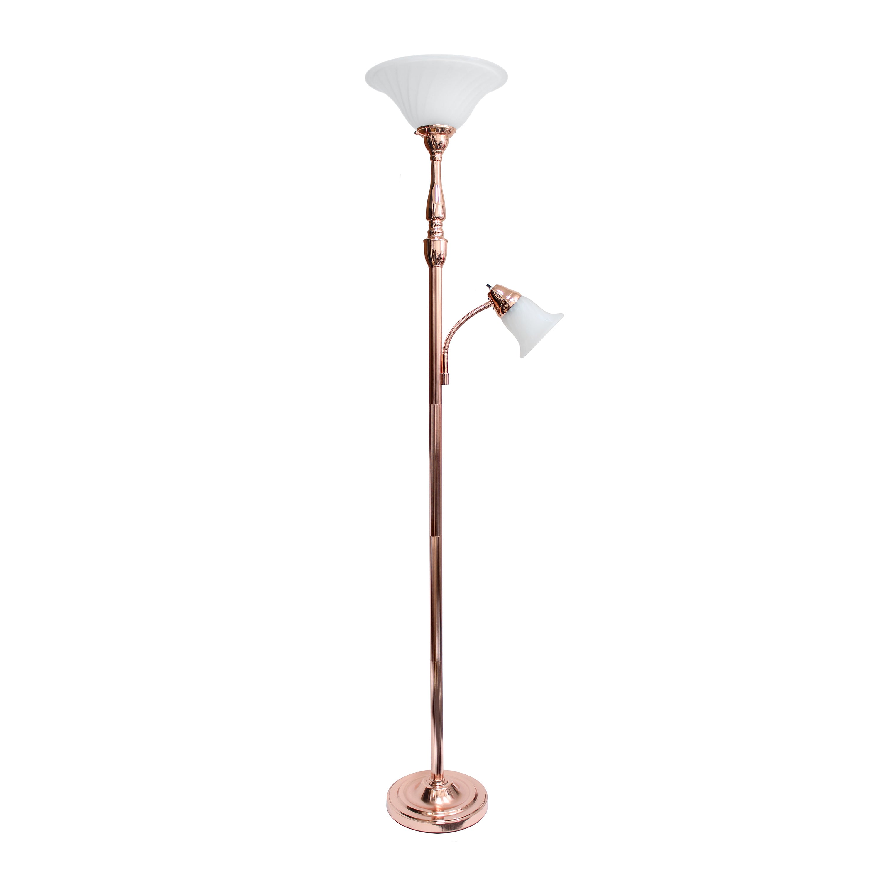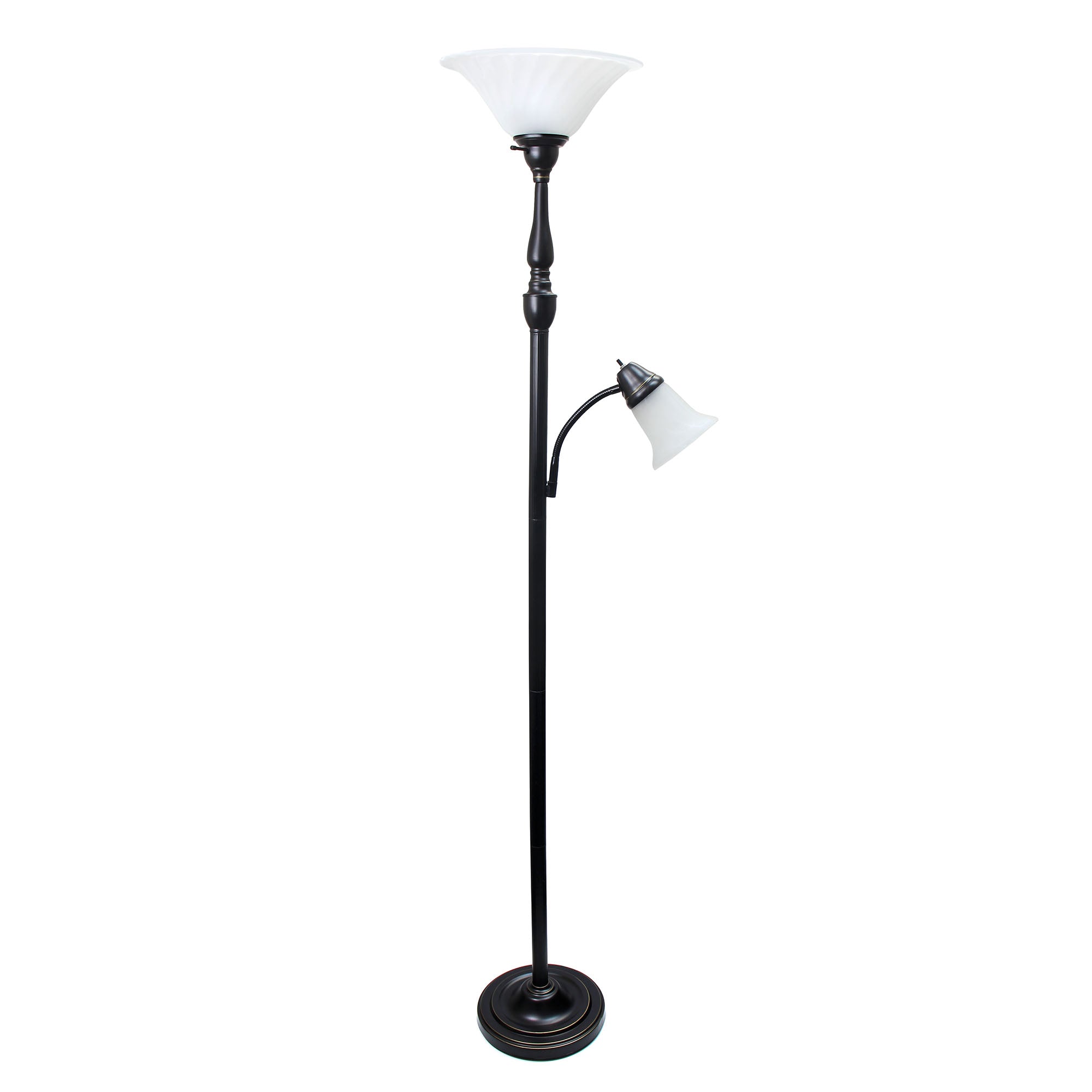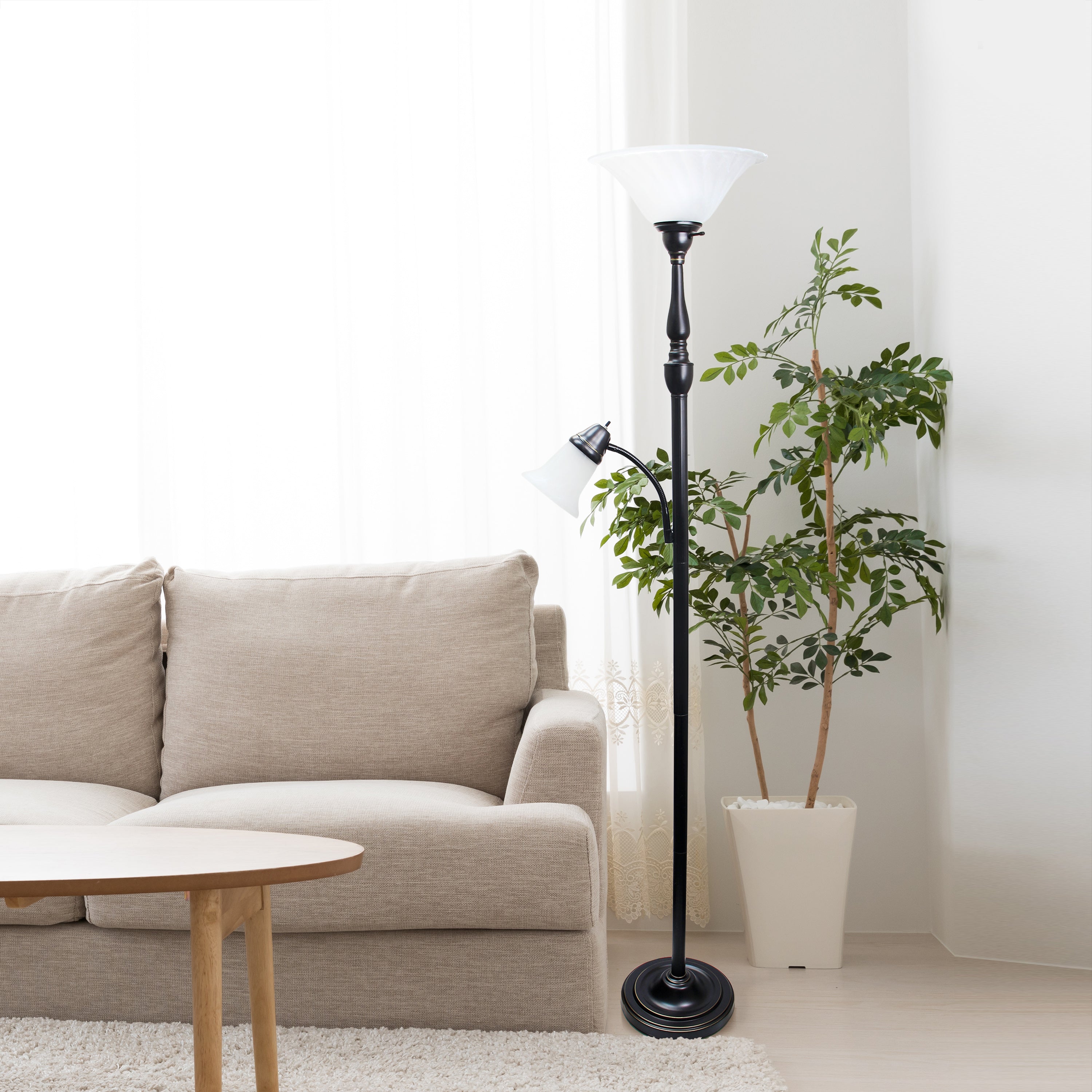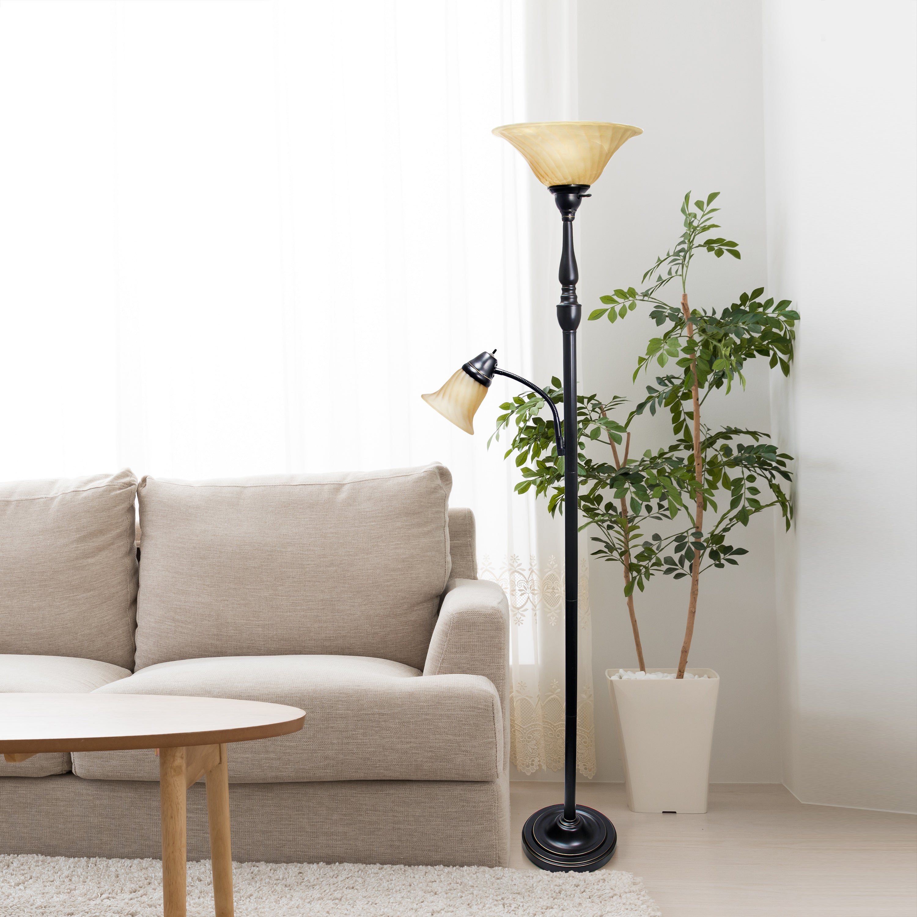 Brighten up your living space with this elegant 2 light floor lamp. It features 1 adjustable reading light to focus on the area of your choice. The beautiful metal base is accented by scalloped glass shades to complete the timeless look. Perfect for your bedroom, office, foyer or living room!