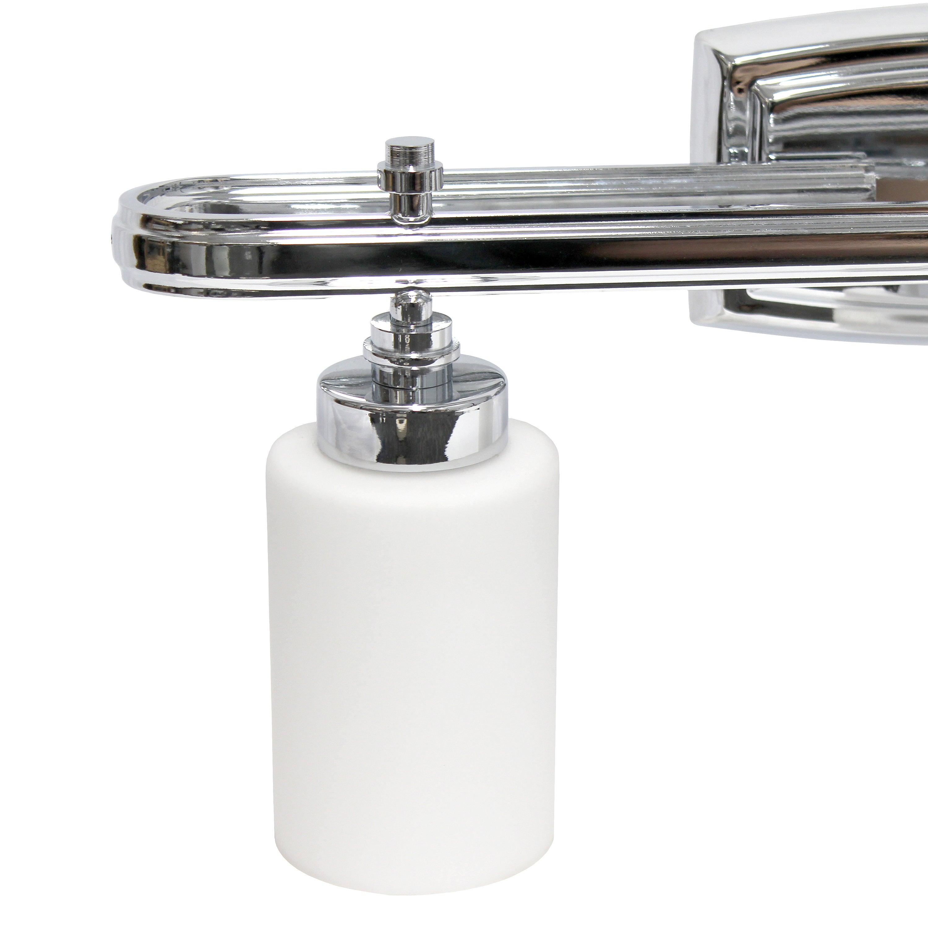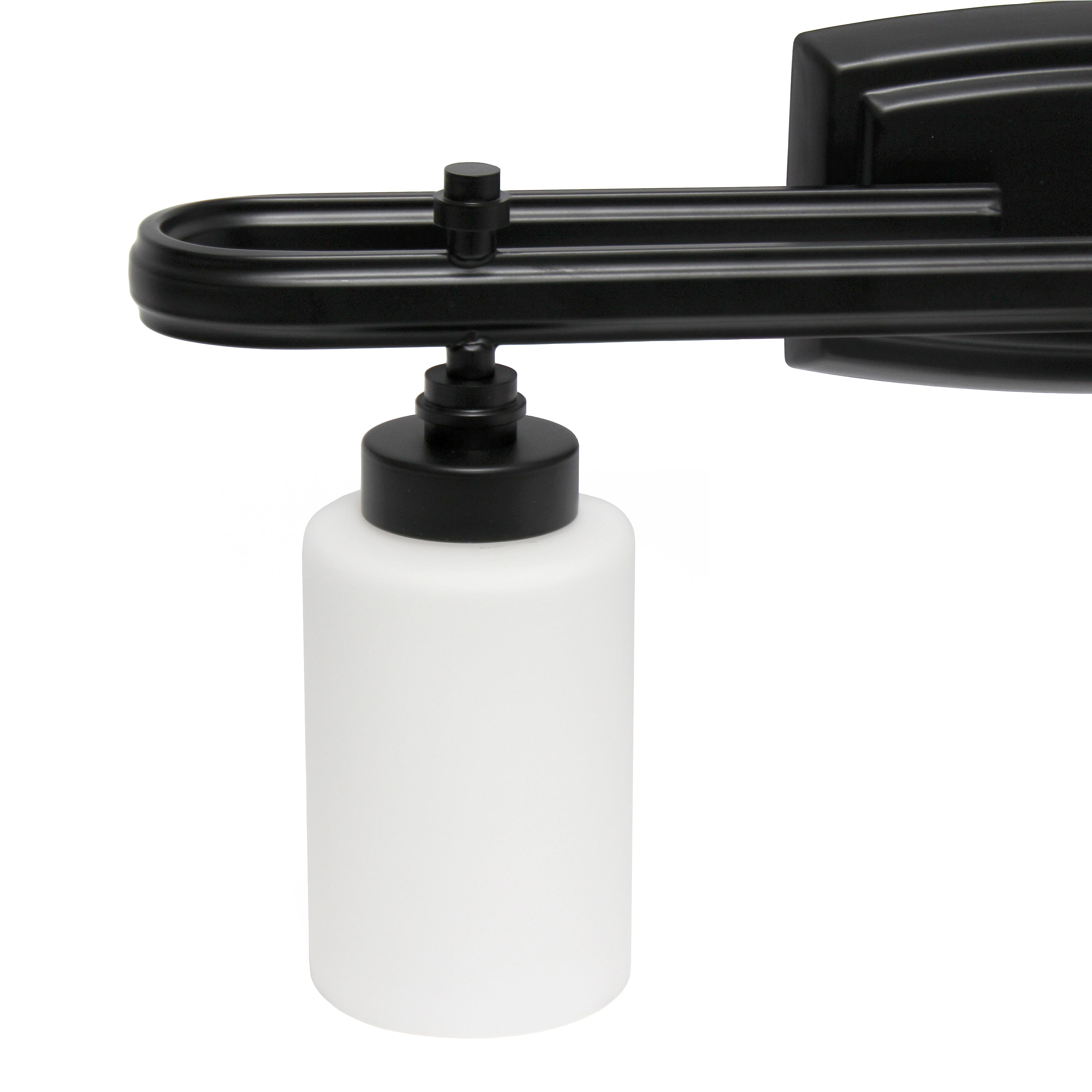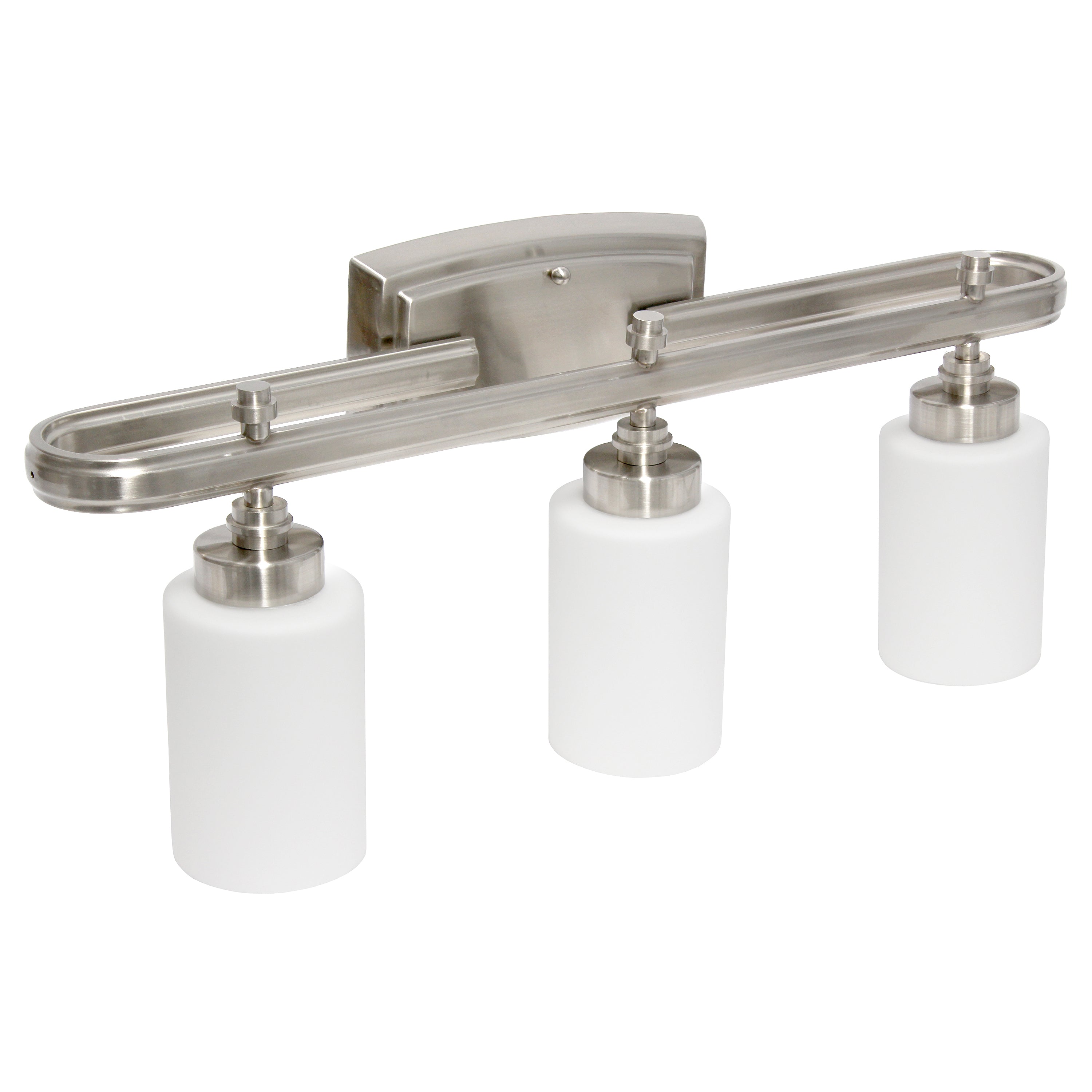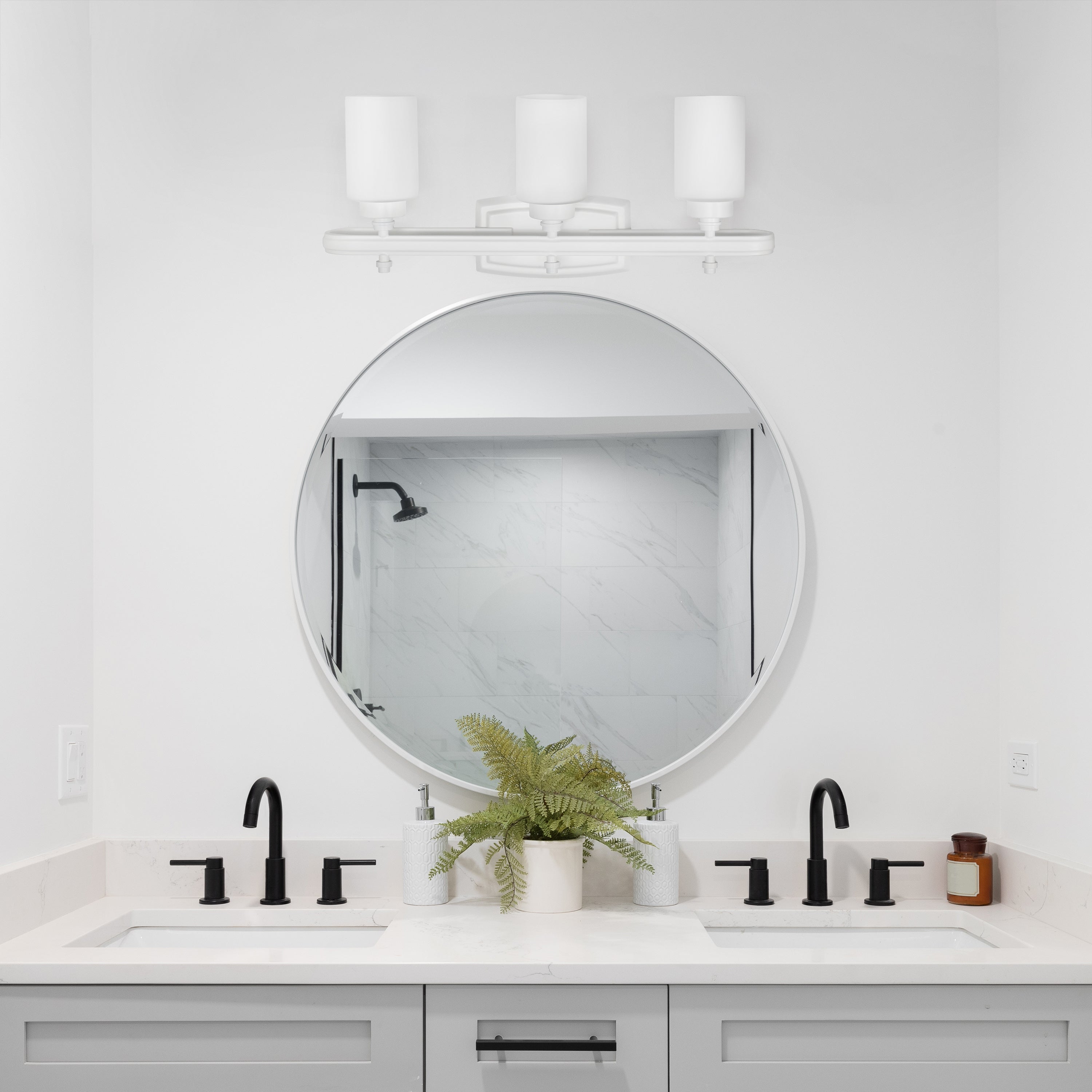 This lovely three light vanity fixture has been carefully designed to serve both your lighting and decor needs in a sophisticated and contemporary manner. Three identical opaque white shades are held in place on a looped oval metal bar by matching metal socket holders in the finish of your choice. Perfect for your bathroom, hallway, bedroom, foyer, or above your vanity!