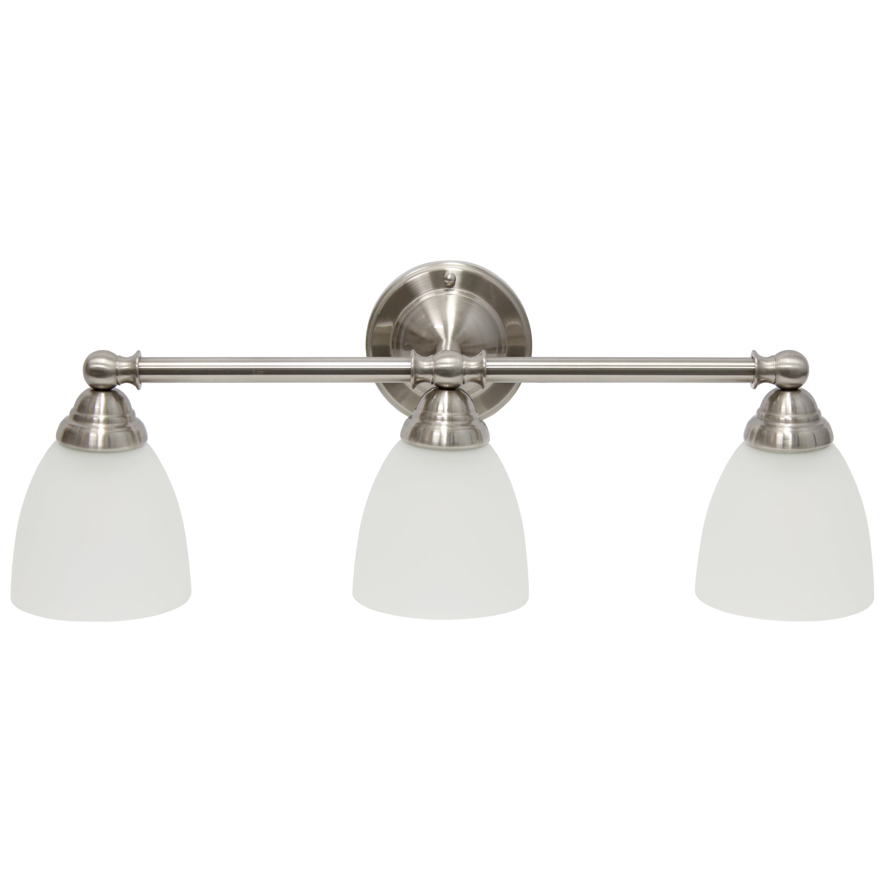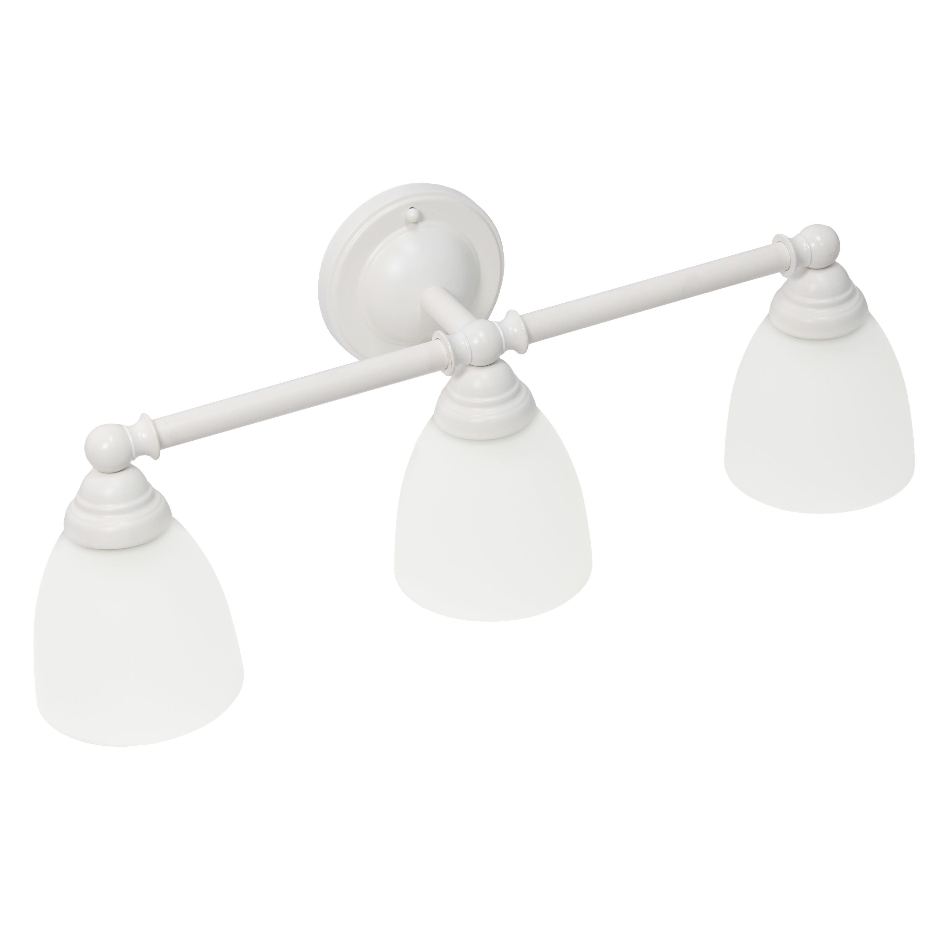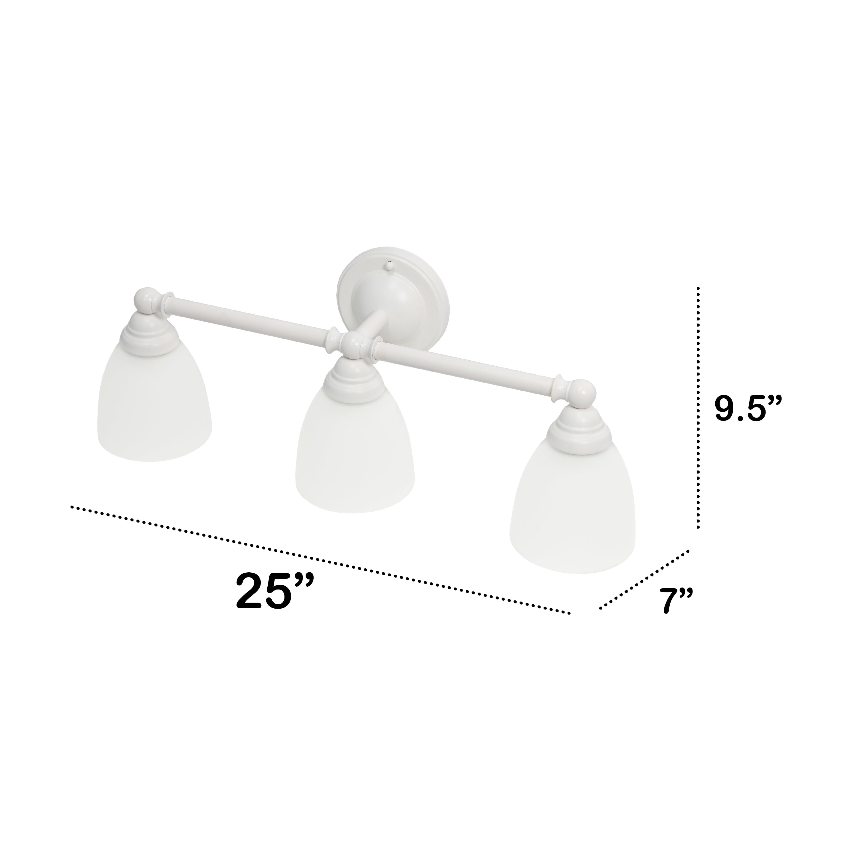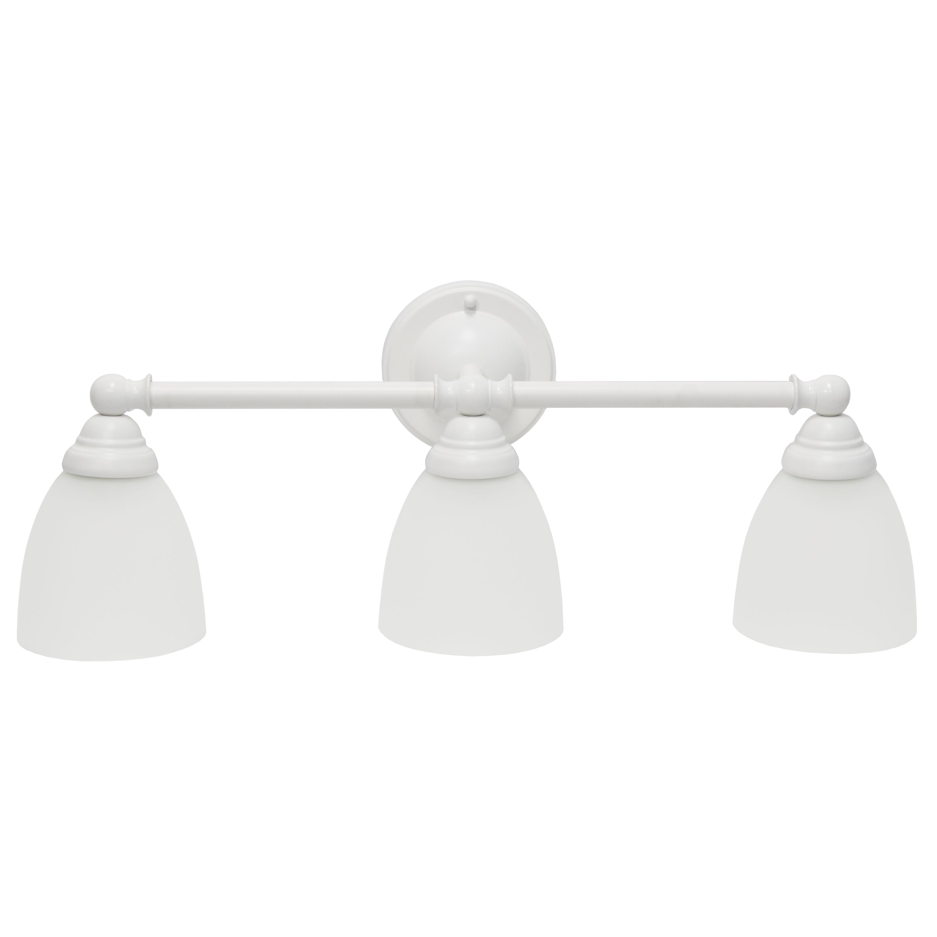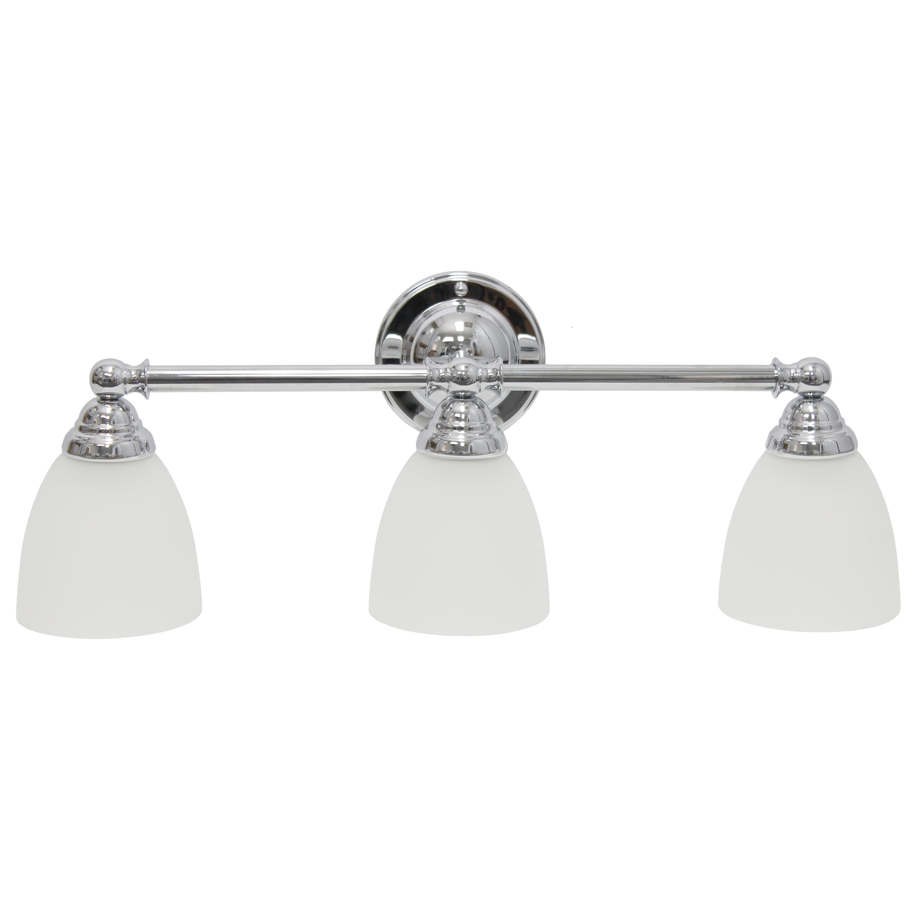This lovely three light vanity fixture has been carefully designed to serve both your lighting and decor needs in a sophisticated, yet traditional manner. Three identical translucent shades are held in place on a straight metal bar by matching metal socket holders in the finish of your choice. Perfect for your bathroom, hallway, bedroom, foyer, or above your vanity!