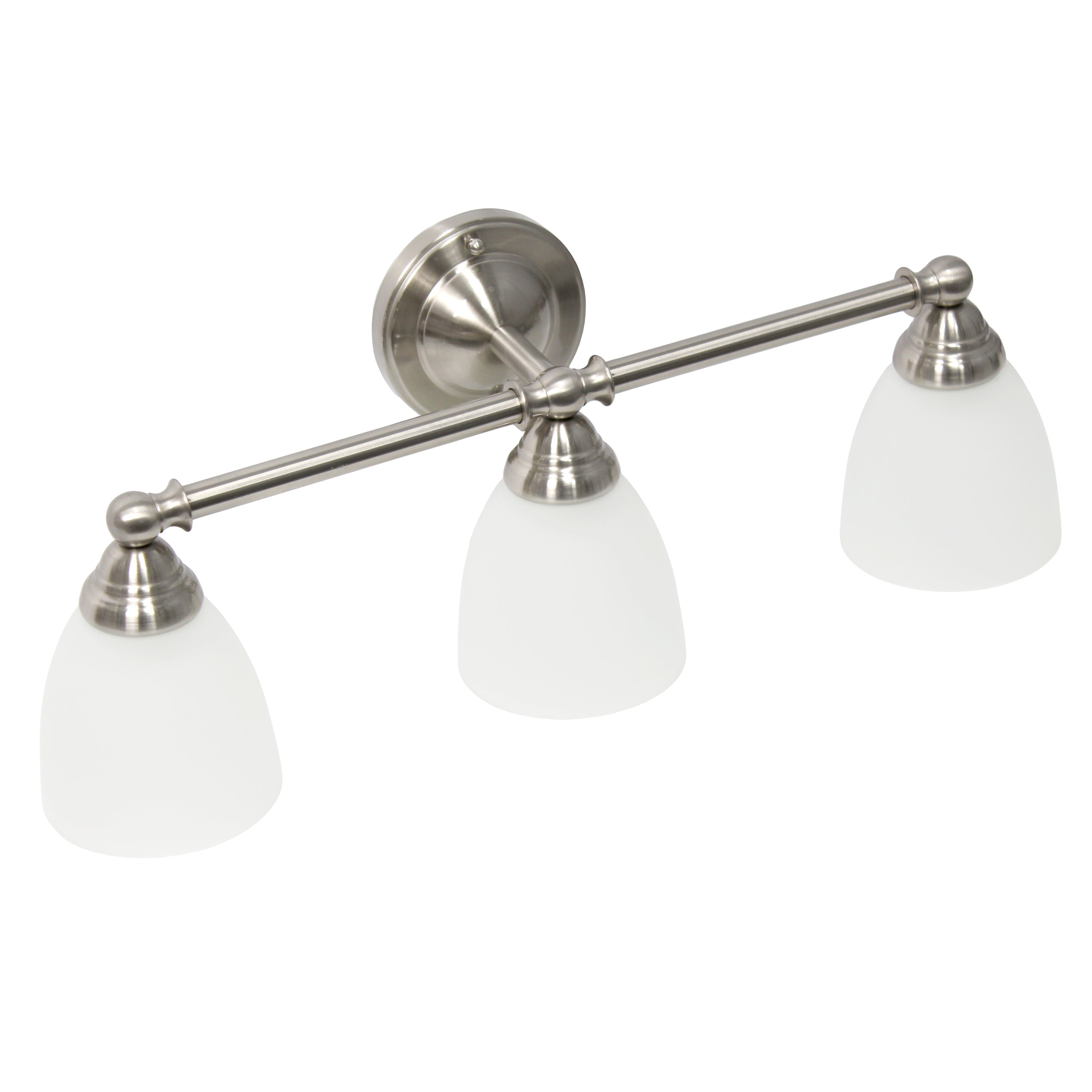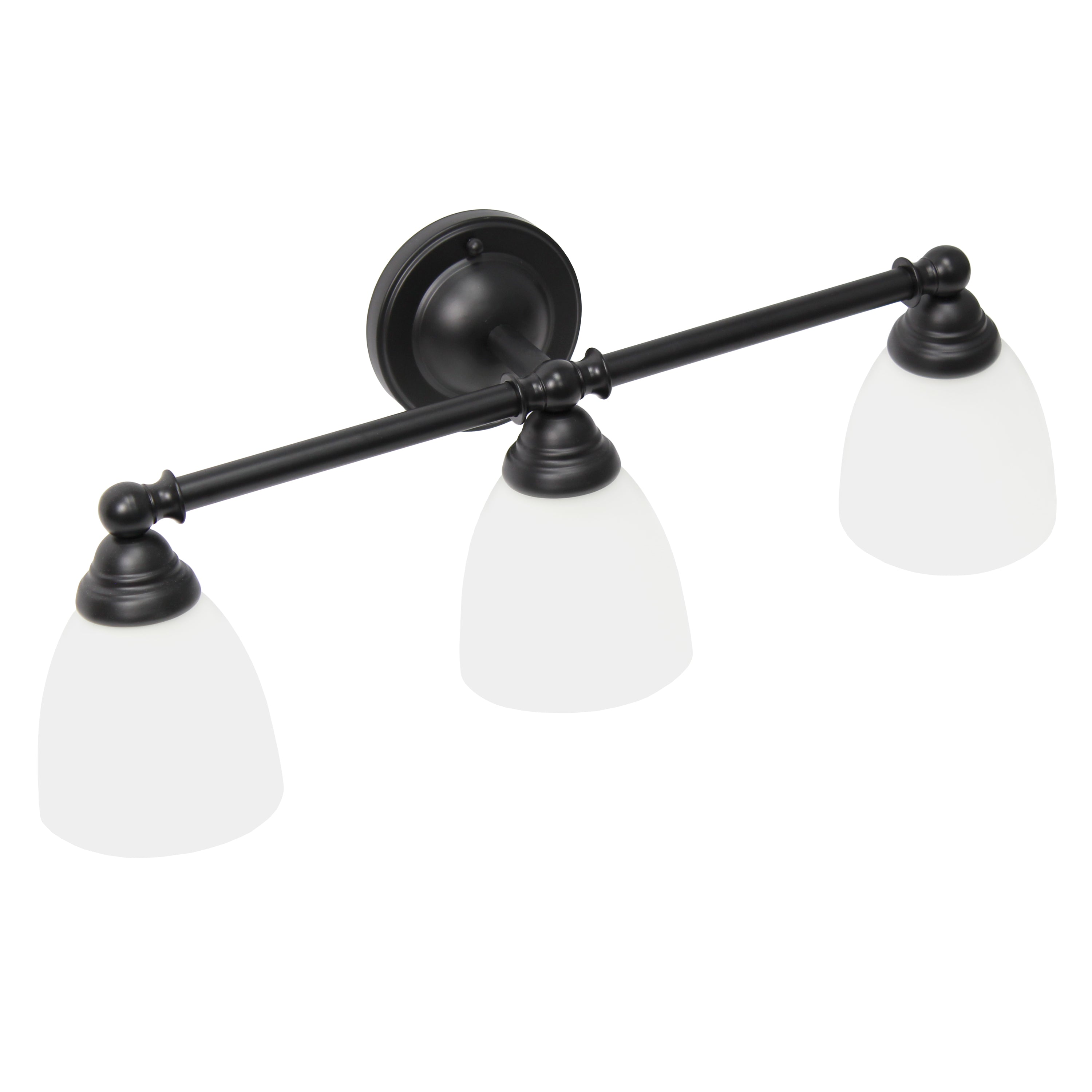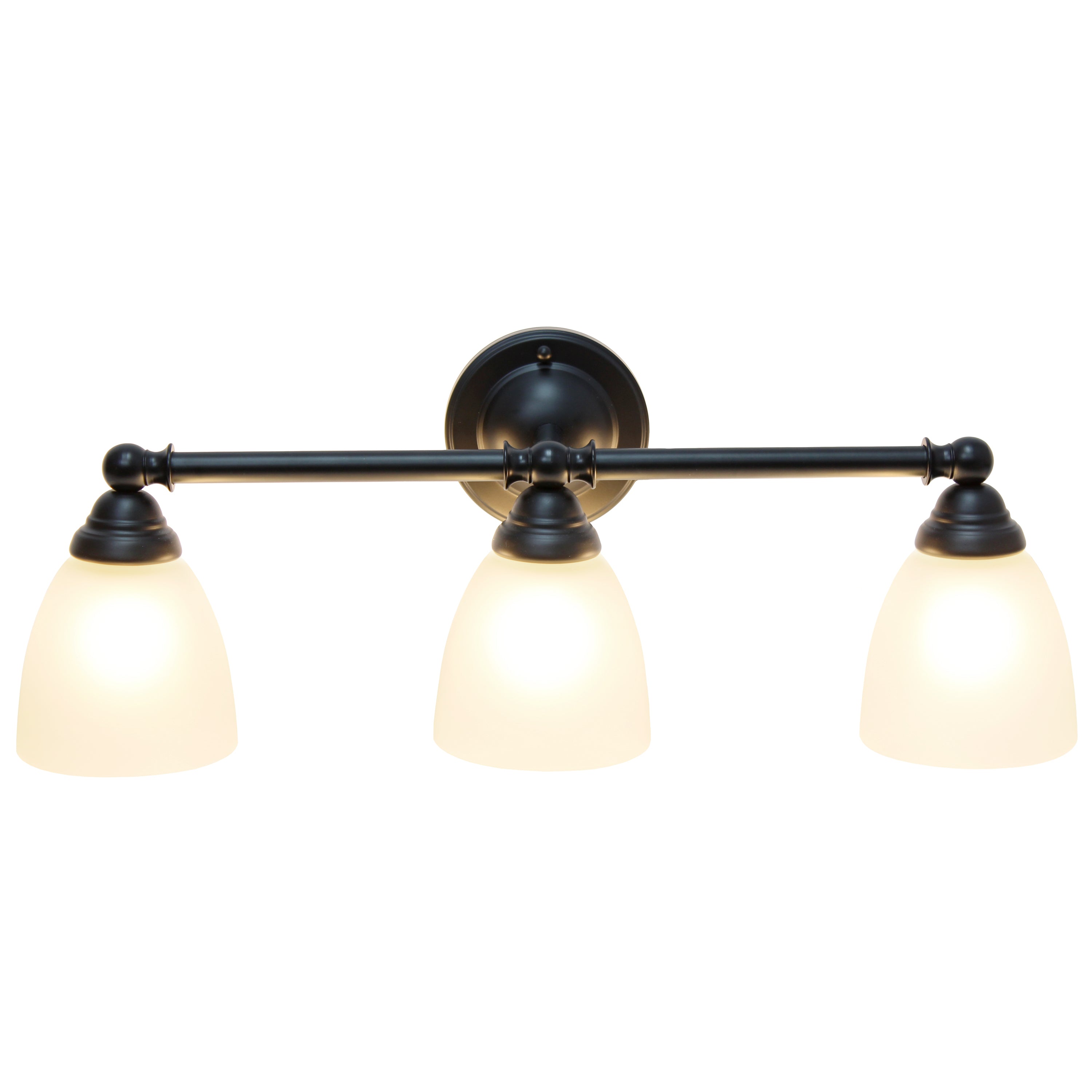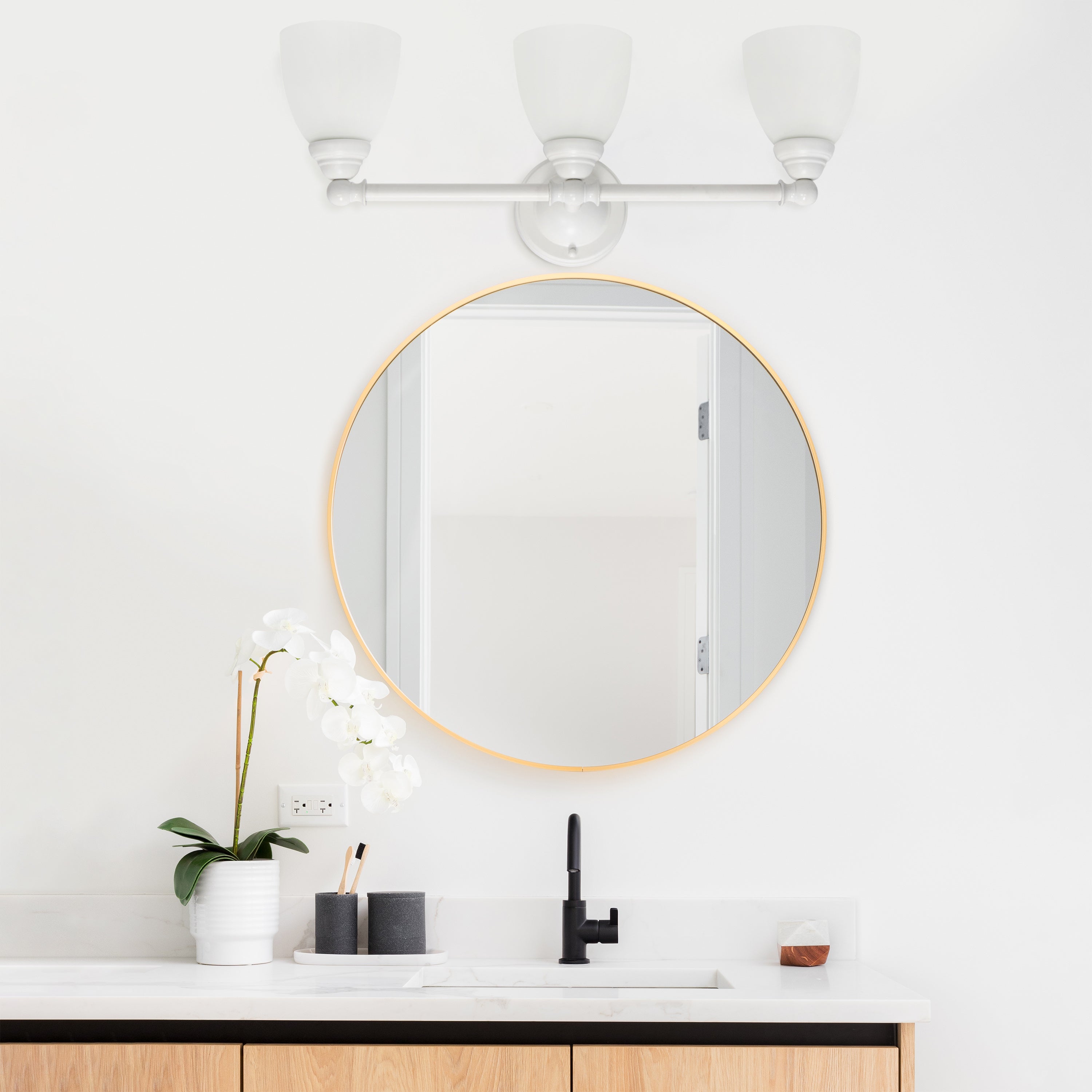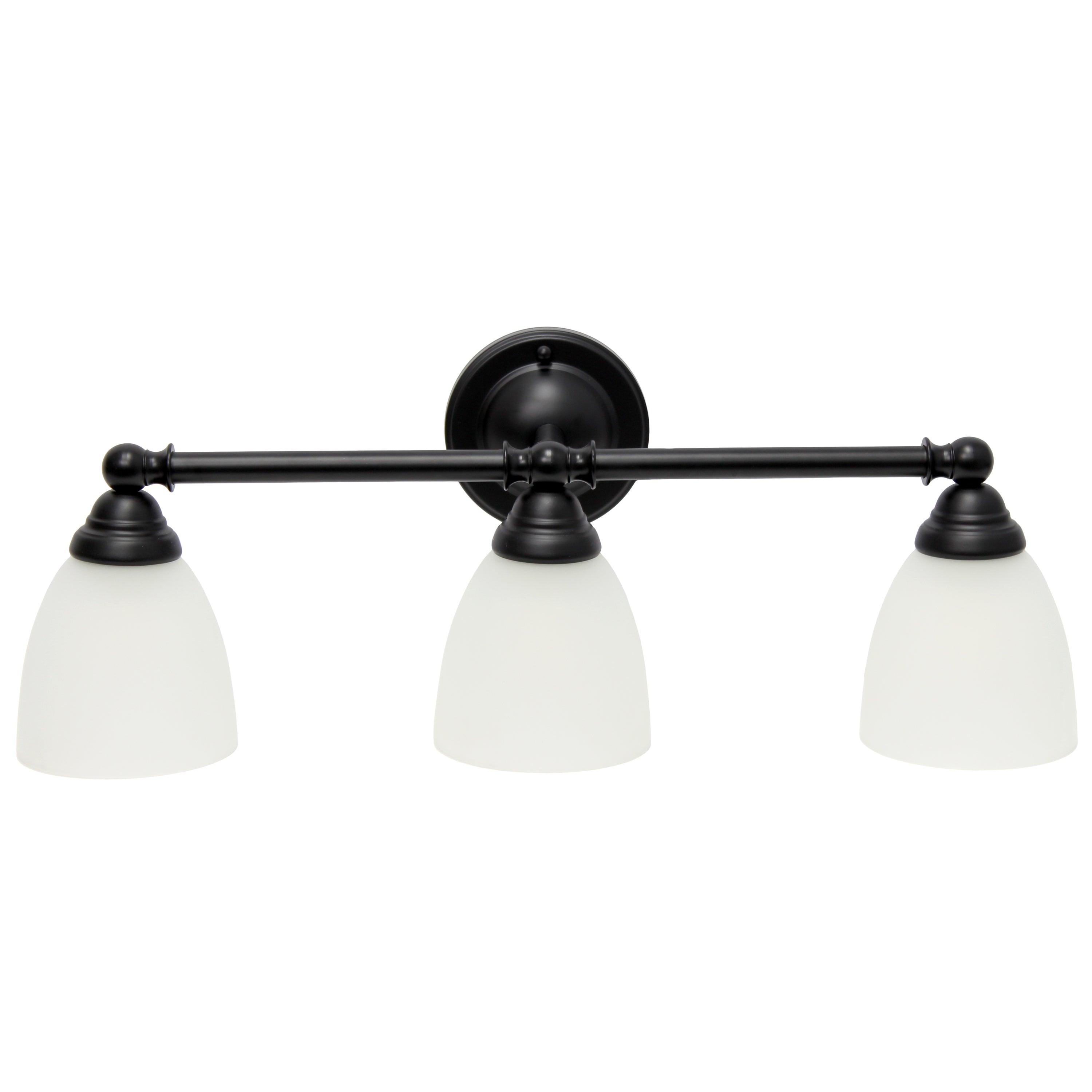 This lovely three light vanity fixture has been carefully designed to serve both your lighting and decor needs in a sophisticated, yet traditional manner. Three identical translucent shades are held in place on a straight metal bar by matching metal socket holders in the finish of your choice. Perfect for your bathroom, hallway, bedroom, foyer, or above your vanity!