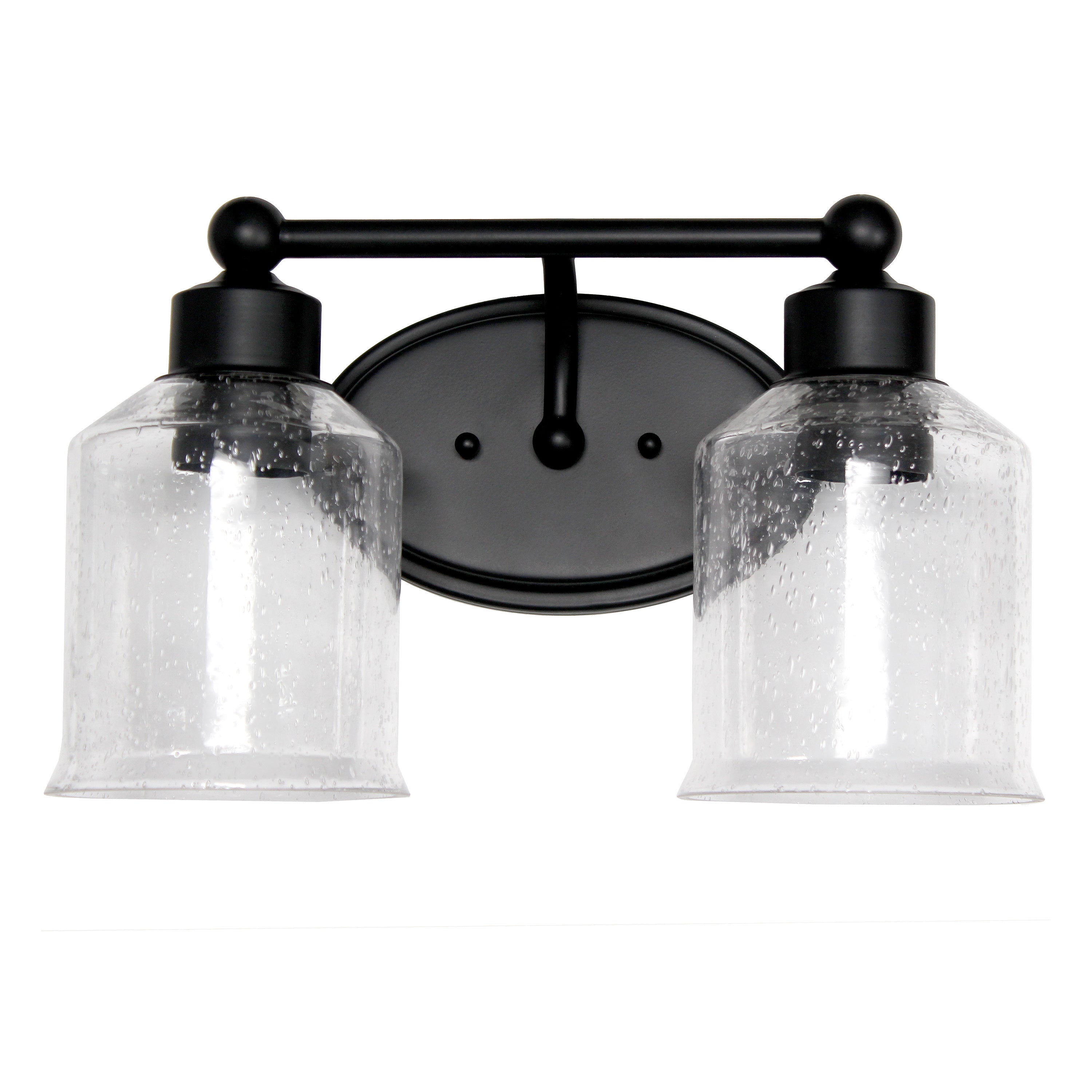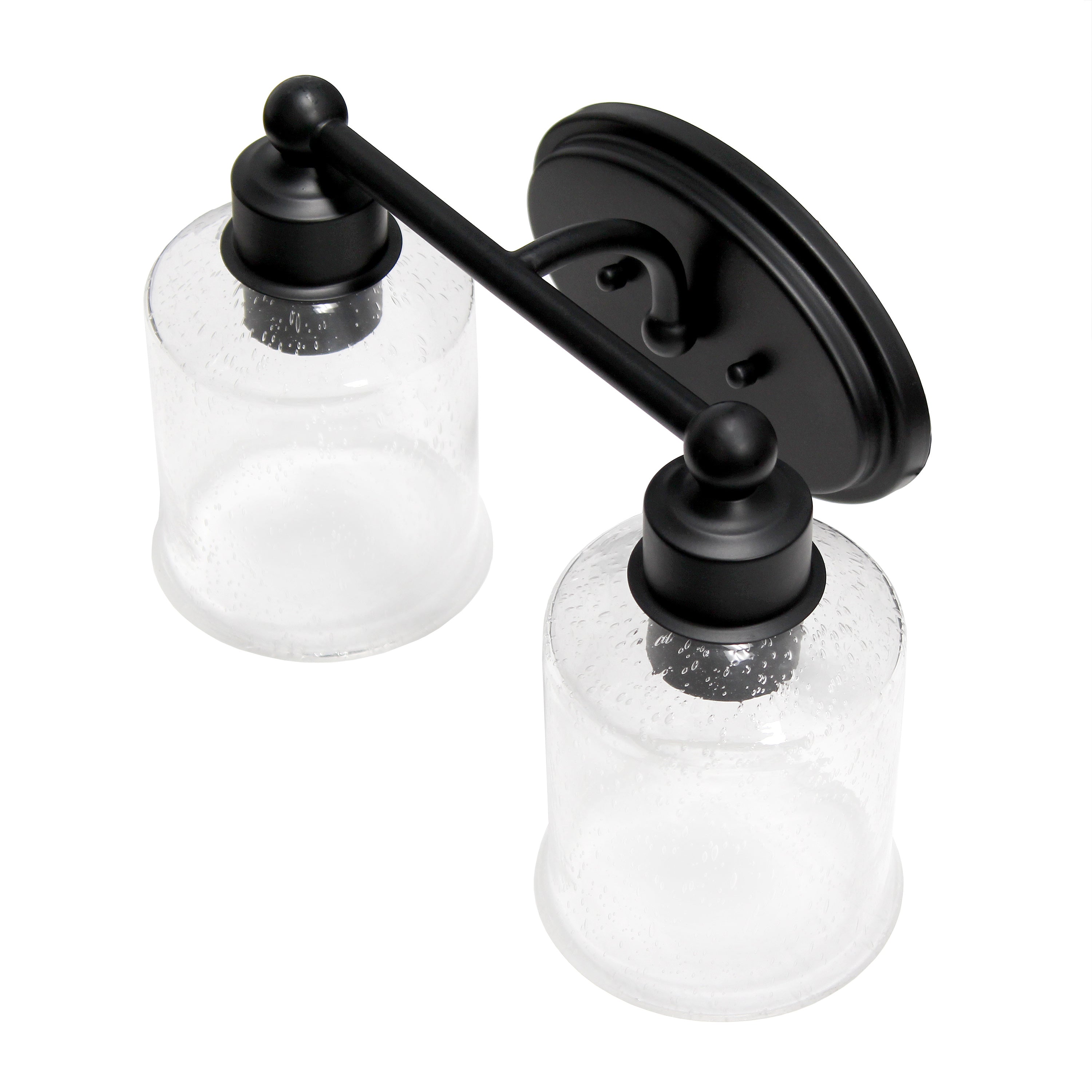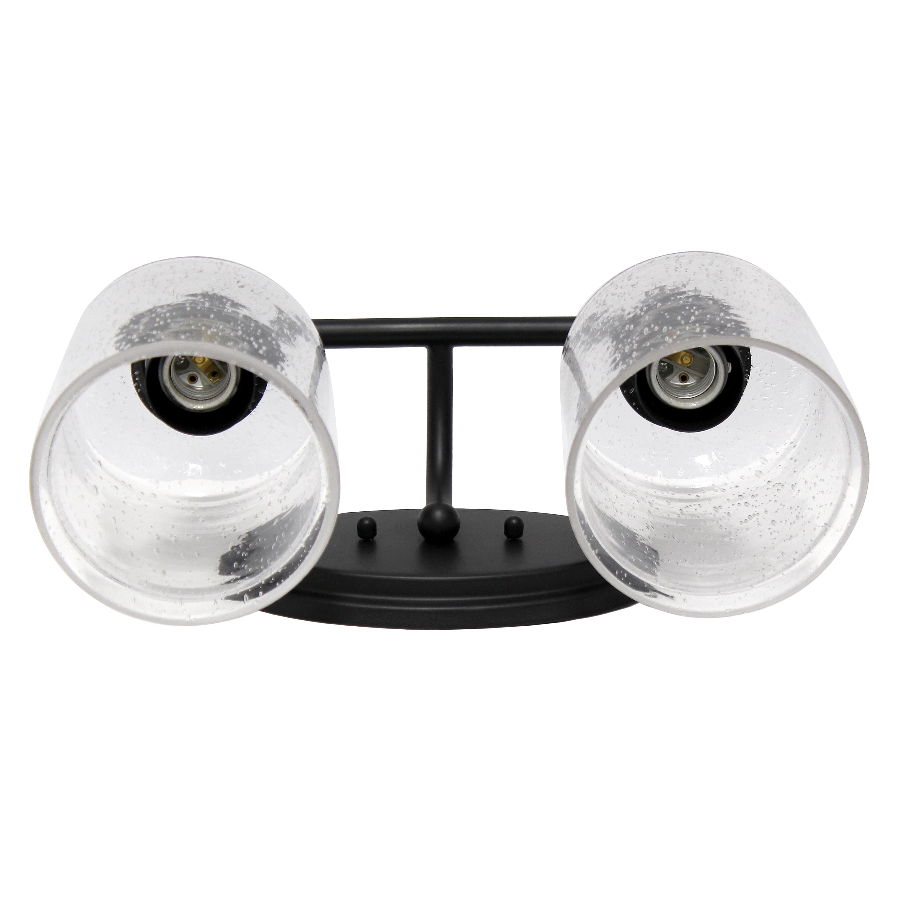Add some life into your decor with this beautiful two light vanity made of metal and glass, designed to mount easily onto your wall. Its sleek black finish compliments the seeded clear glass shades to enhance your home or office decor while illuminating the space perfectly. Modernly designed, but capable of flattering just about any style of decor.