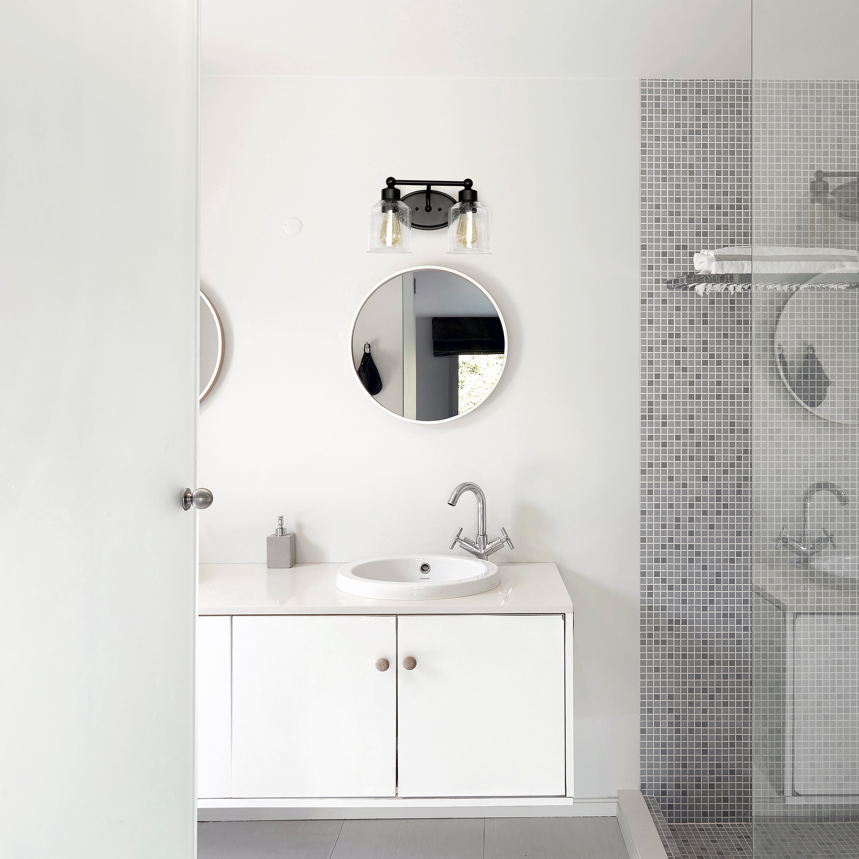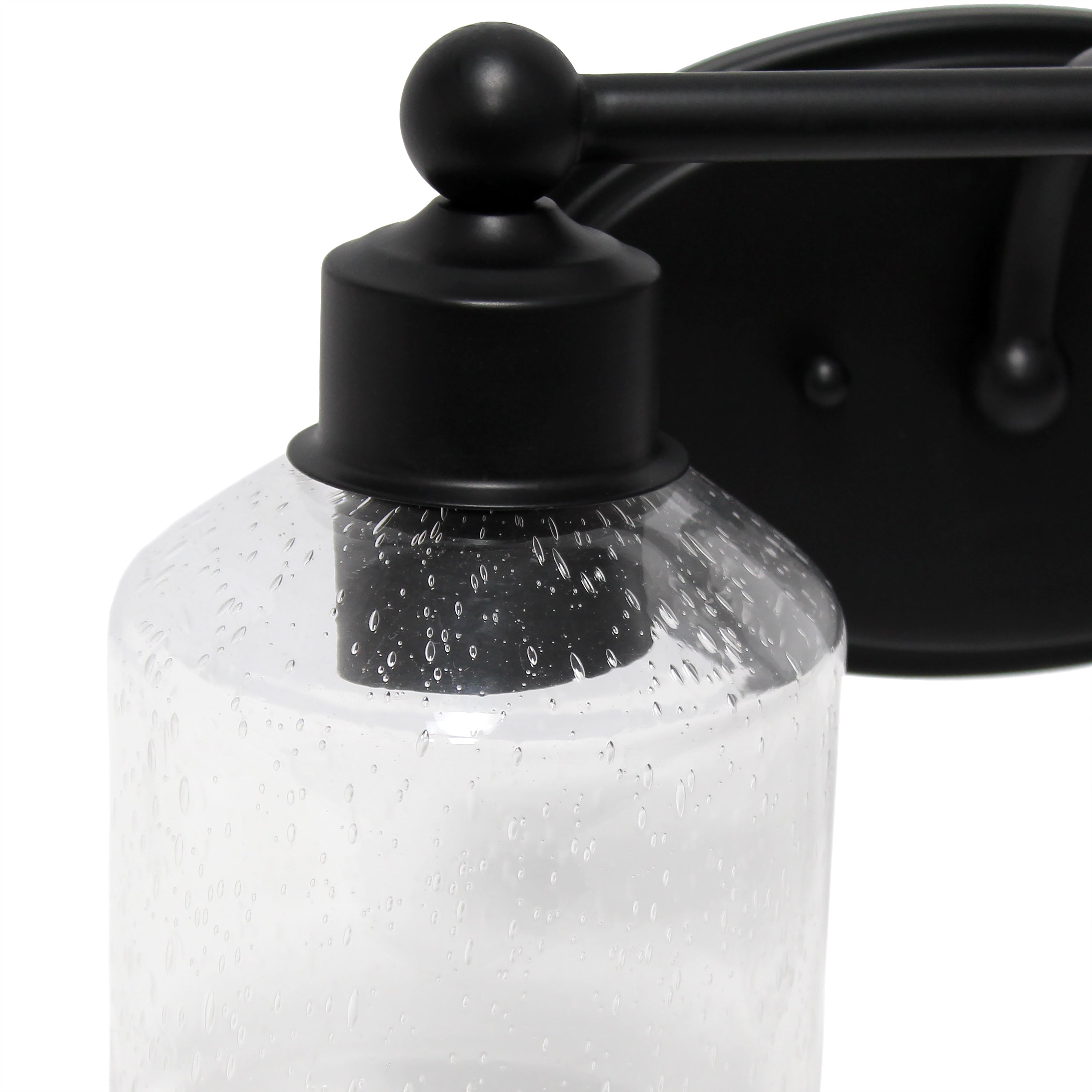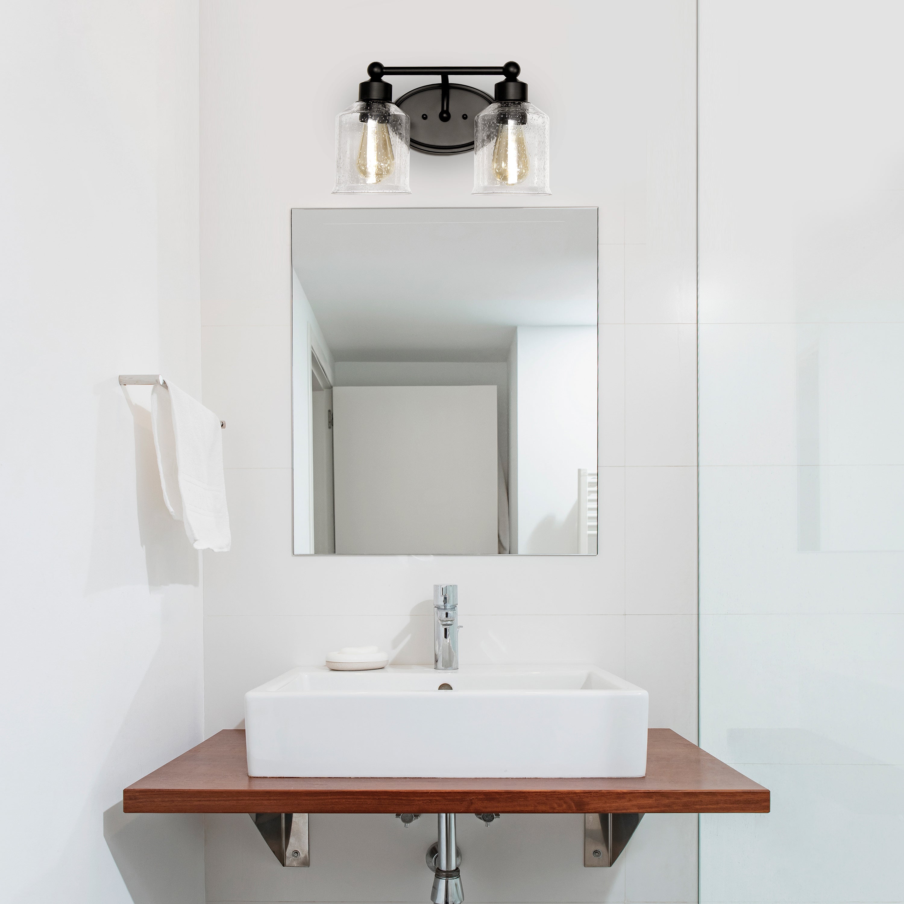Add some life into your decor with this beautiful two light vanity made of metal and glass, designed to mount easily onto your wall. Its sleek black finish compliments the seeded clear glass shades to enhance your home or office decor while illuminating the space perfectly. Modernly designed, but capable of flattering just about any style of decor.