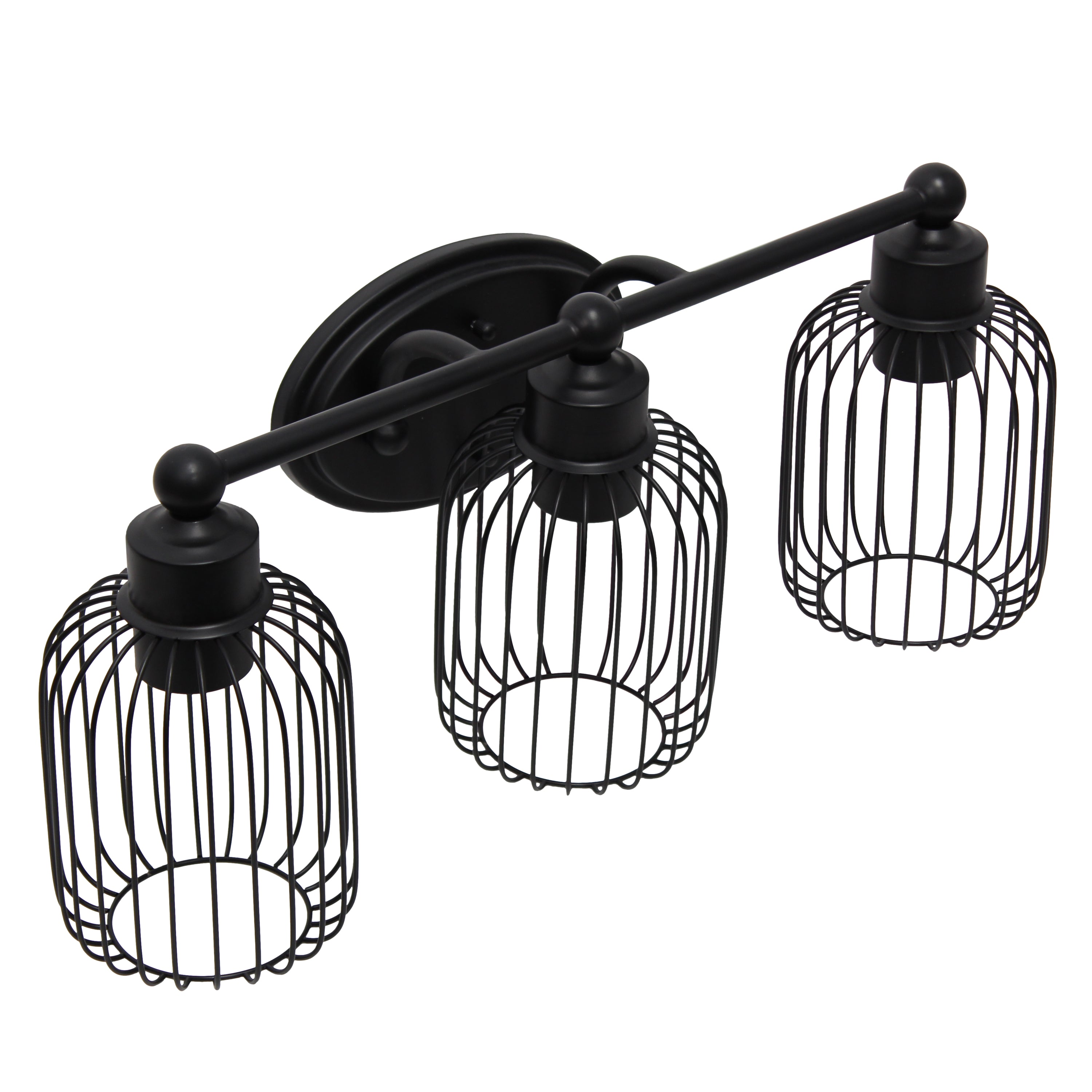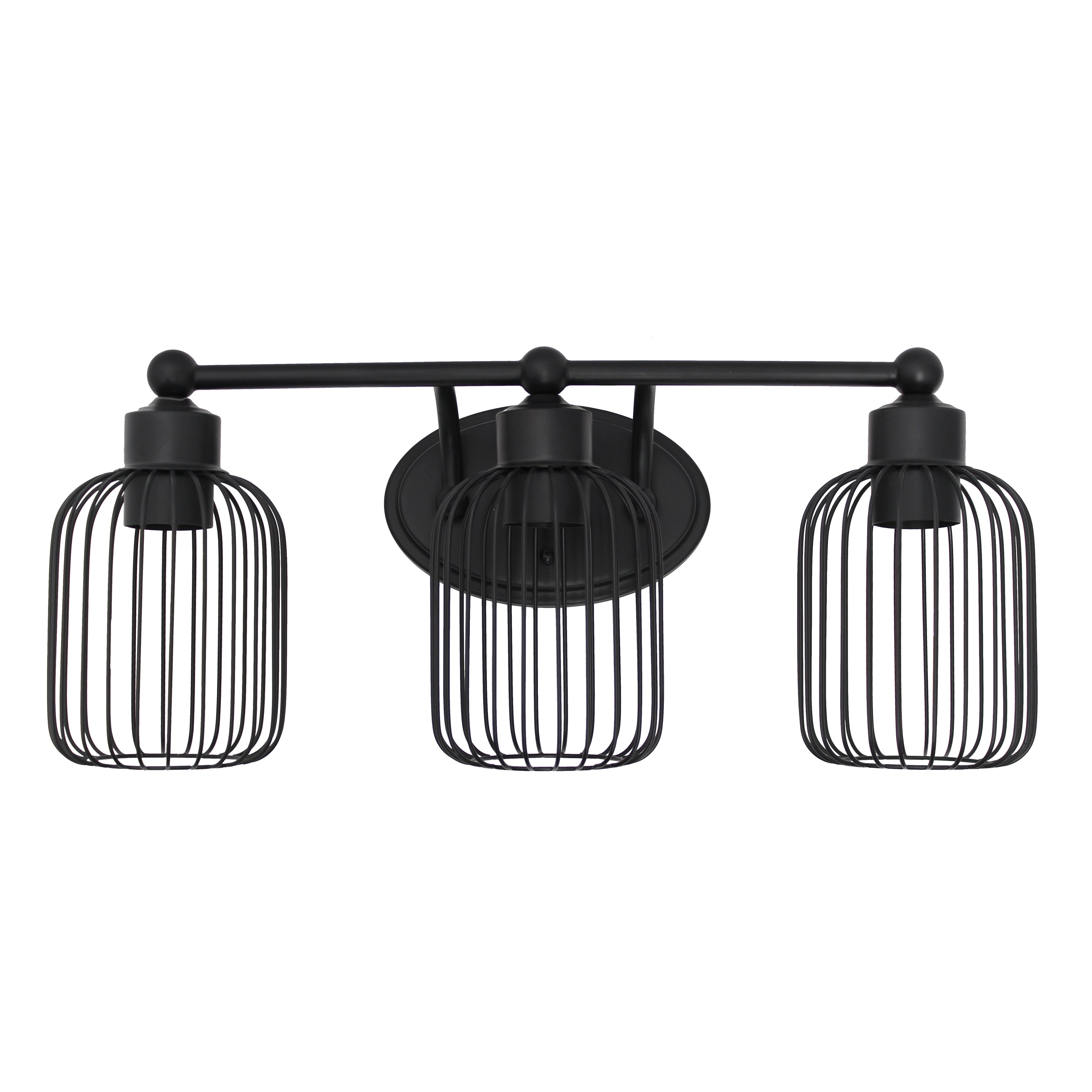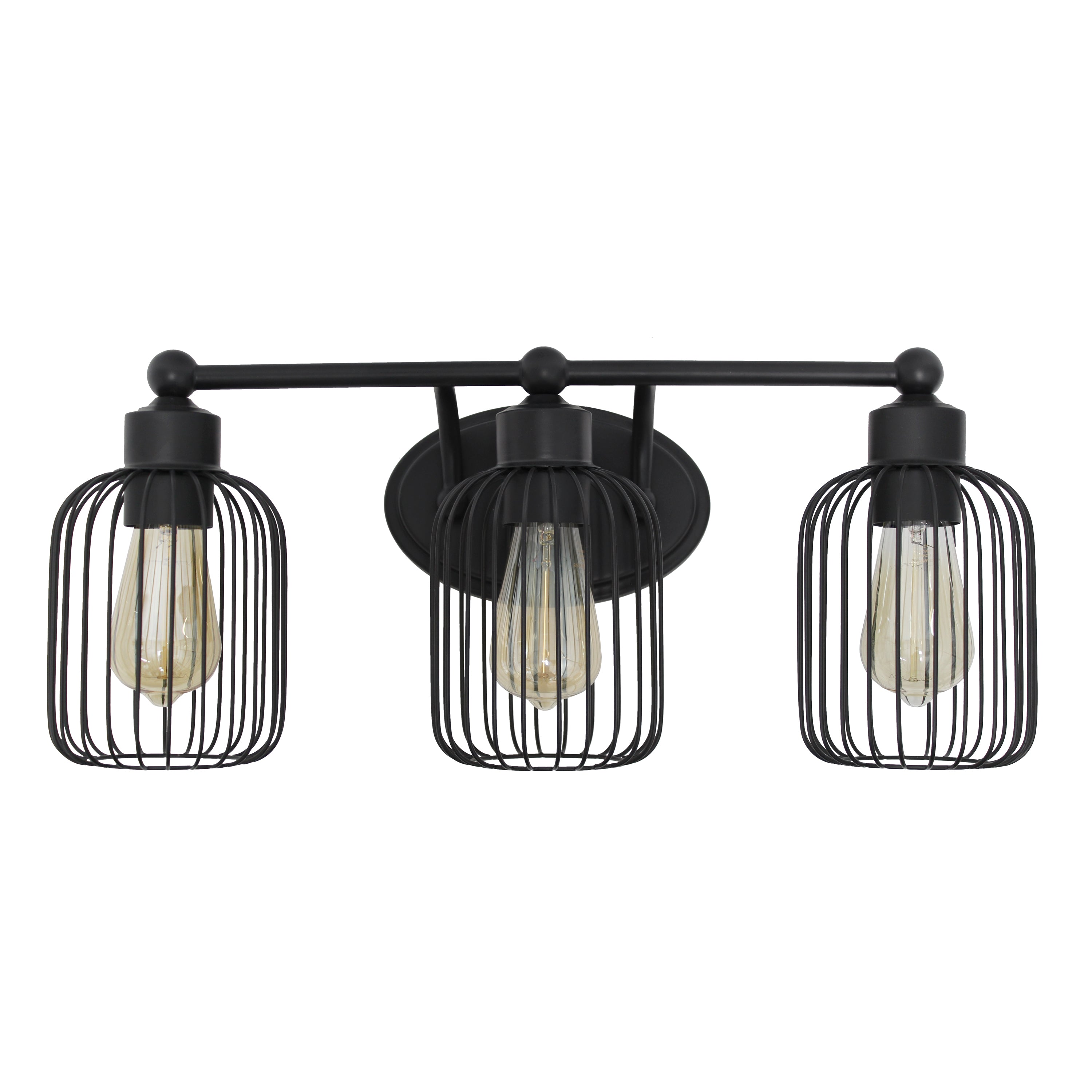 Carefully constructed with both tradition and on trend designs in mind, this all black caged style three light vanity is just what you need in your home and/or office. Equipped to easily mount onto the wall of your choice, this piece will enhance your decor all while lighting up the room adequately with the open cage design of the fixture. Check out all of the Ironhouse collection fixtures to combine vanity, wall sconce and pendant lighting to match into your space.