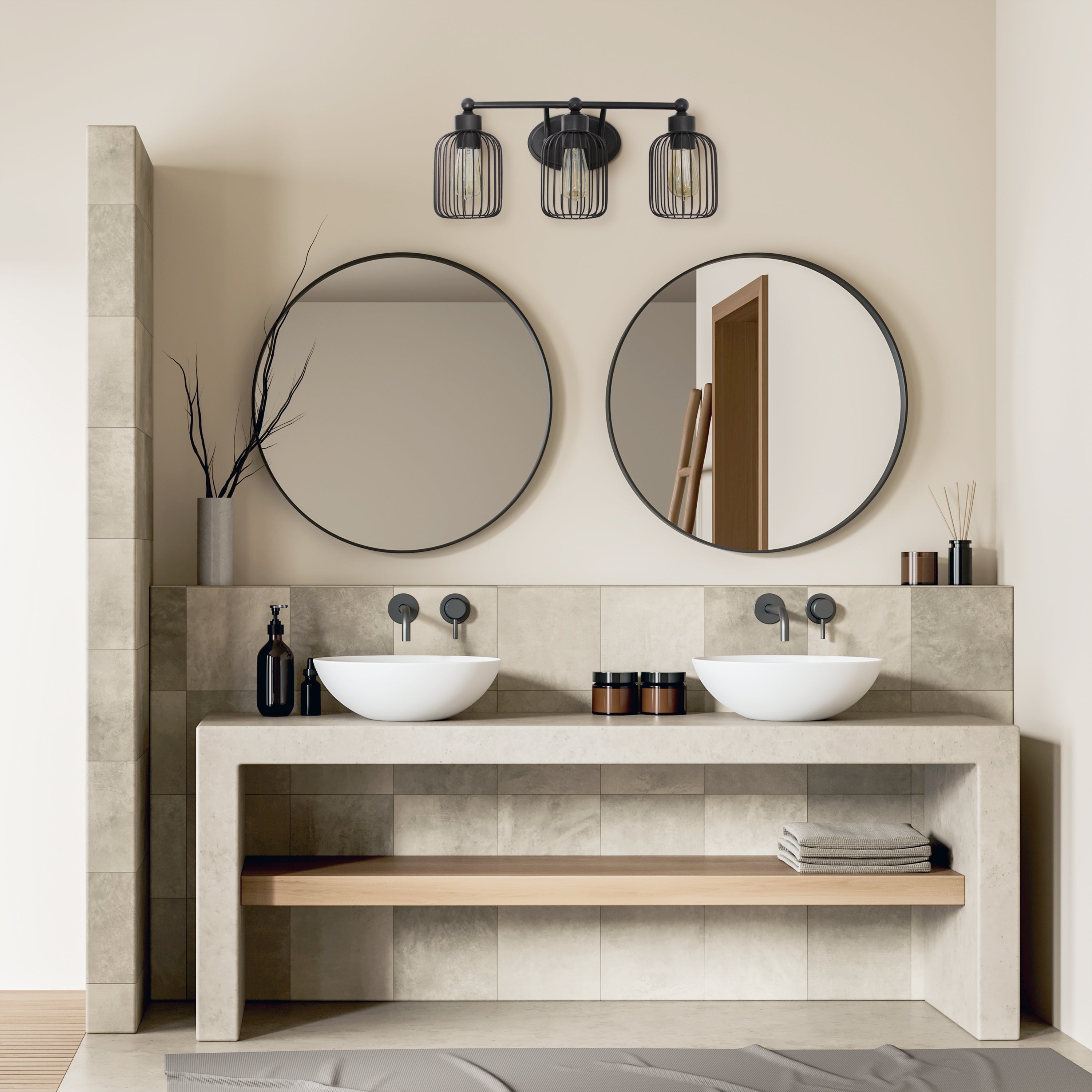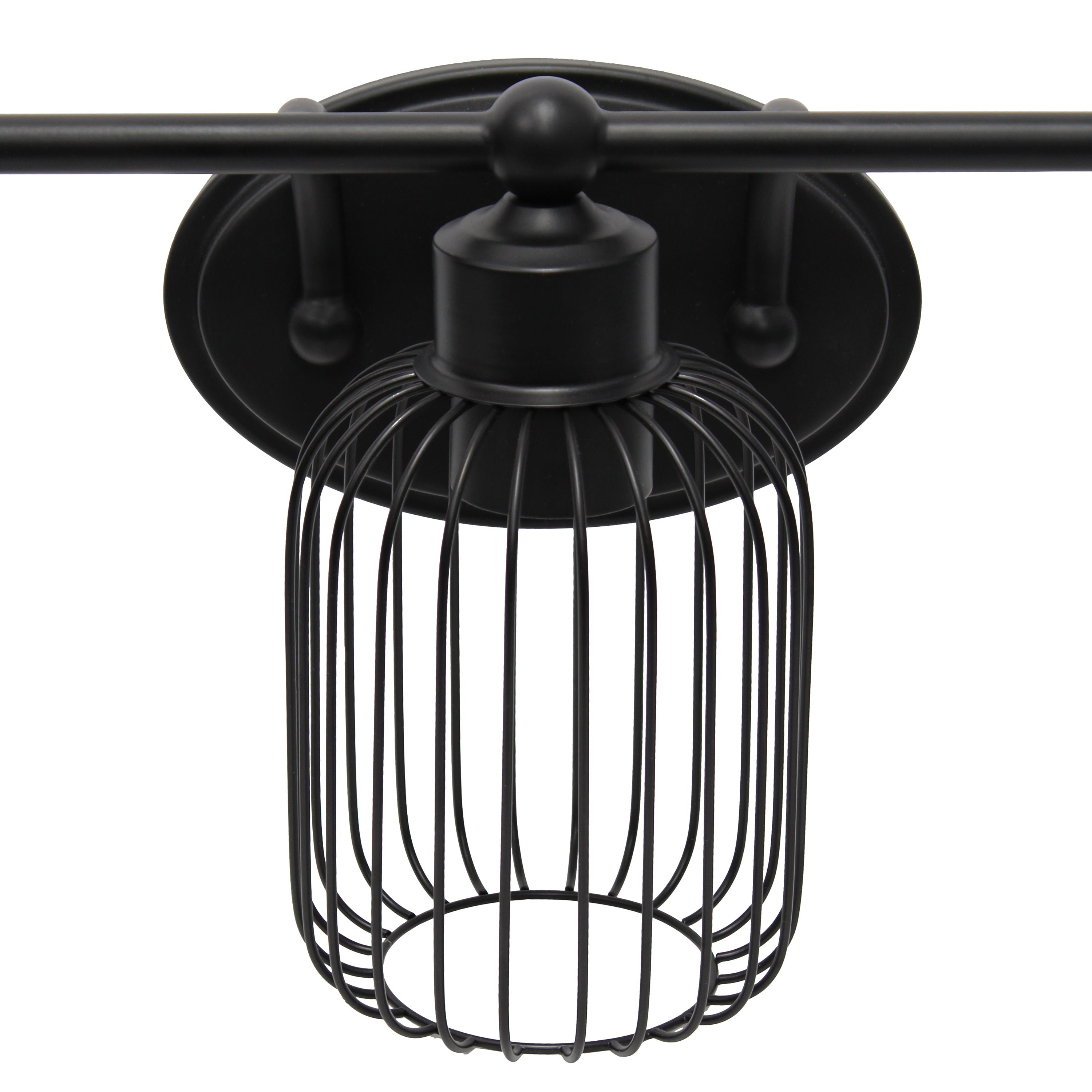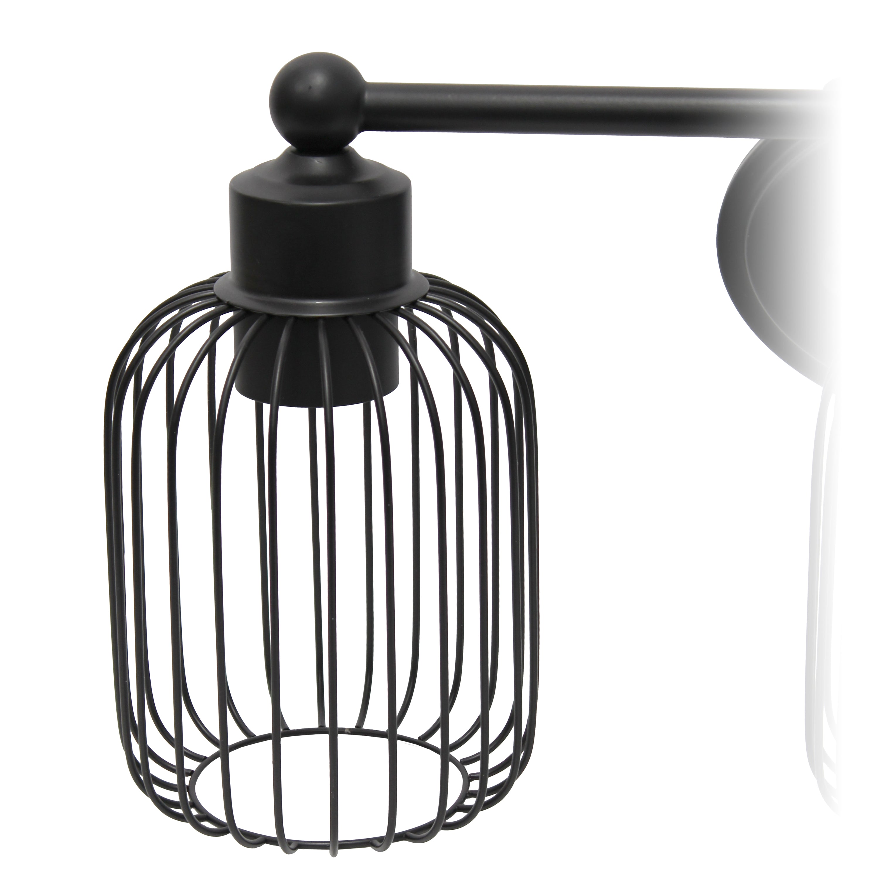 Carefully constructed with both tradition and on trend designs in mind, this all black caged style three light vanity is just what you need in your home and/or office. Equipped to easily mount onto the wall of your choice, this piece will enhance your decor all while lighting up the room adequately with the open cage design of the fixture. Check out all of the Ironhouse collection fixtures to combine vanity, wall sconce and pendant lighting to match into your space.
