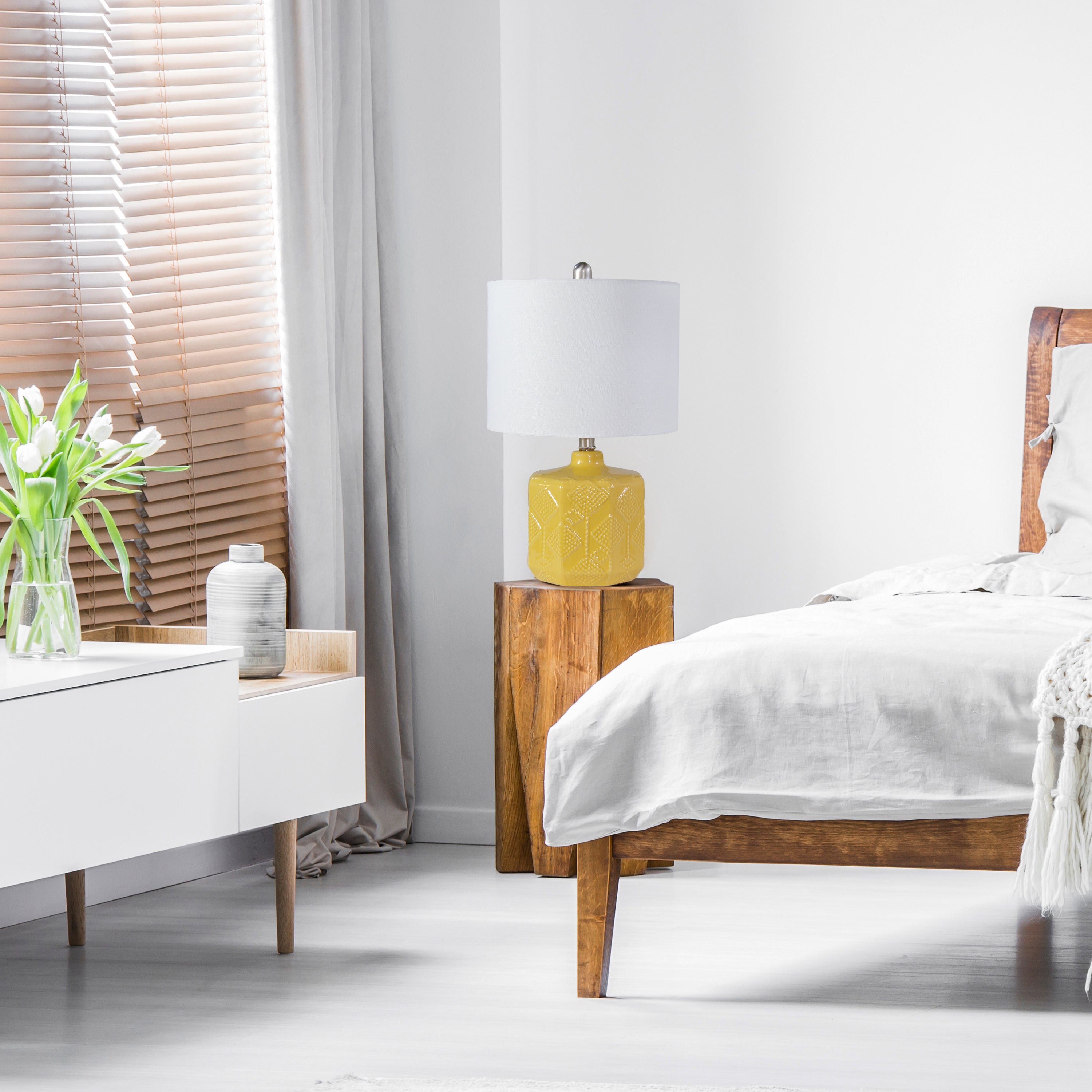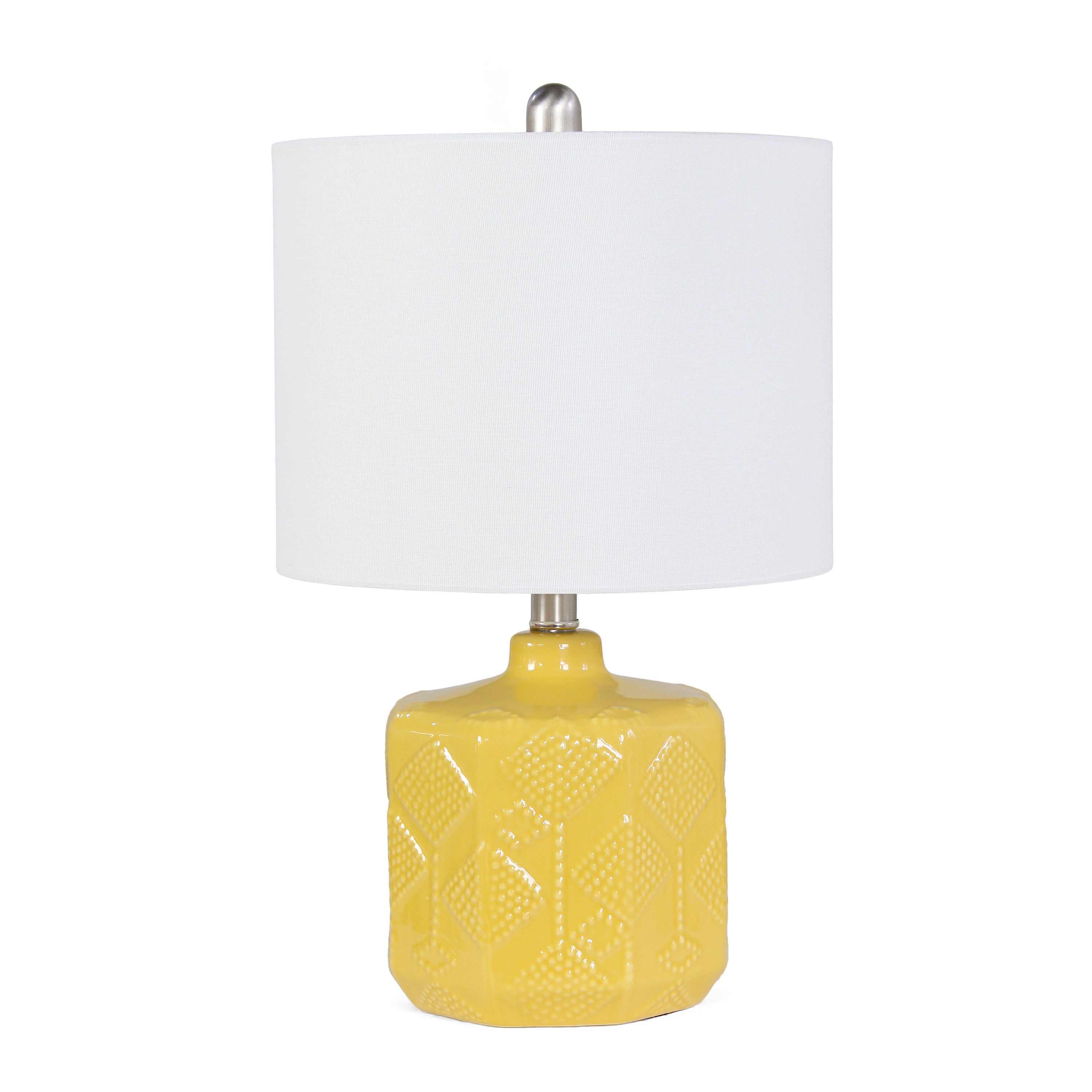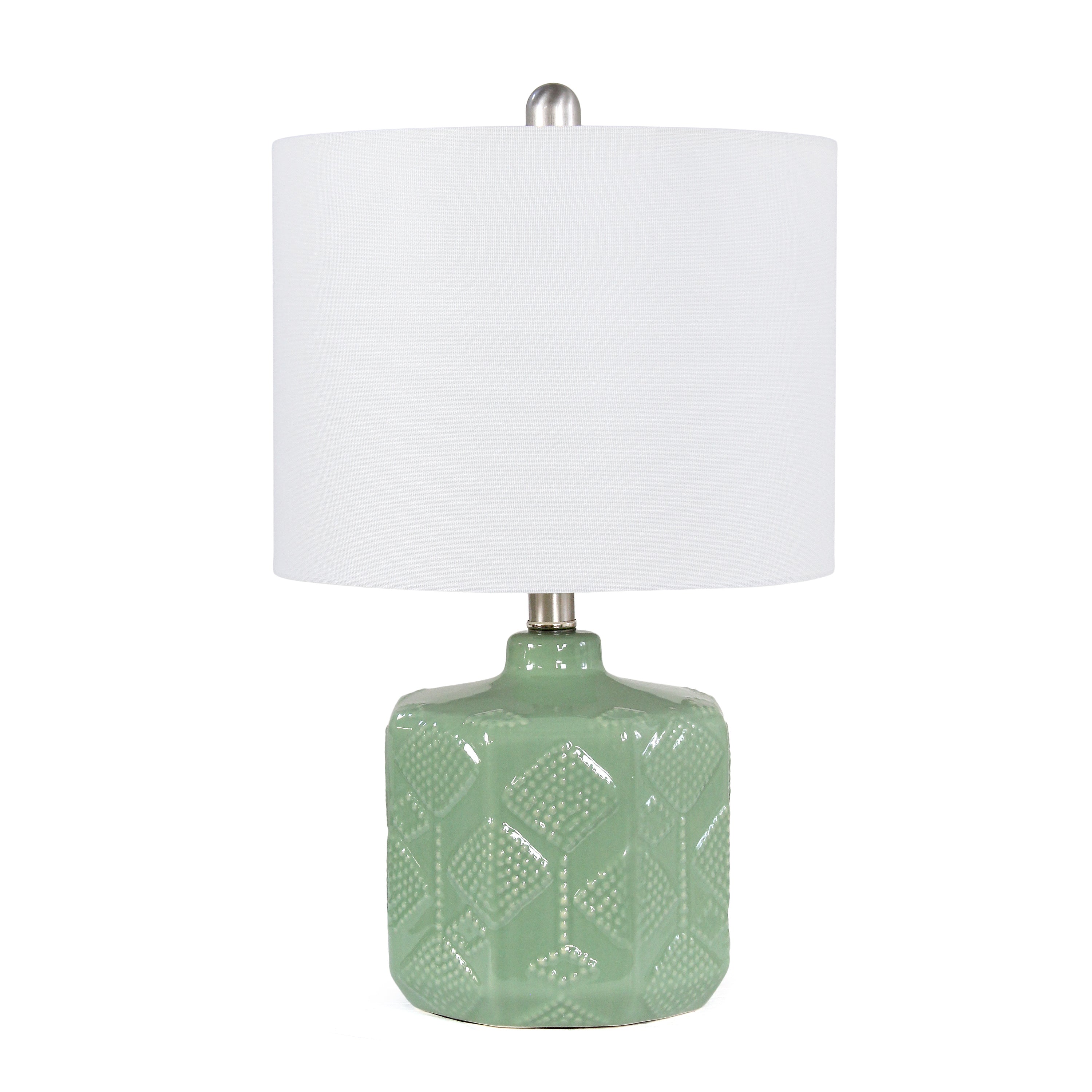 Adorn your space with this beautifully crafted ceramic table lamp. Aesthetically designed with an angular base and embellished with a floral studded texture adding elegance to your space. The white fabric drum shade accents the off-white finish for a clean, fresh look. Perfectly designed for your bedroom nightstand or home office or use as an accent piece in a common area such as your living room or foyer.