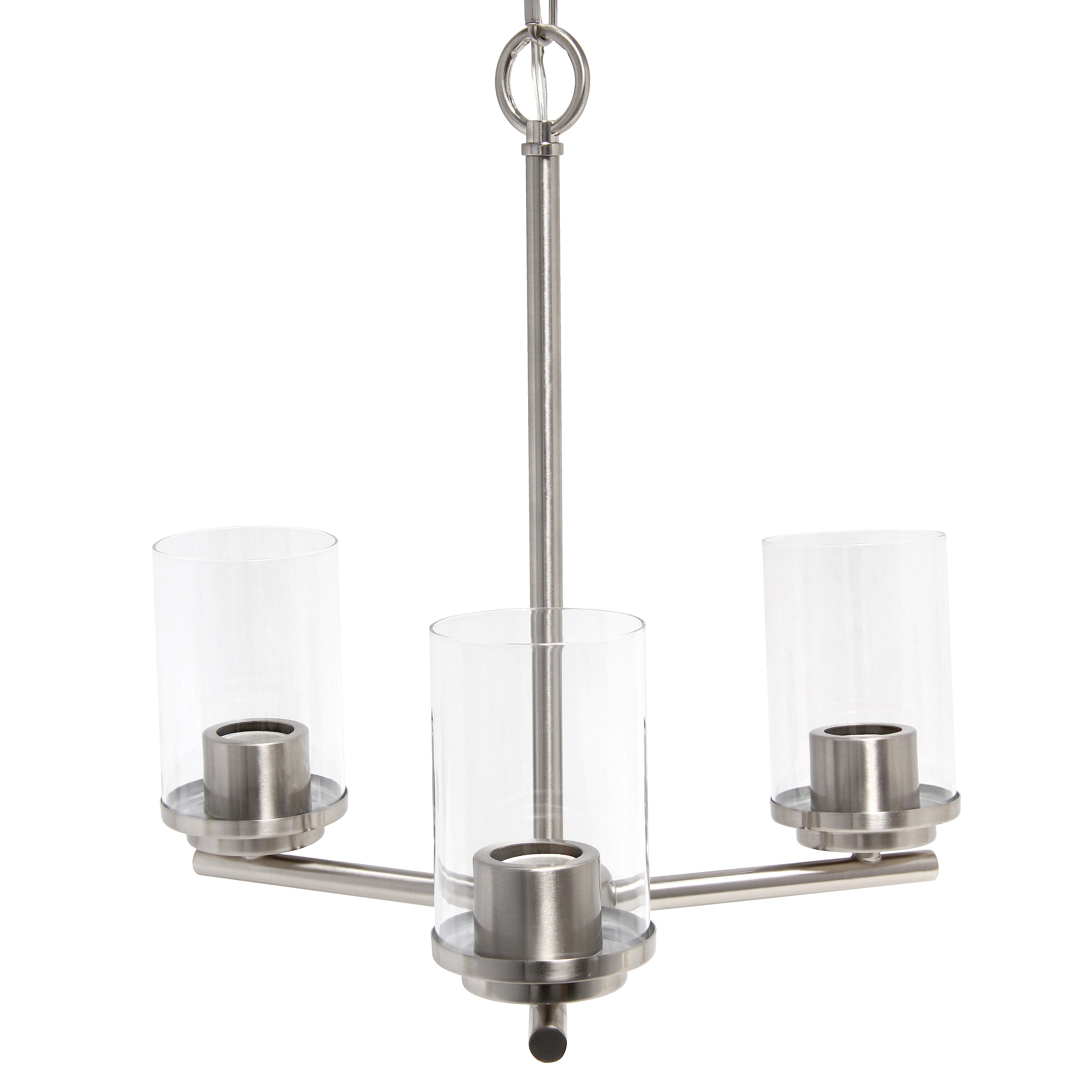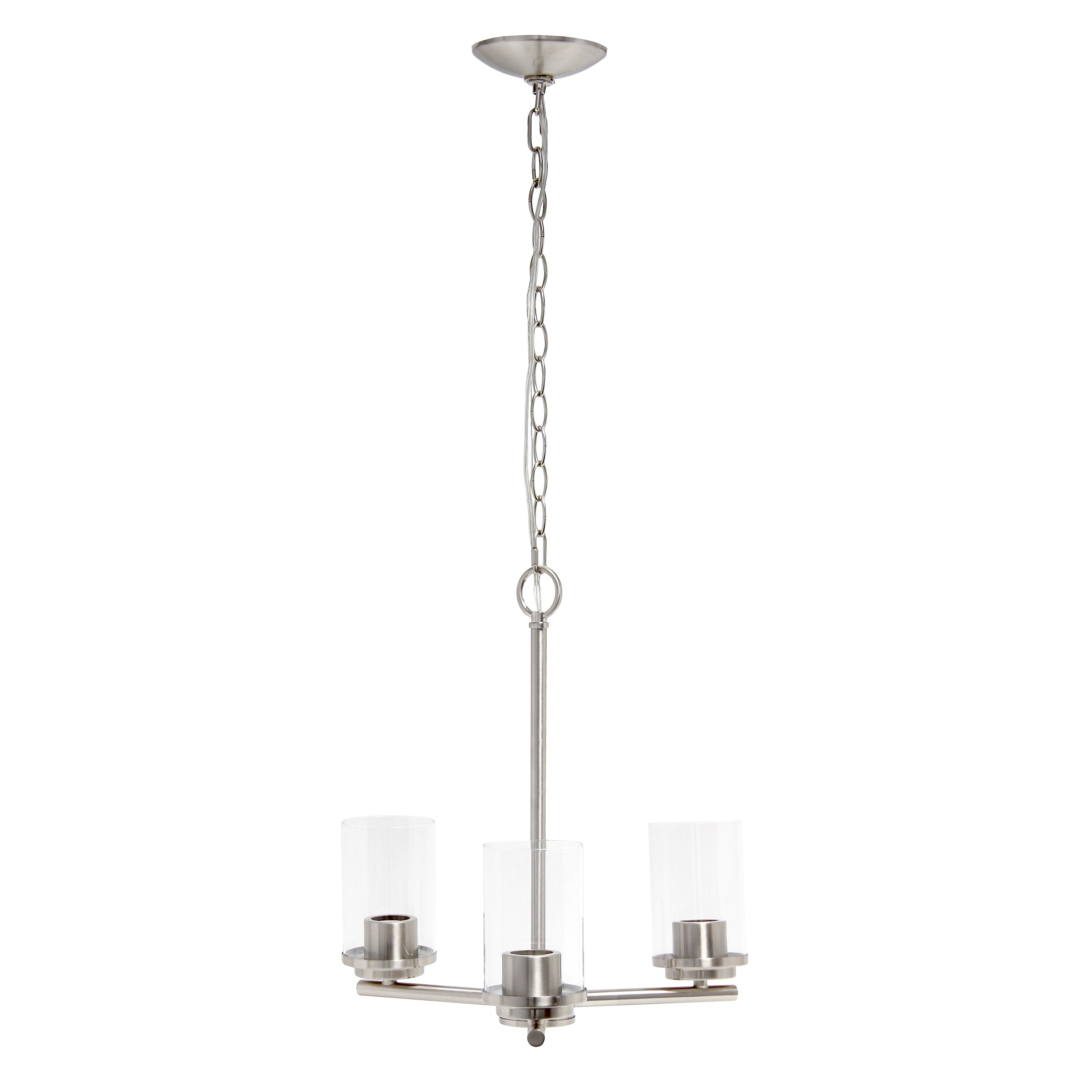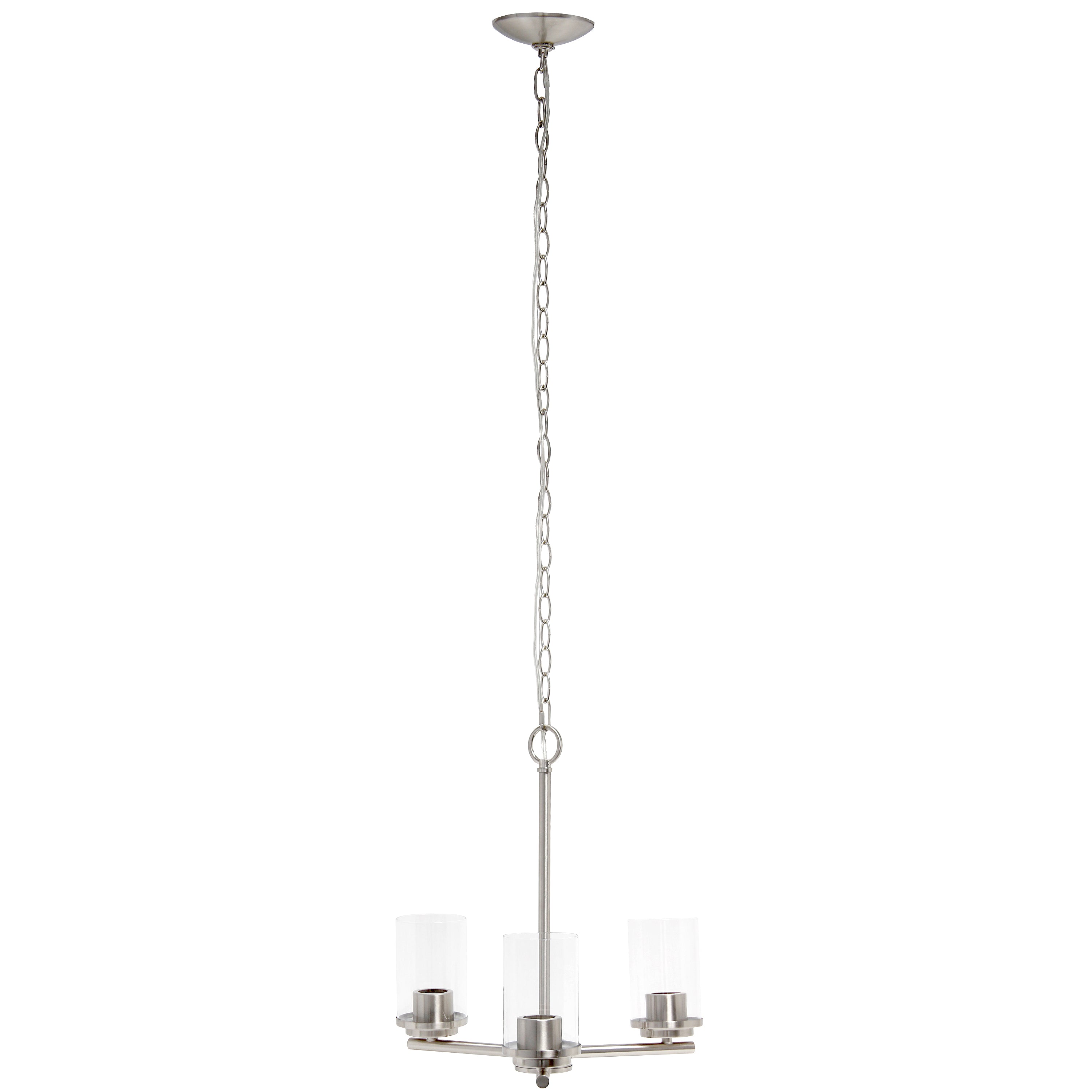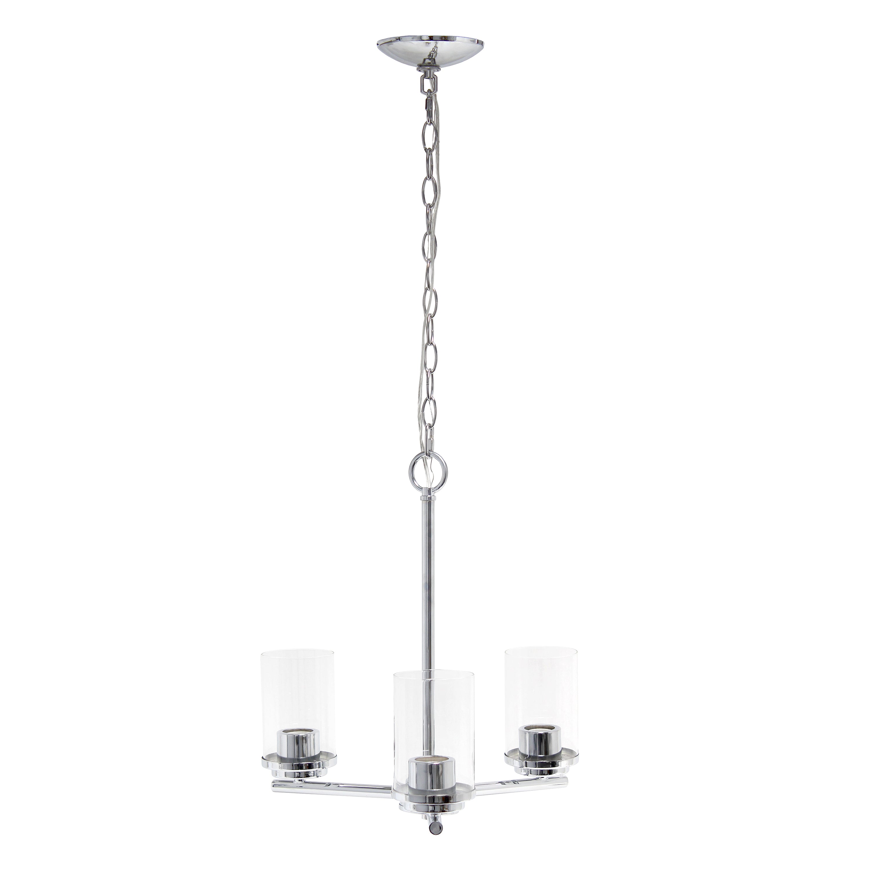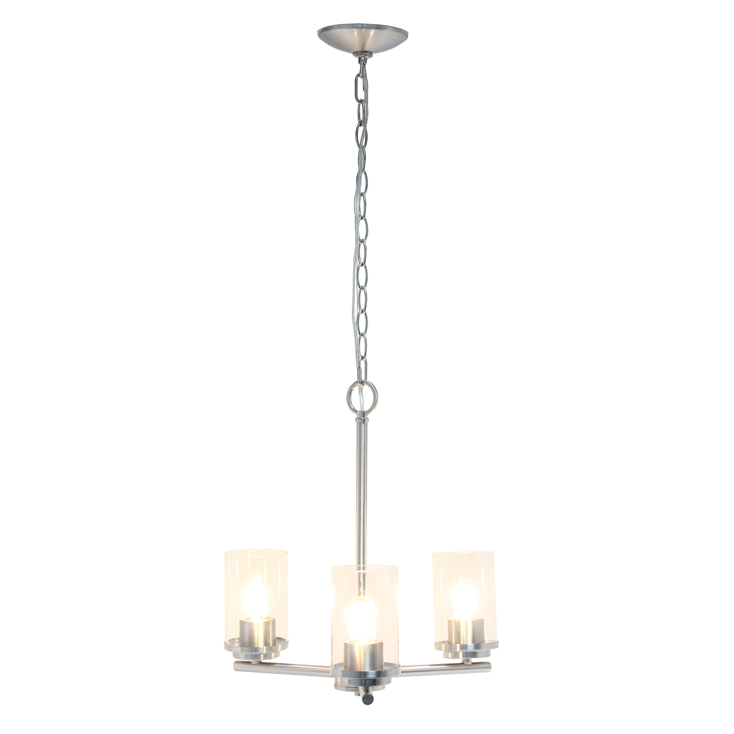 The smooth metal finish and simple clear glass shades on this three-light pendant come together and create a traditional design with a modern update. Add brightness and charm to your entryway, stairwell, dining room, bedroom, office or living room with this elegant chandelier pendant fixture!