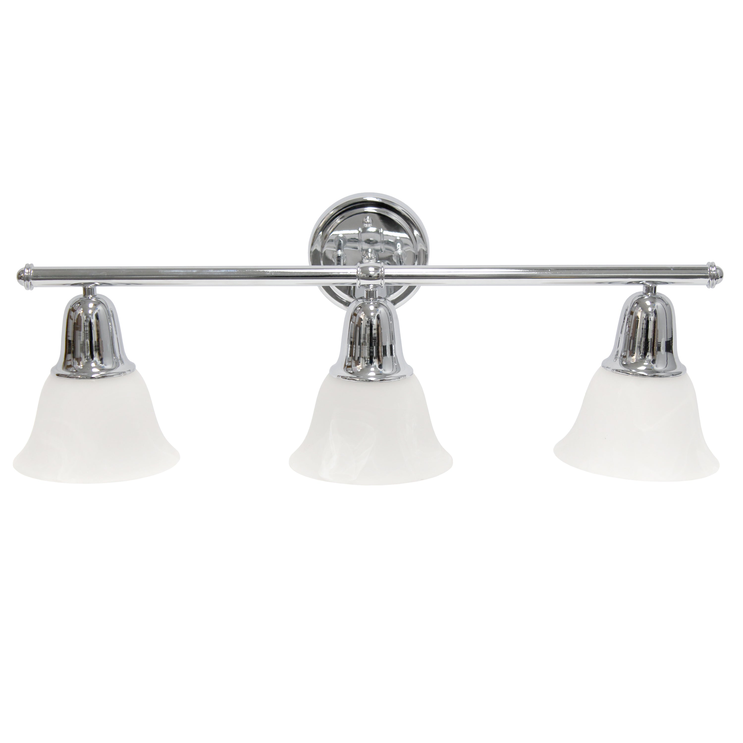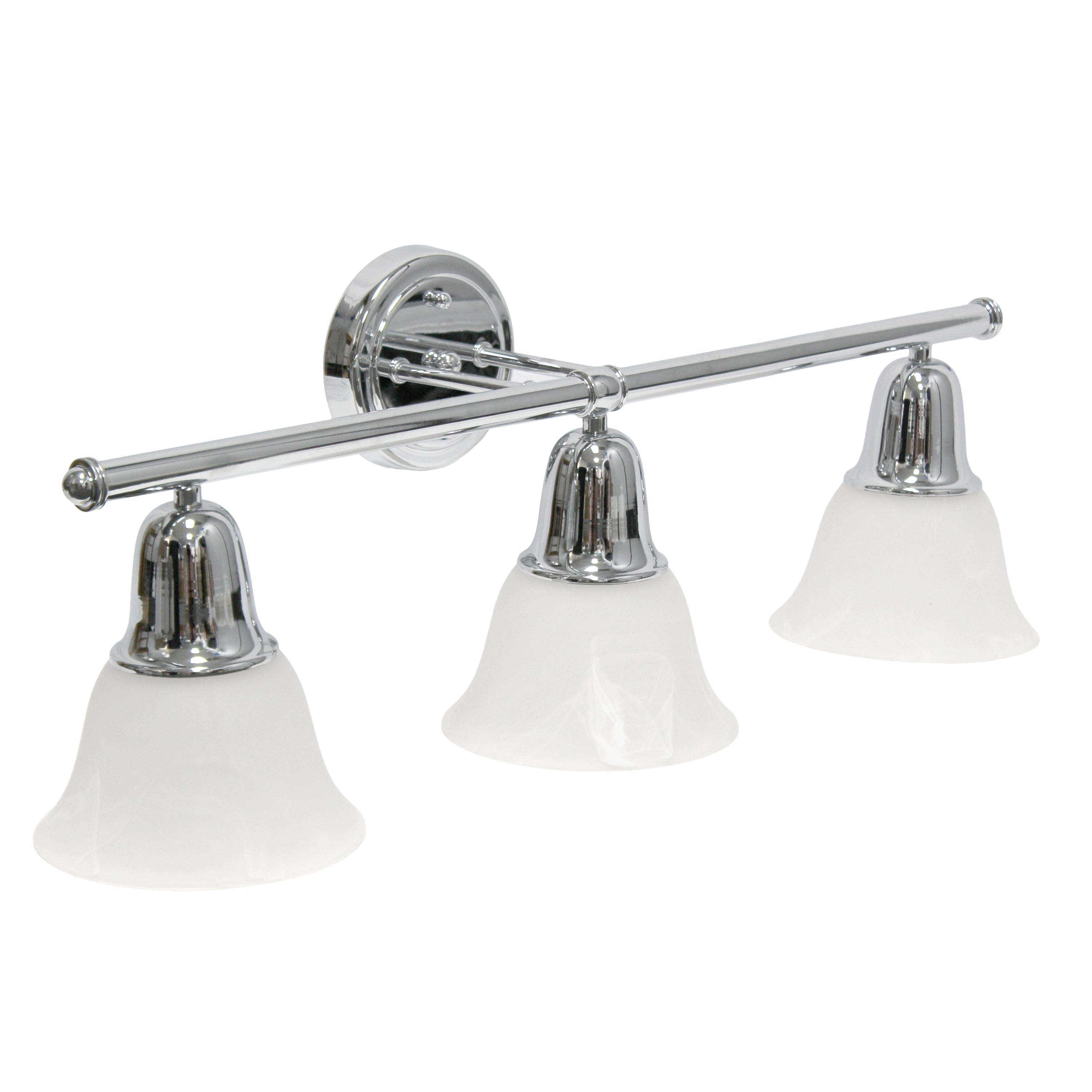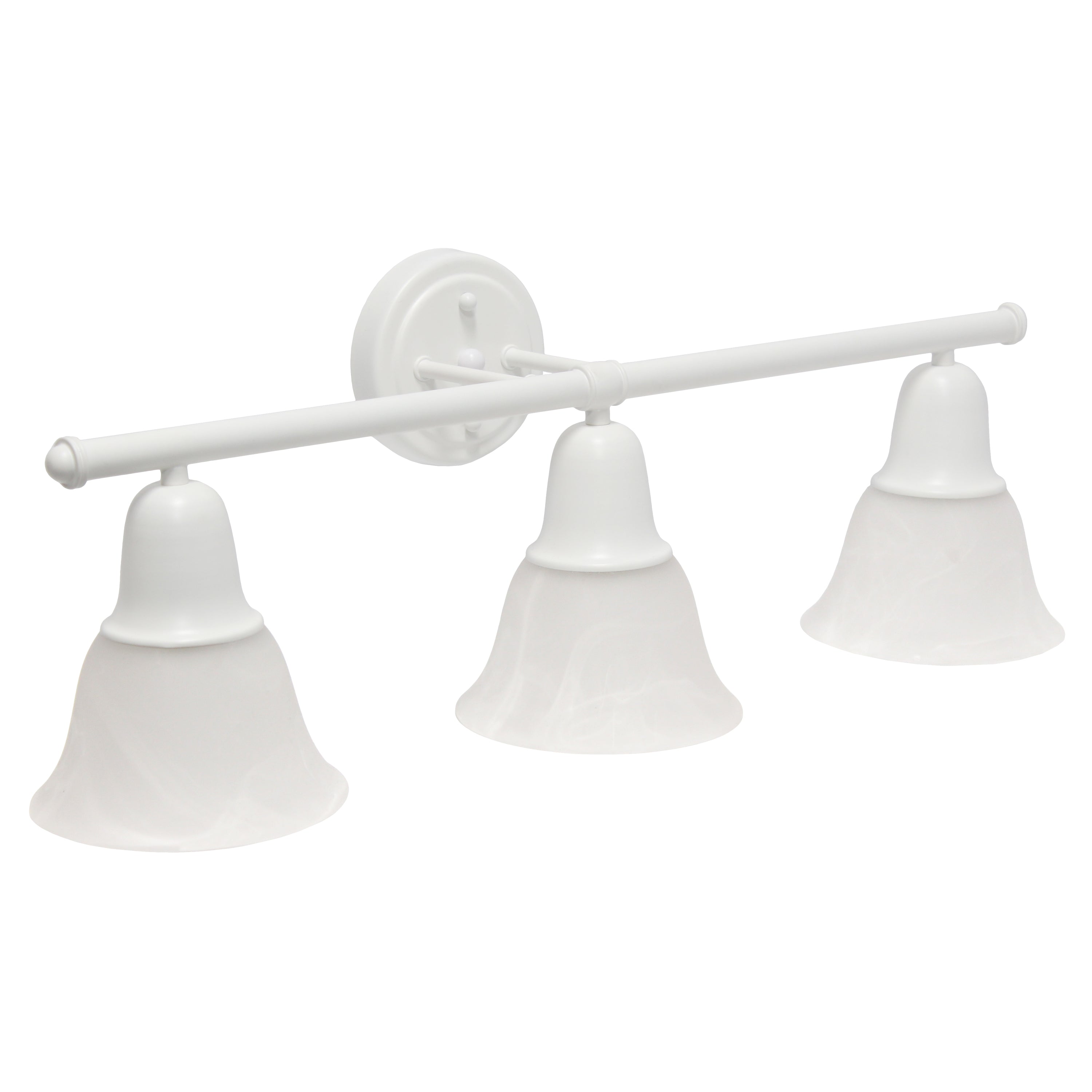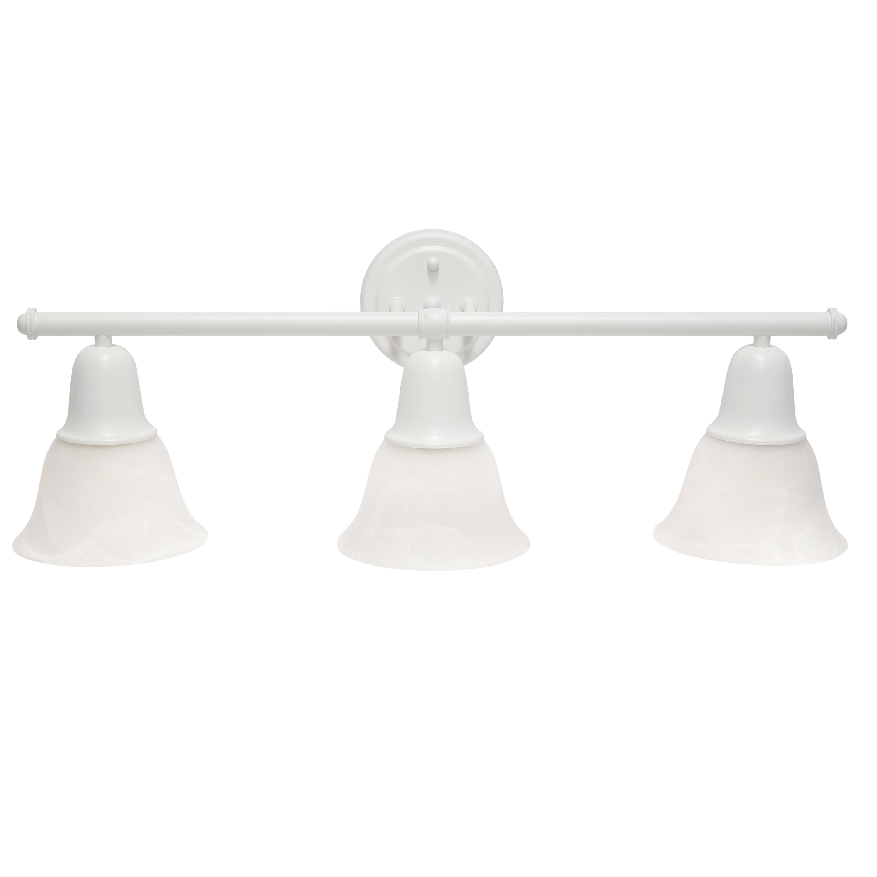 This lovely three light vanity fixture has been carefully designed to serve both your lighting and decor needs in a sophisticated and contemporary manner. Three identical alabaster white shades are held in place on a straight metal bar by matching metal socket holders in the finish of your choice. Perfect for your bathroom, hallway, bedroom, foyer, or above your vanity!