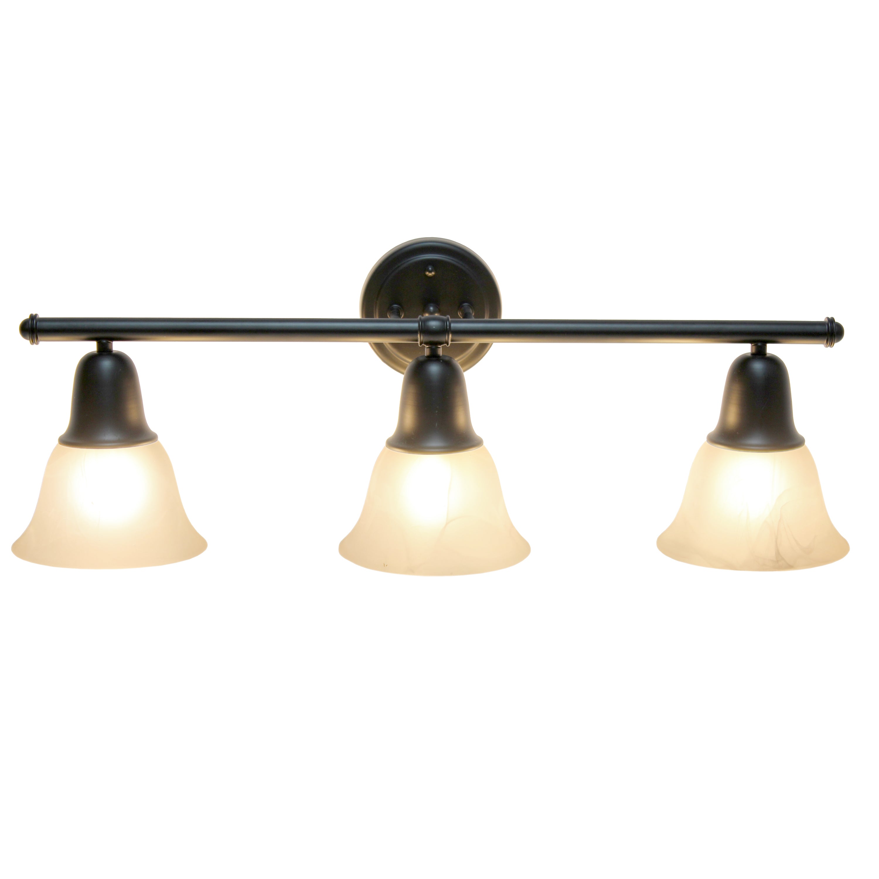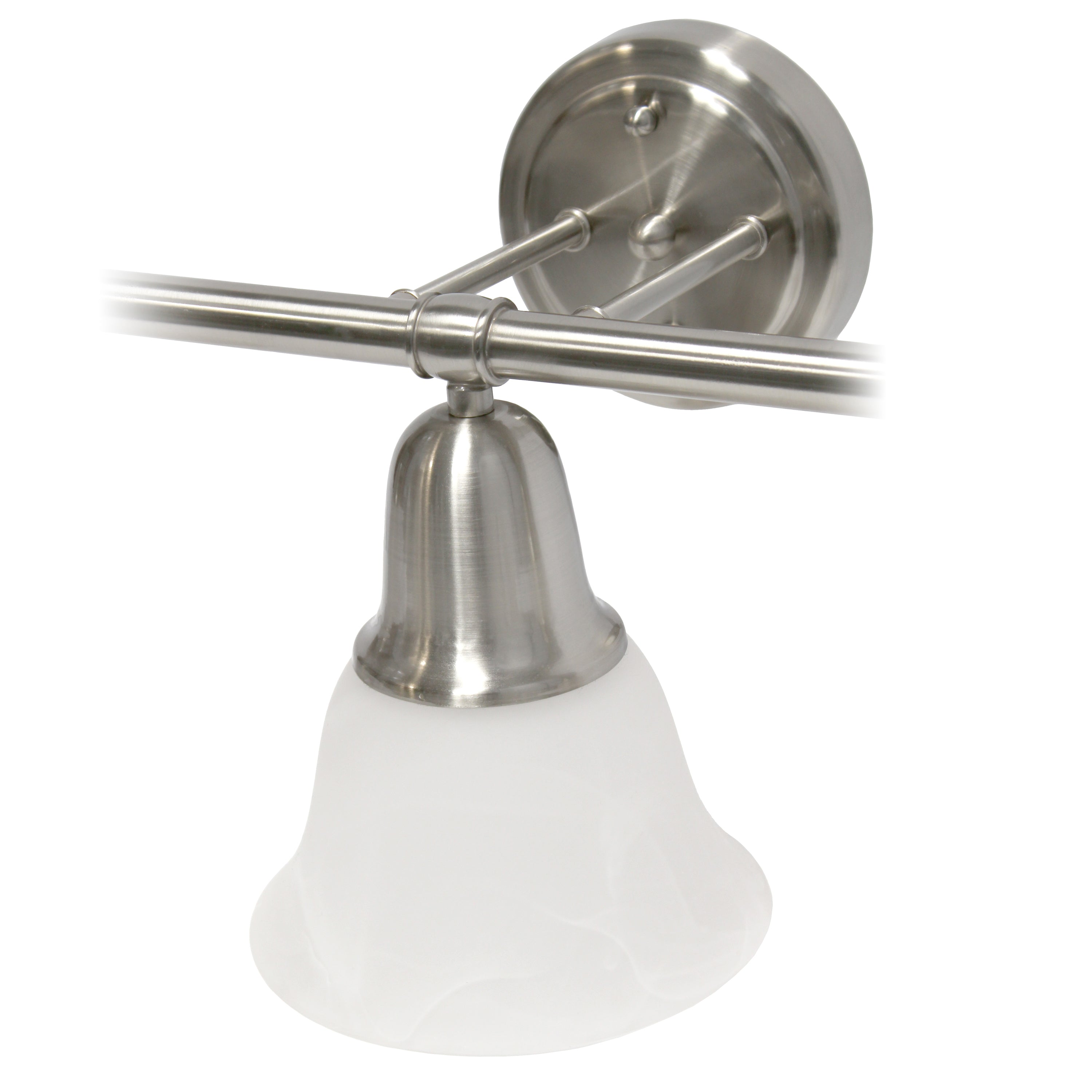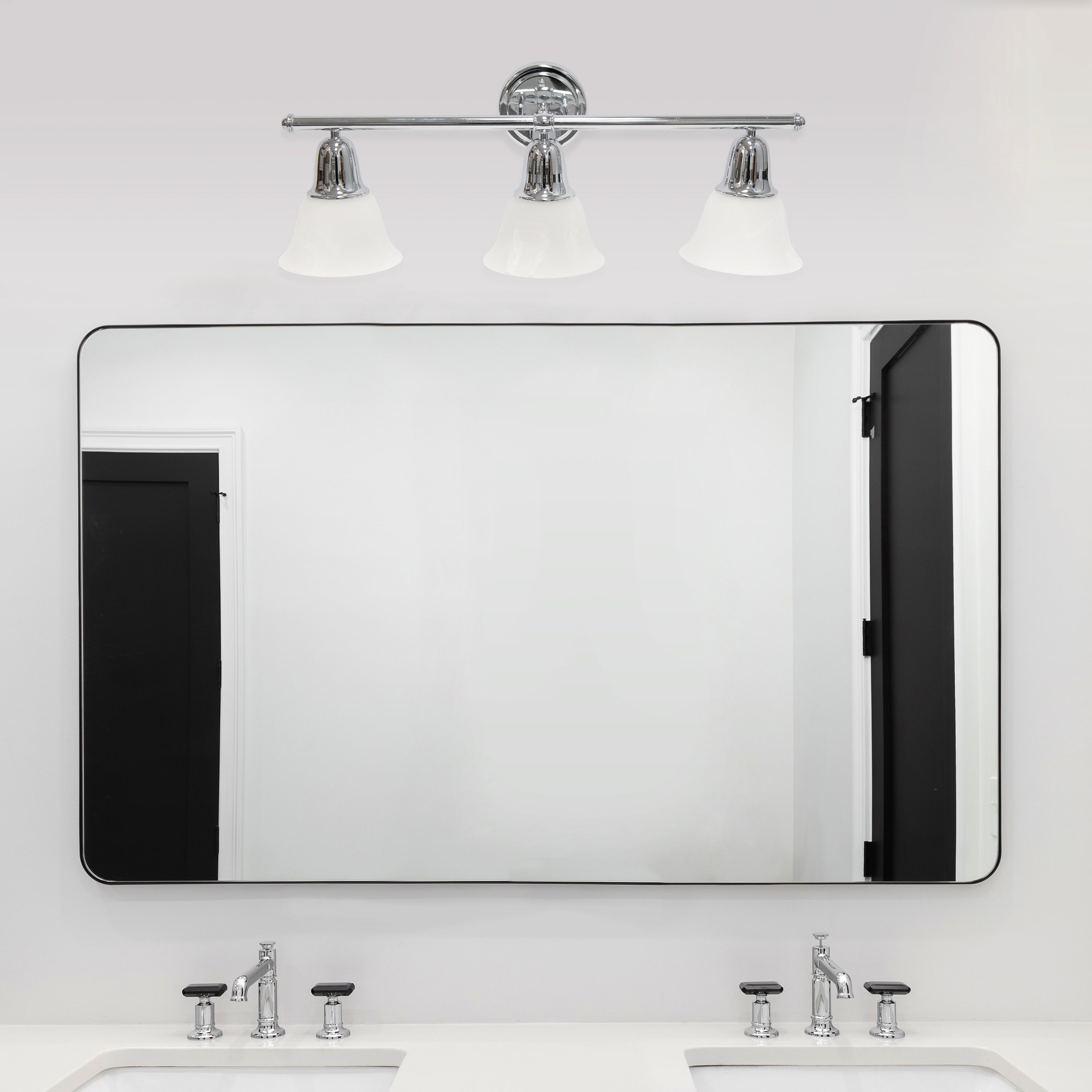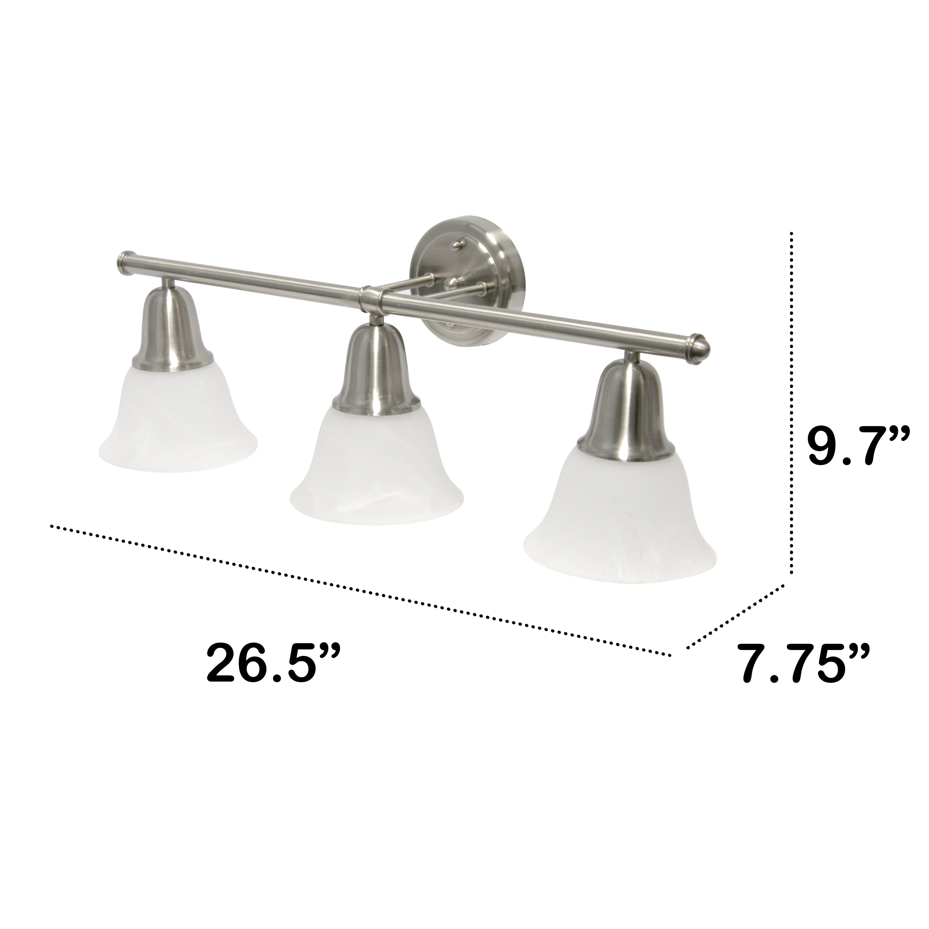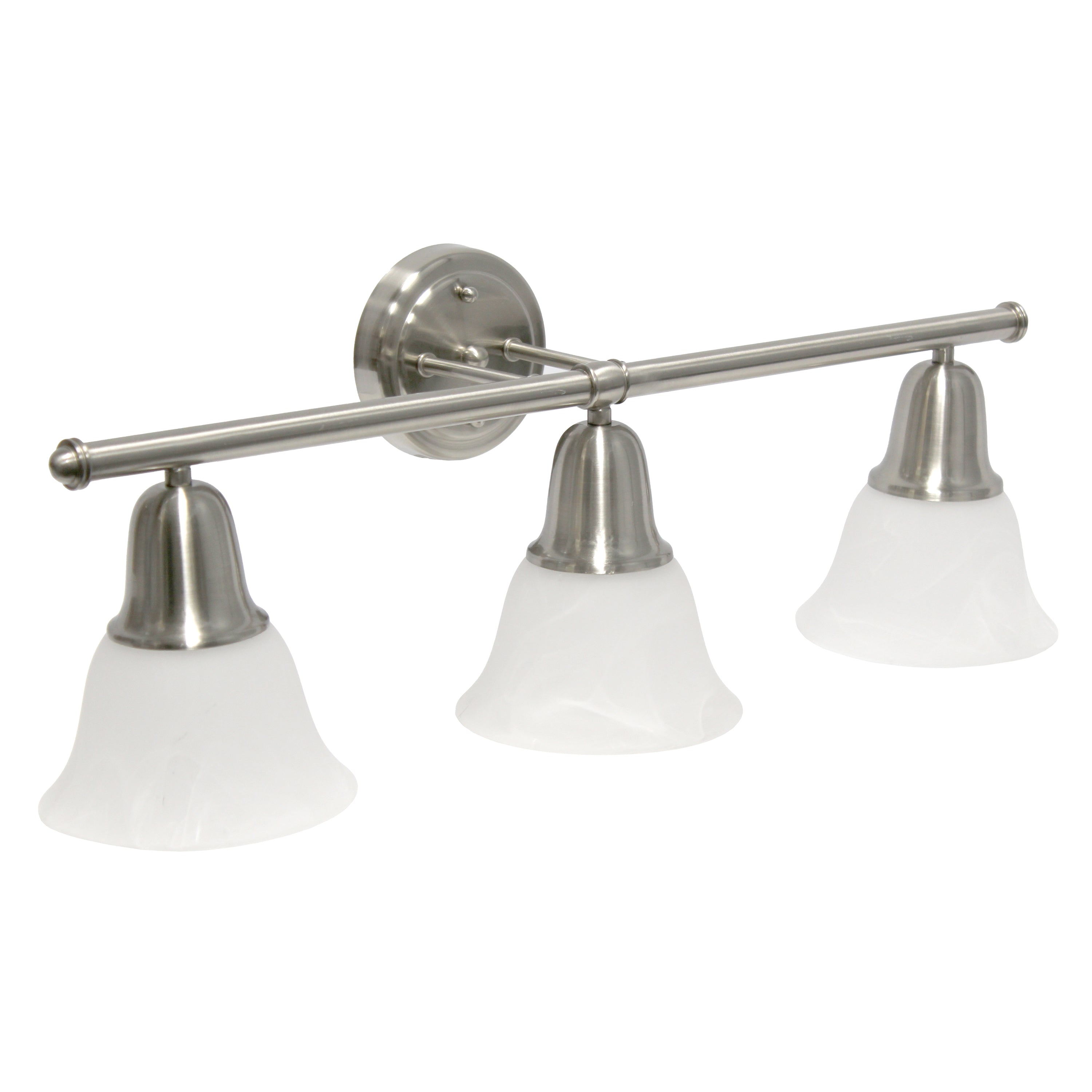 This lovely three light vanity fixture has been carefully designed to serve both your lighting and decor needs in a sophisticated and contemporary manner. Three identical alabaster white shades are held in place on a straight metal bar by matching metal socket holders in the finish of your choice. Perfect for your bathroom, hallway, bedroom, foyer, or above your vanity!